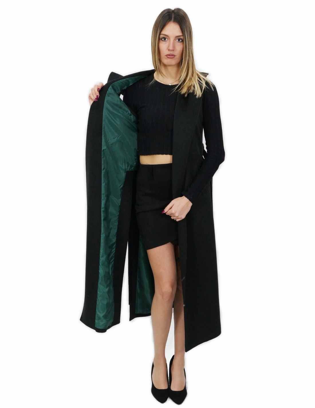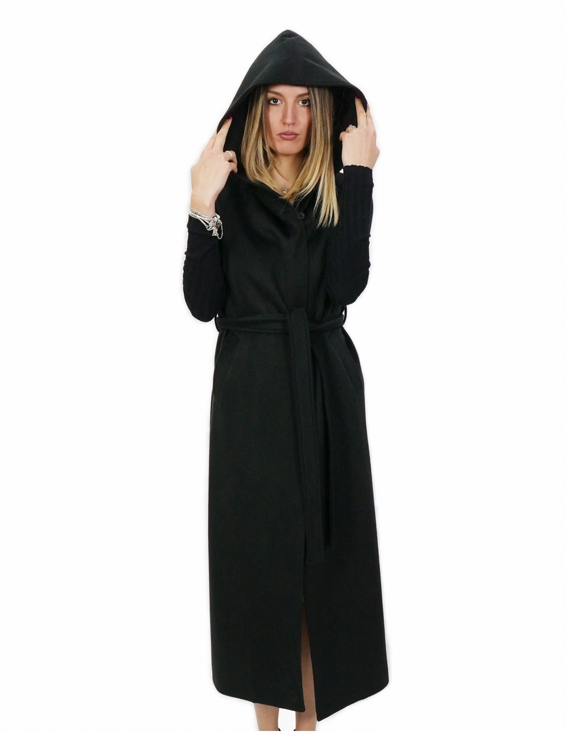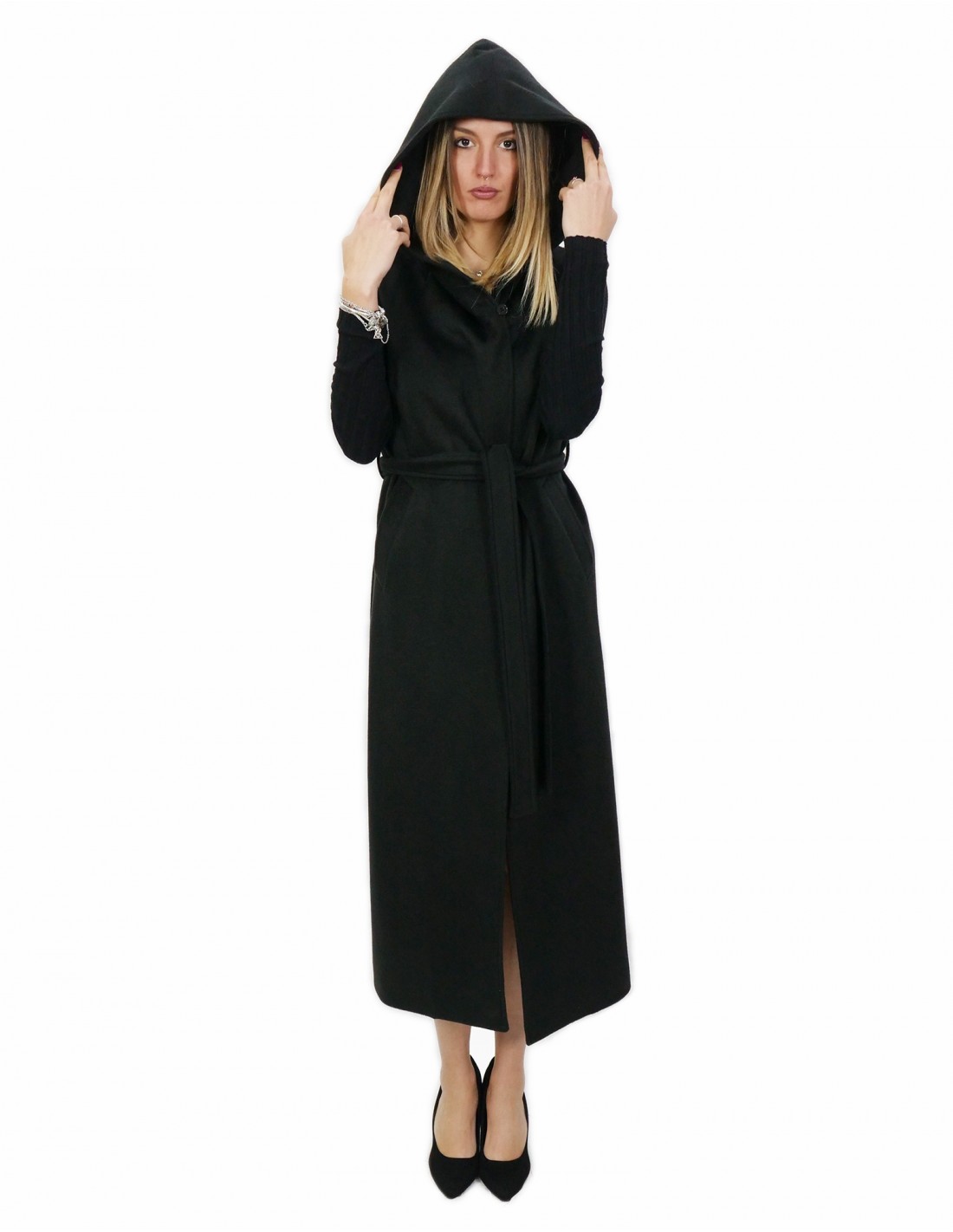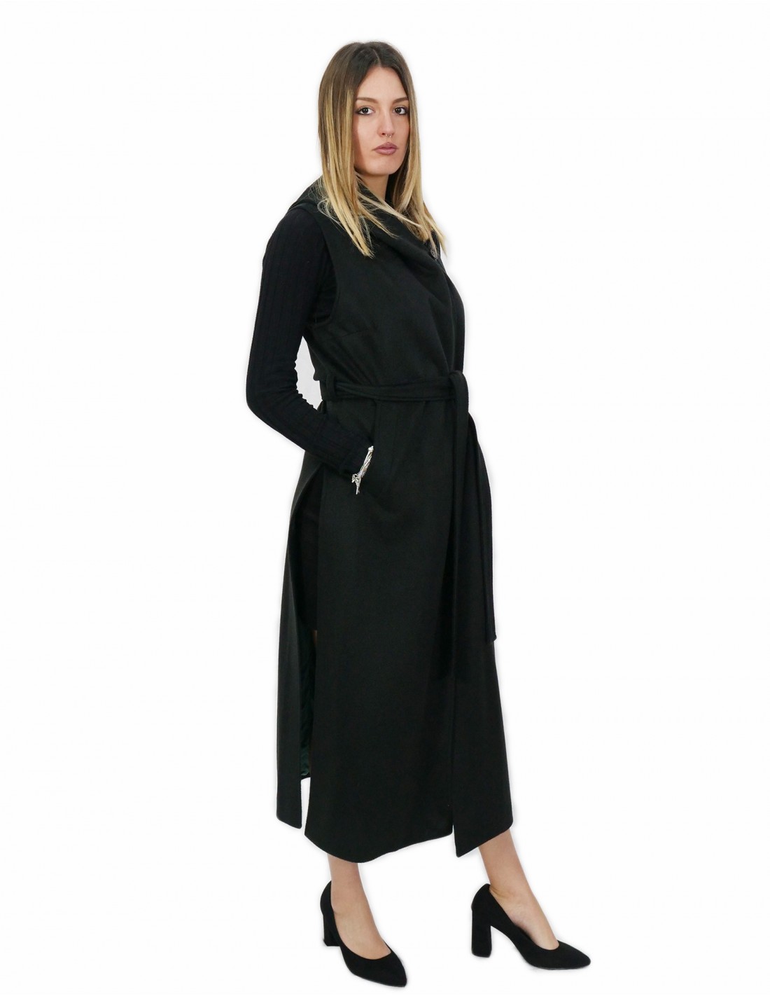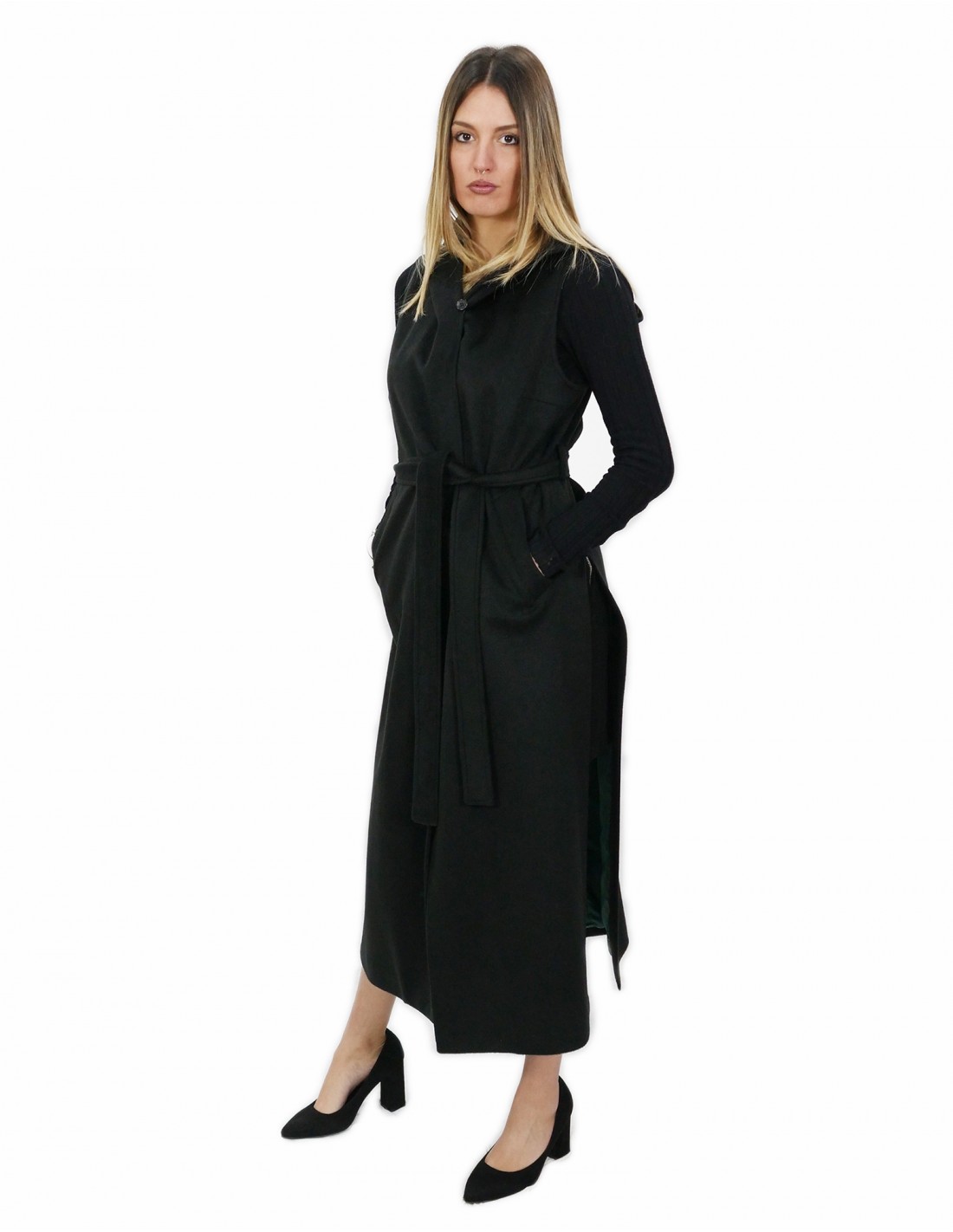 Home » Shop » Long black sleeveless in cashmere 50 with hook closure belt and external pockets