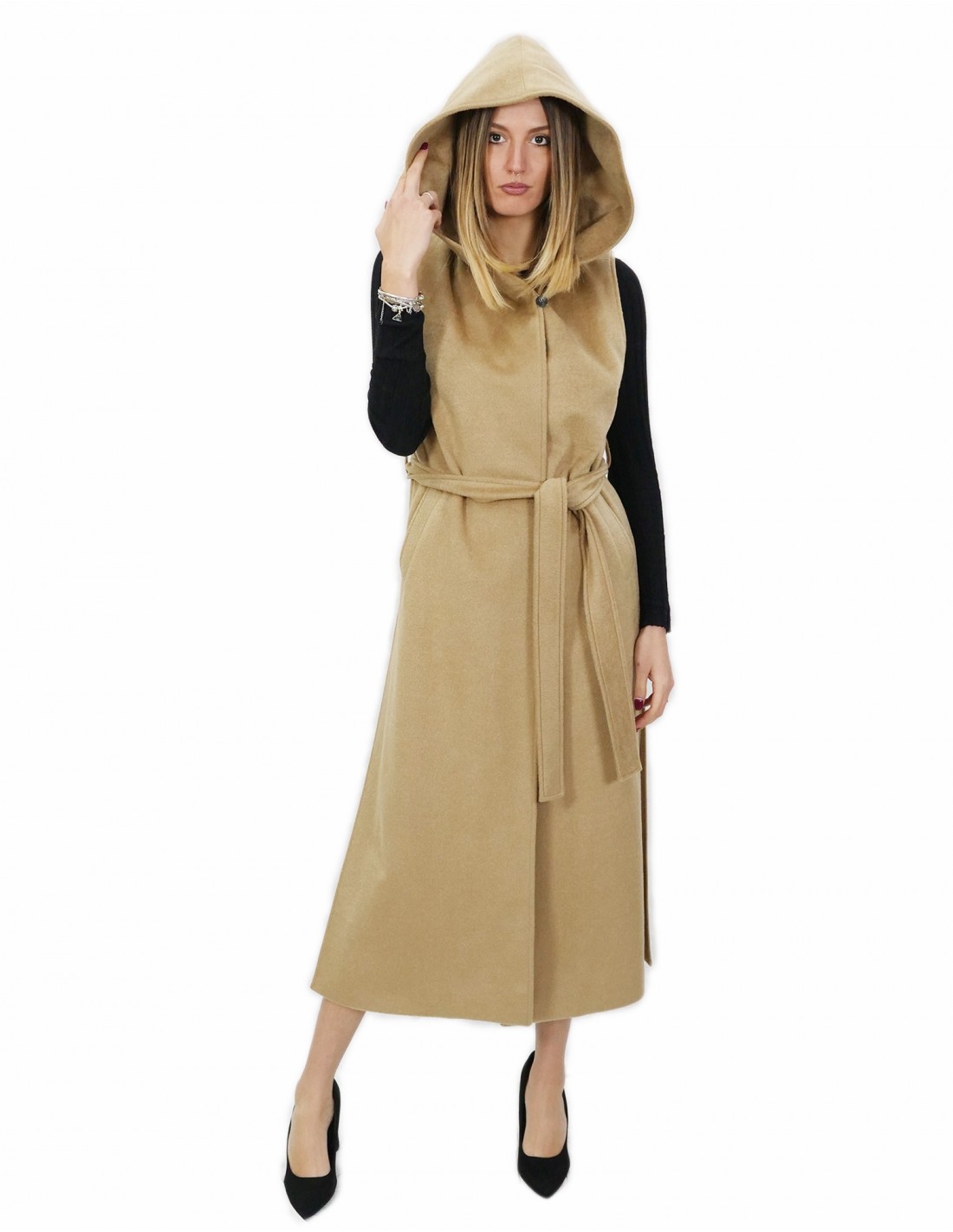Cashmere sleeveless vest. Our cashmere furs are productions made in our laboratories, therefore a unique and exclusive cashmere coat. The possibility of producing our highest quality furs allows us to make proposals at different prices with various opportunities at low prices that are always available. Furthermore, our laboratories and our collaborations guarantee a fur of undisputed quality that is 100% made in Italy. The quality of cashmere wool fur used for this is a jacket with InModa Pellicceria branded leathers. The cashmere coat looks like a sleeveless gilet, over the knee length, with external pockets and cashmere hood, in camel colour.