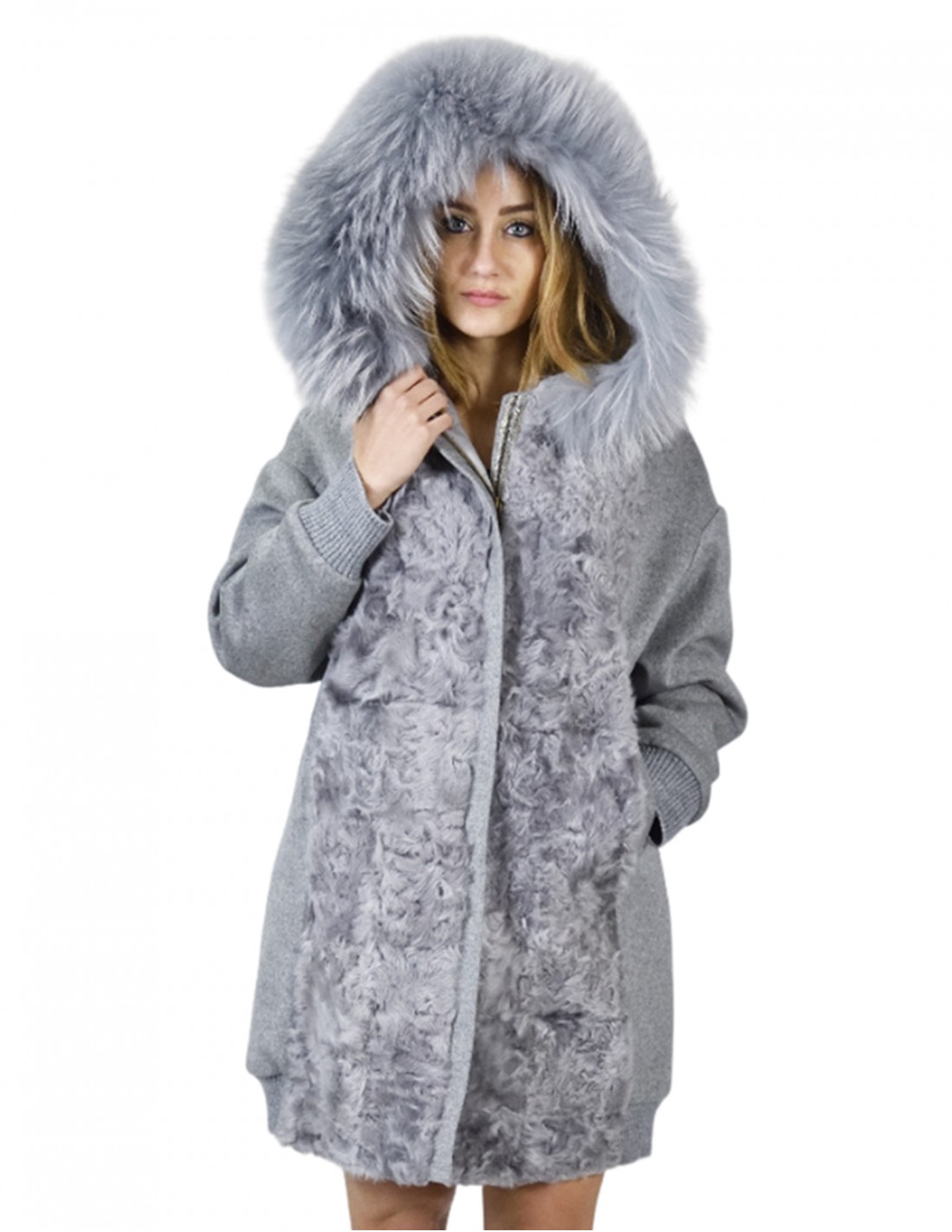 Wool coat with Persian fur on the front and fox fur hood edge. Our wool furs are productions made in our laboratories, therefore a unique and exclusive wool coat. The possibility of producing our furs of the highest quality allows us to make proposals at different prices with various opportunities at low prices always available. Furthermore, our laboratories and our collaborations guarantee fur of undisputed quality, 100% made in Italy. The quality of wool fur used for this is a jacket with leathers signed InModa Pellicceria. The wool coat comes with external pockets, the front part in Persian fur and wool hood with fox fur trim, long sleeves with elastic at the wrists and on the bottom of the coat, all in the gray sapphire colour.