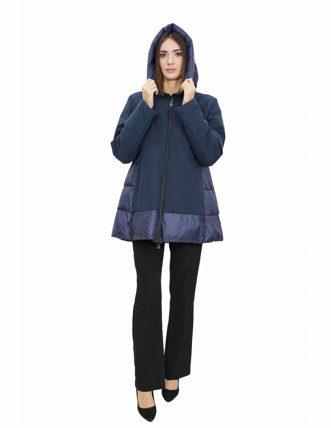 Down jacket 78 centimeters long, with hood collar, zip fastening, external zip pockets, all in blue.