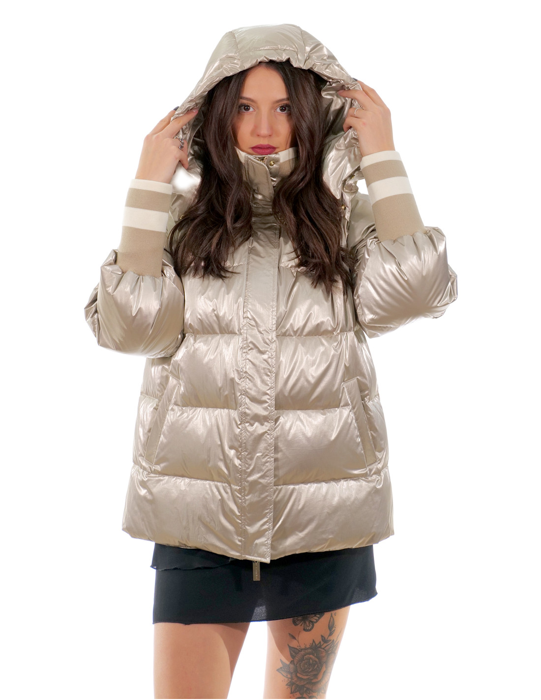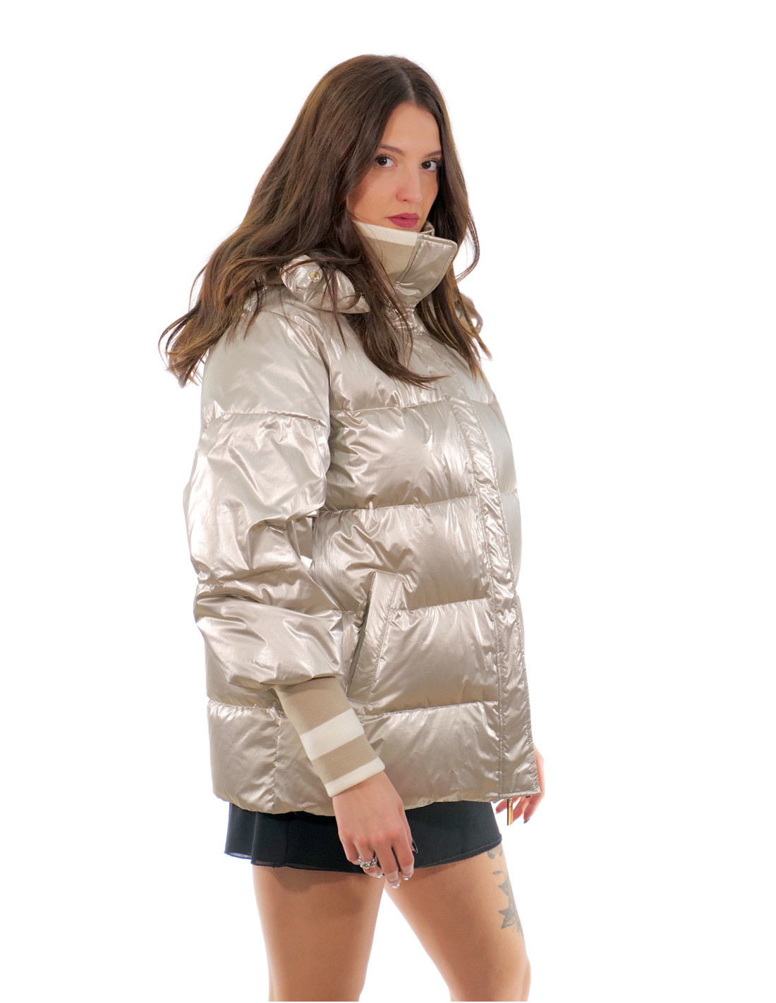 Down jacket with detachable hood, features external pockets, zip fastening with clip button cover, wool cuffs and collar and detachable hood attached with buttons and featuring a drawstring, all in champagne silver colour.