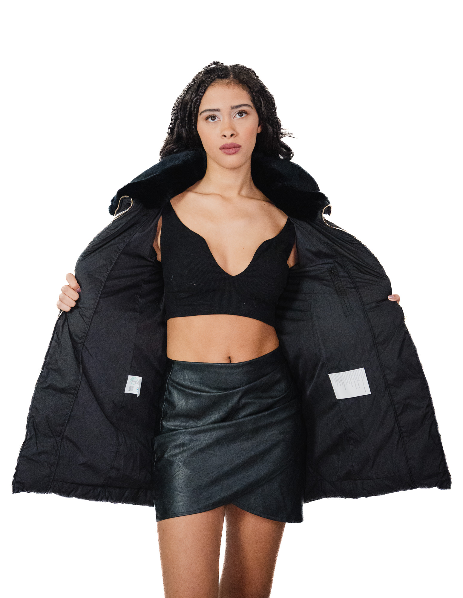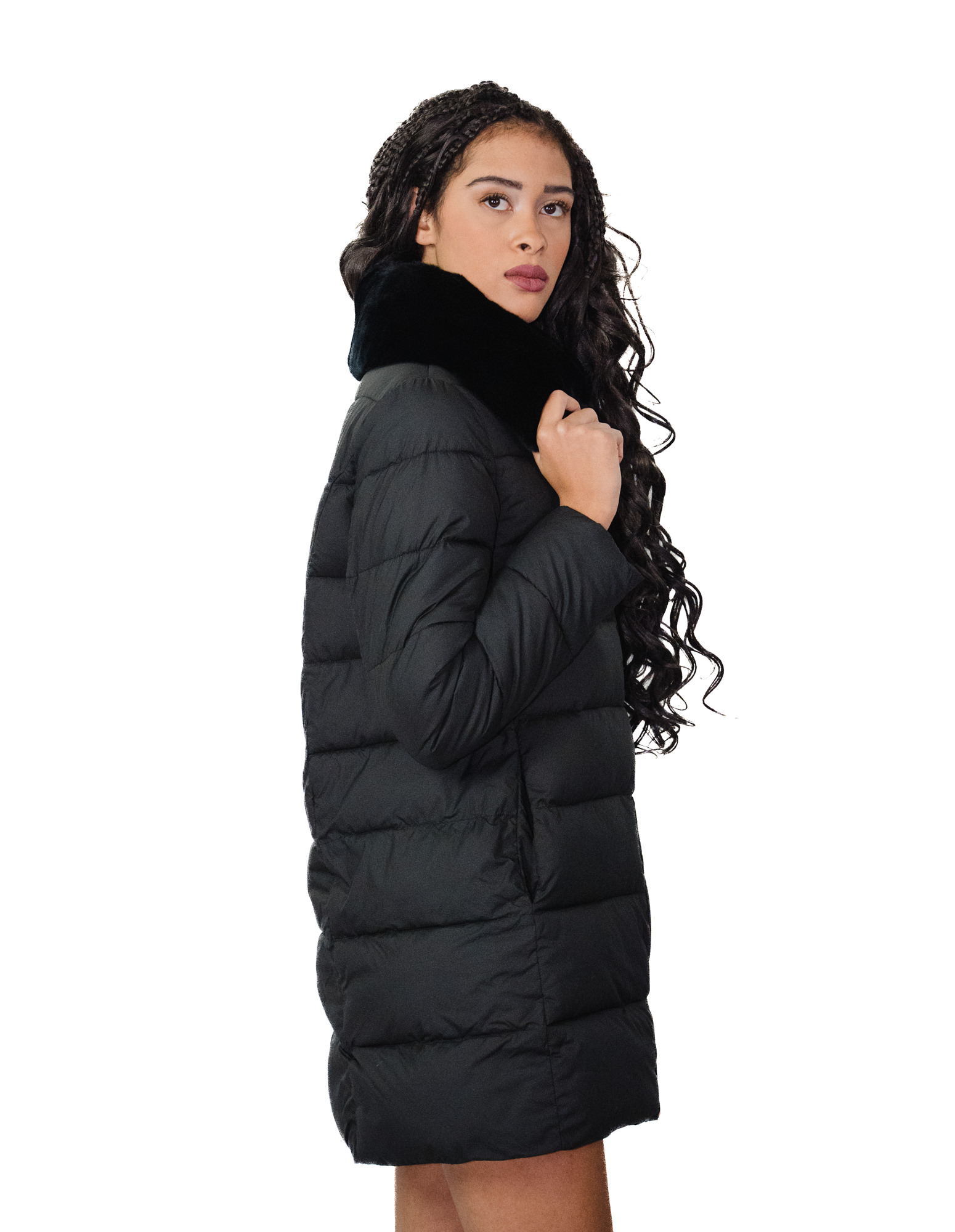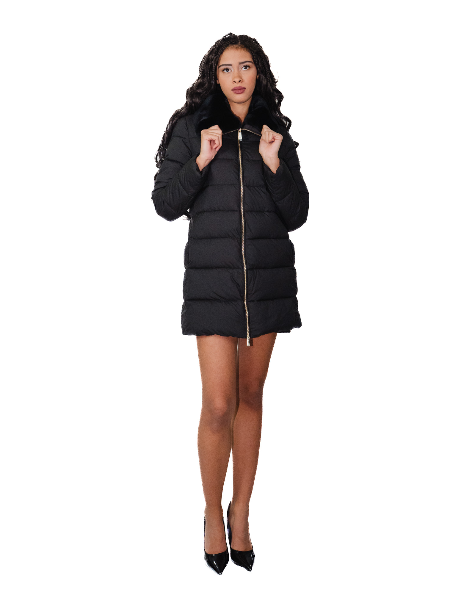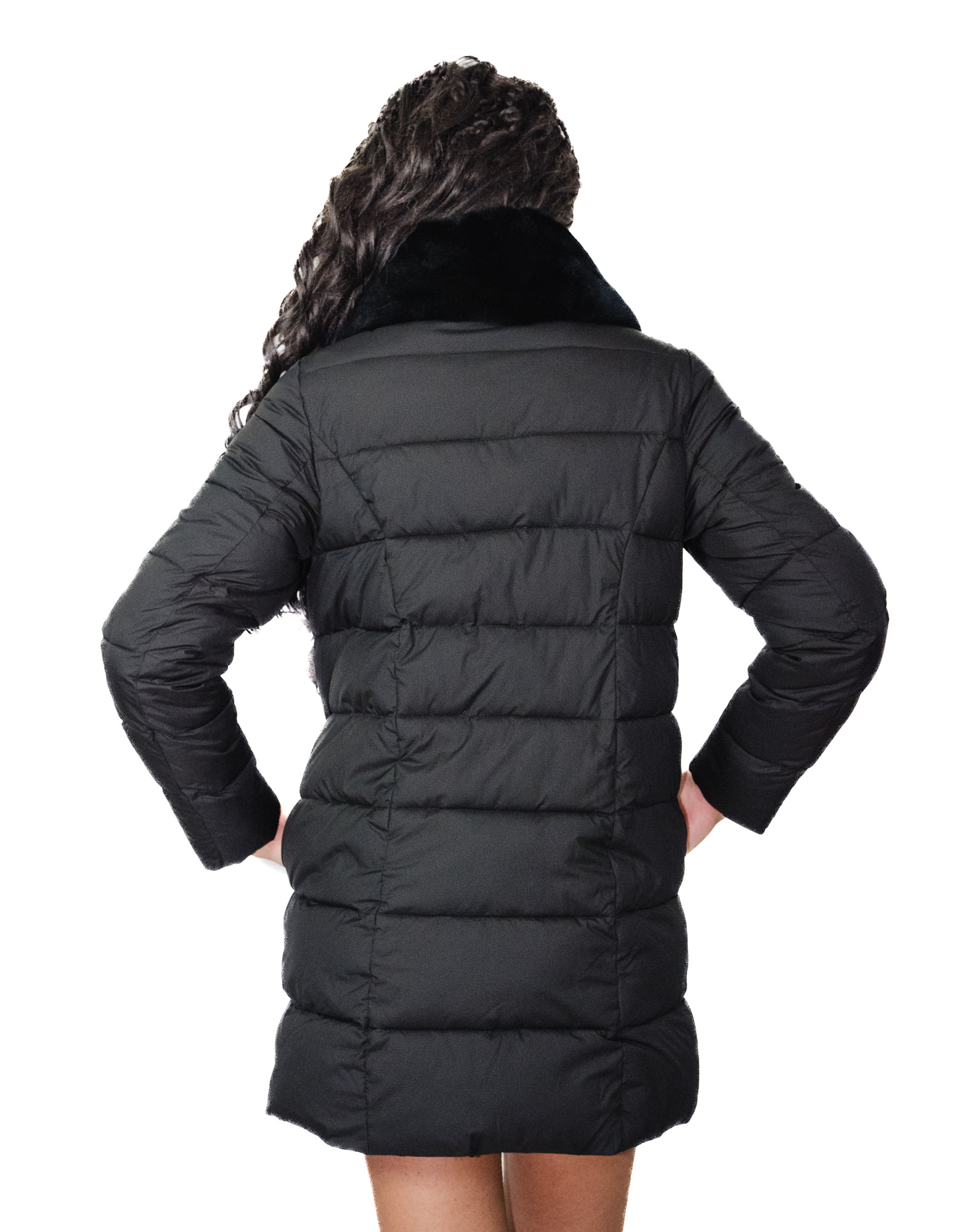 Down jacket with real rabbit fur at the collar, it features an Italian collar, 84 centimetres long, long sleeves, light padding, external pockets and an internal pocket with zip closure and central zip closure, all in black.