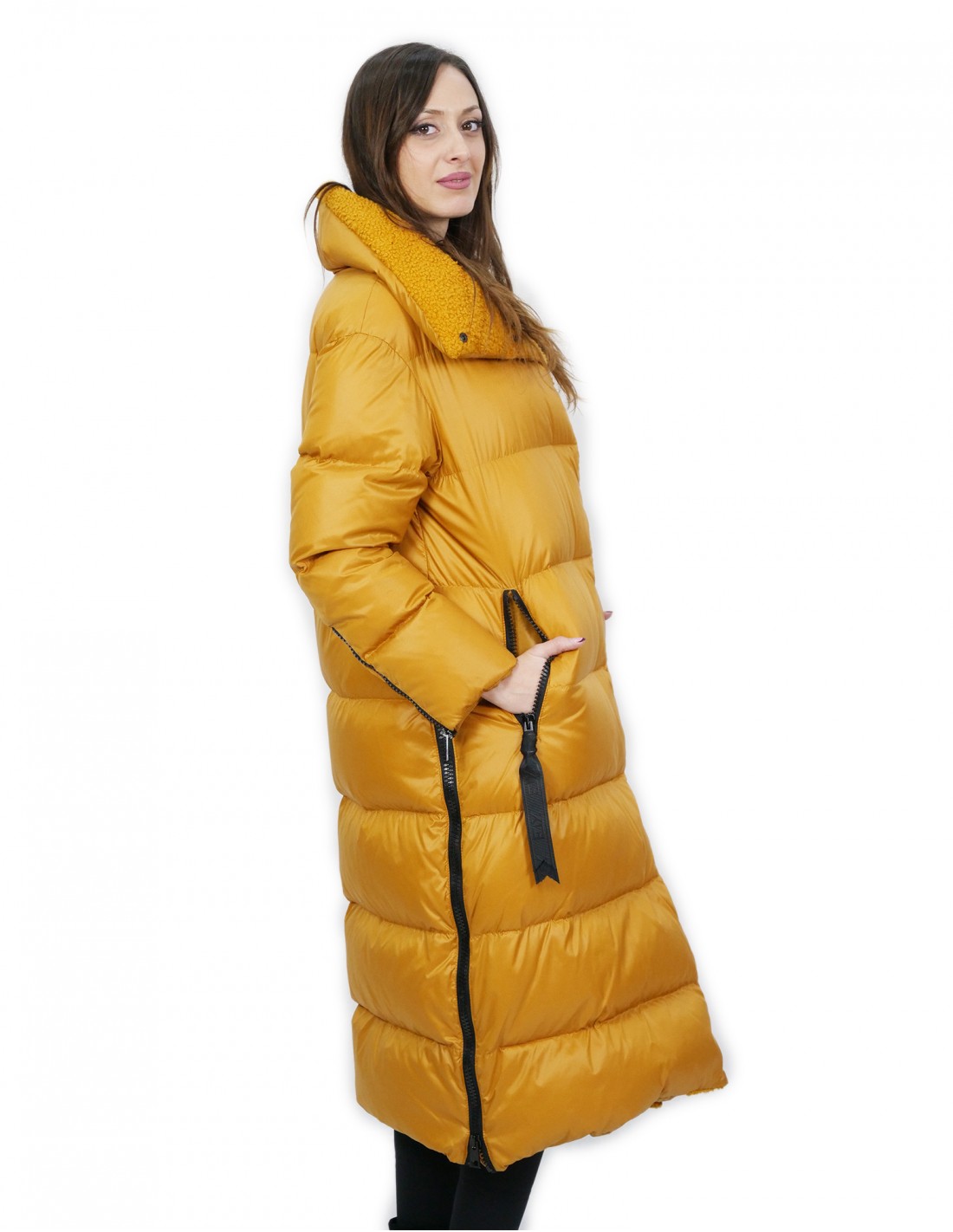 Down coat 112 centimeters long, filled with goose down, with the collar featuring a fabric with wool-like curls, side zips to open the down jacket at the bottom up to the pelvis and zips at the end of the sleeves, external zip pockets, closure with zip and clip buttons, all in yellow.