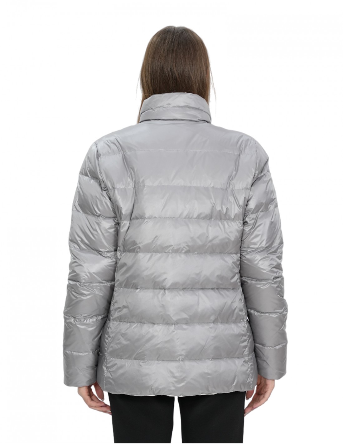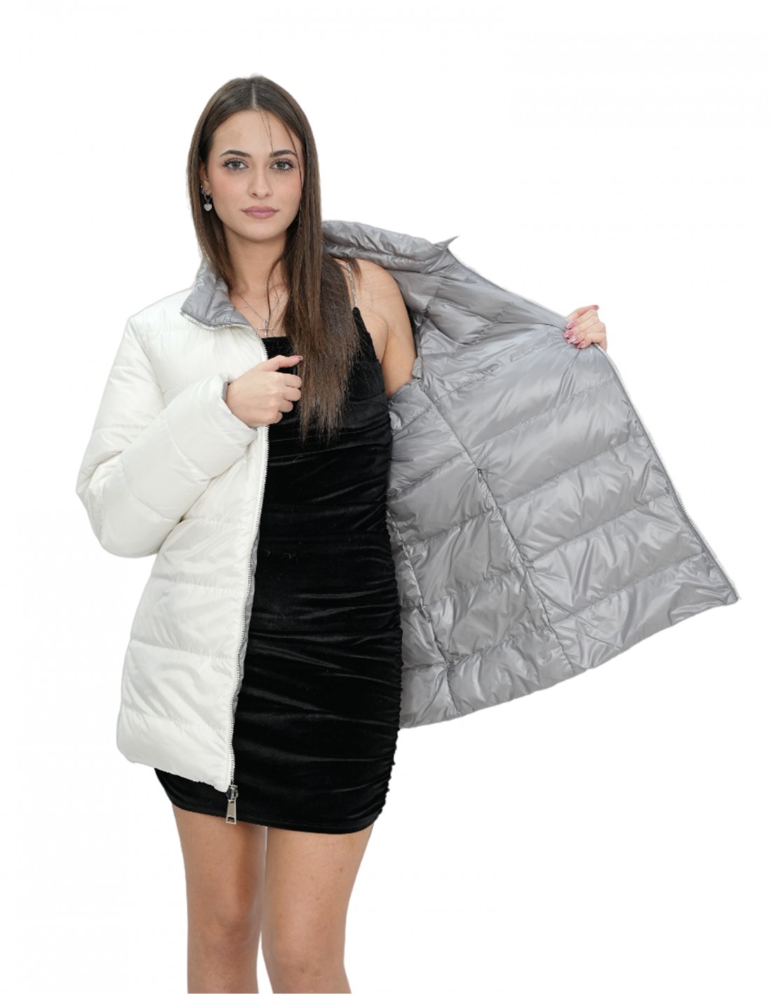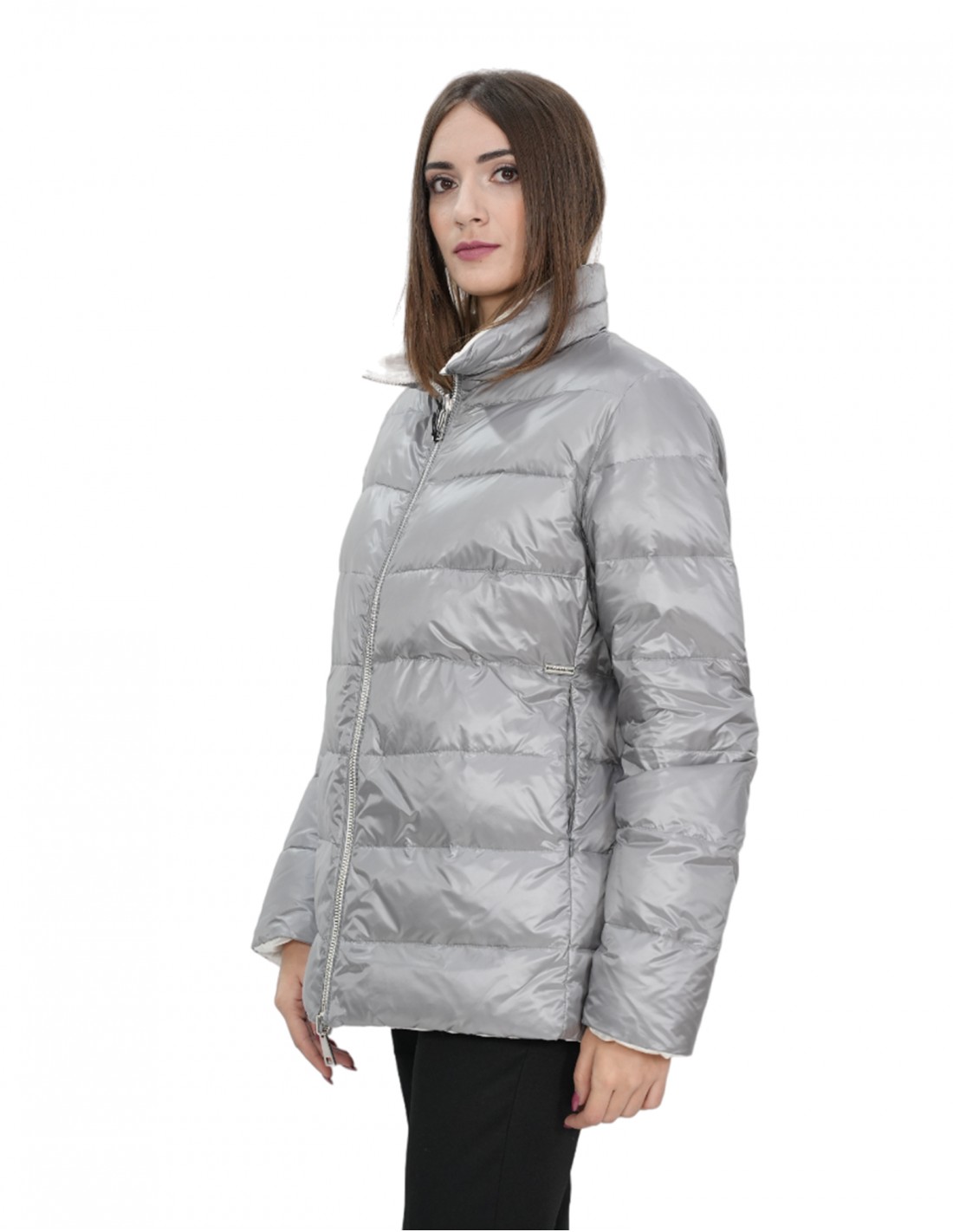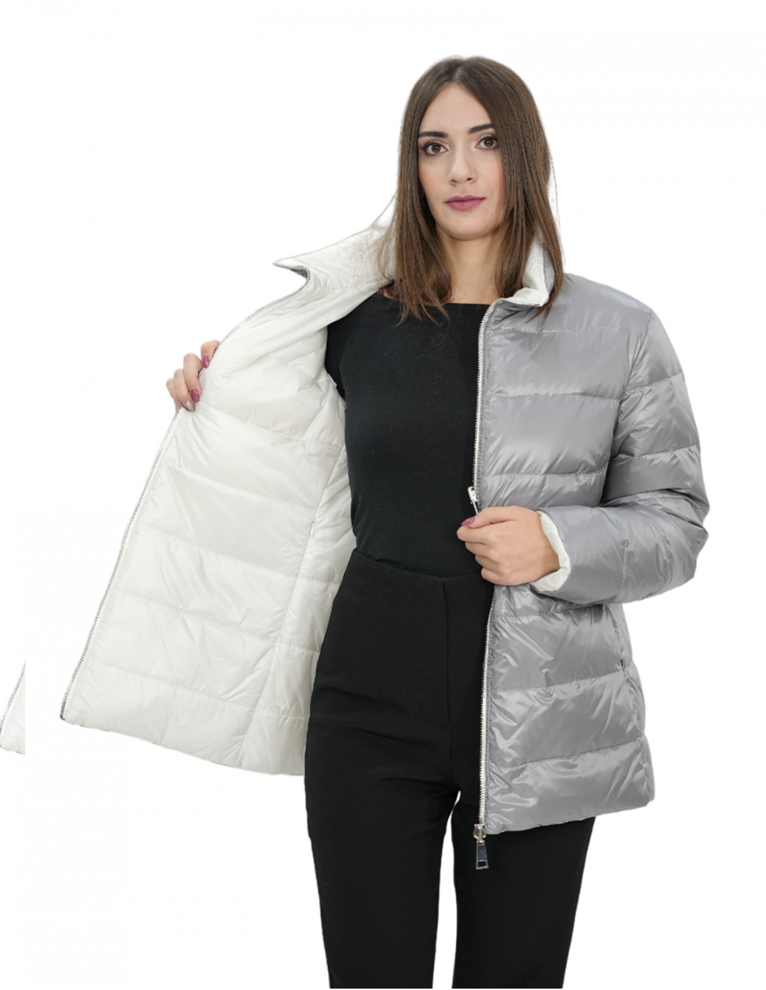 Short reversible down jacket in real down on one side in gray and on the other in white as shown in the photo. It features invisible external pockets with zip, long sleeves, zip closure.