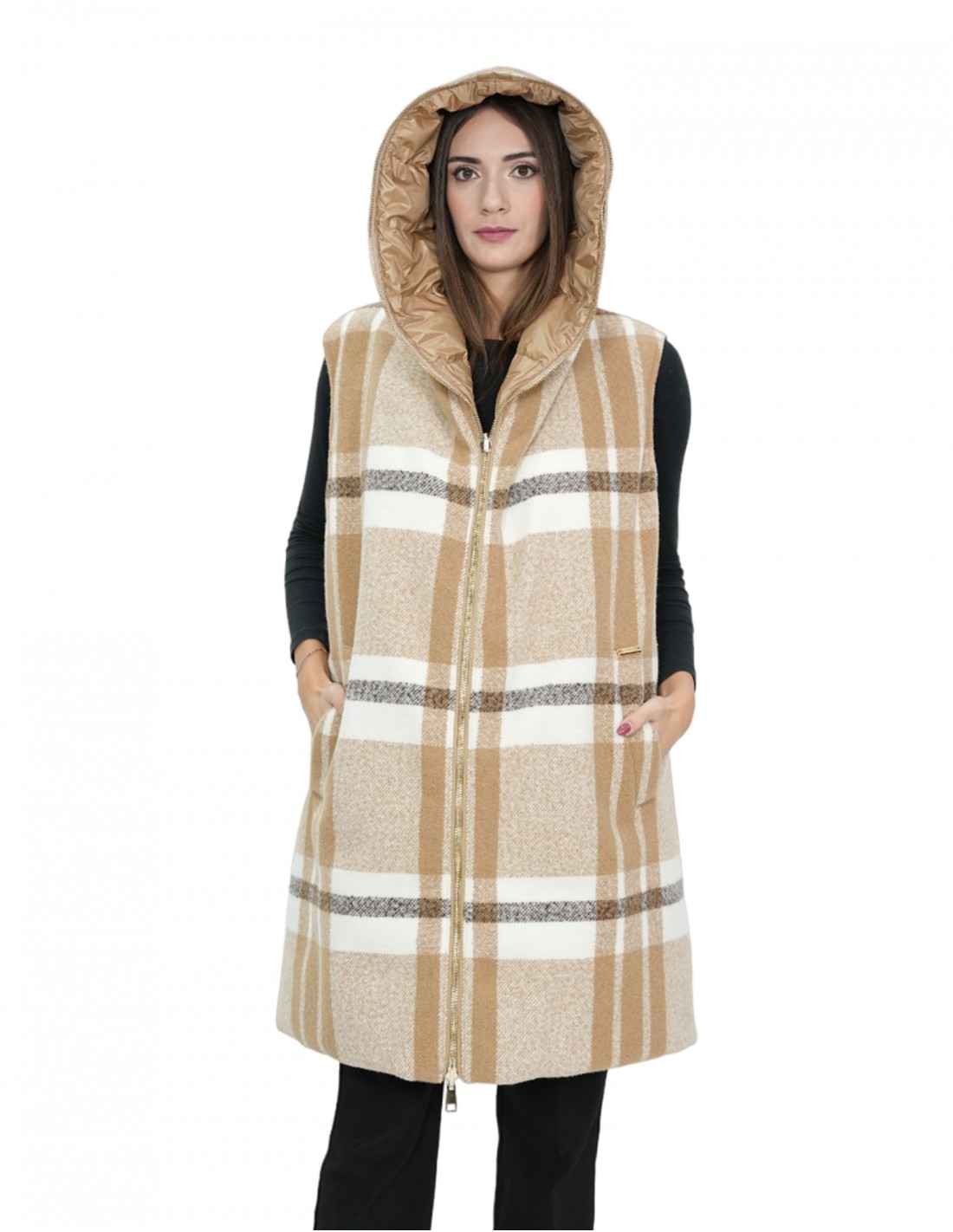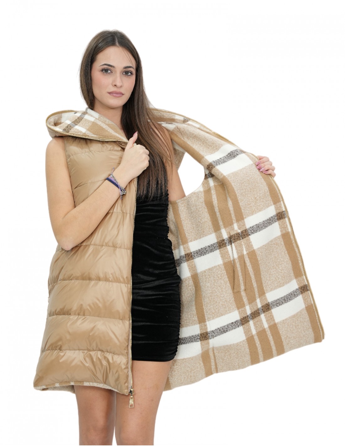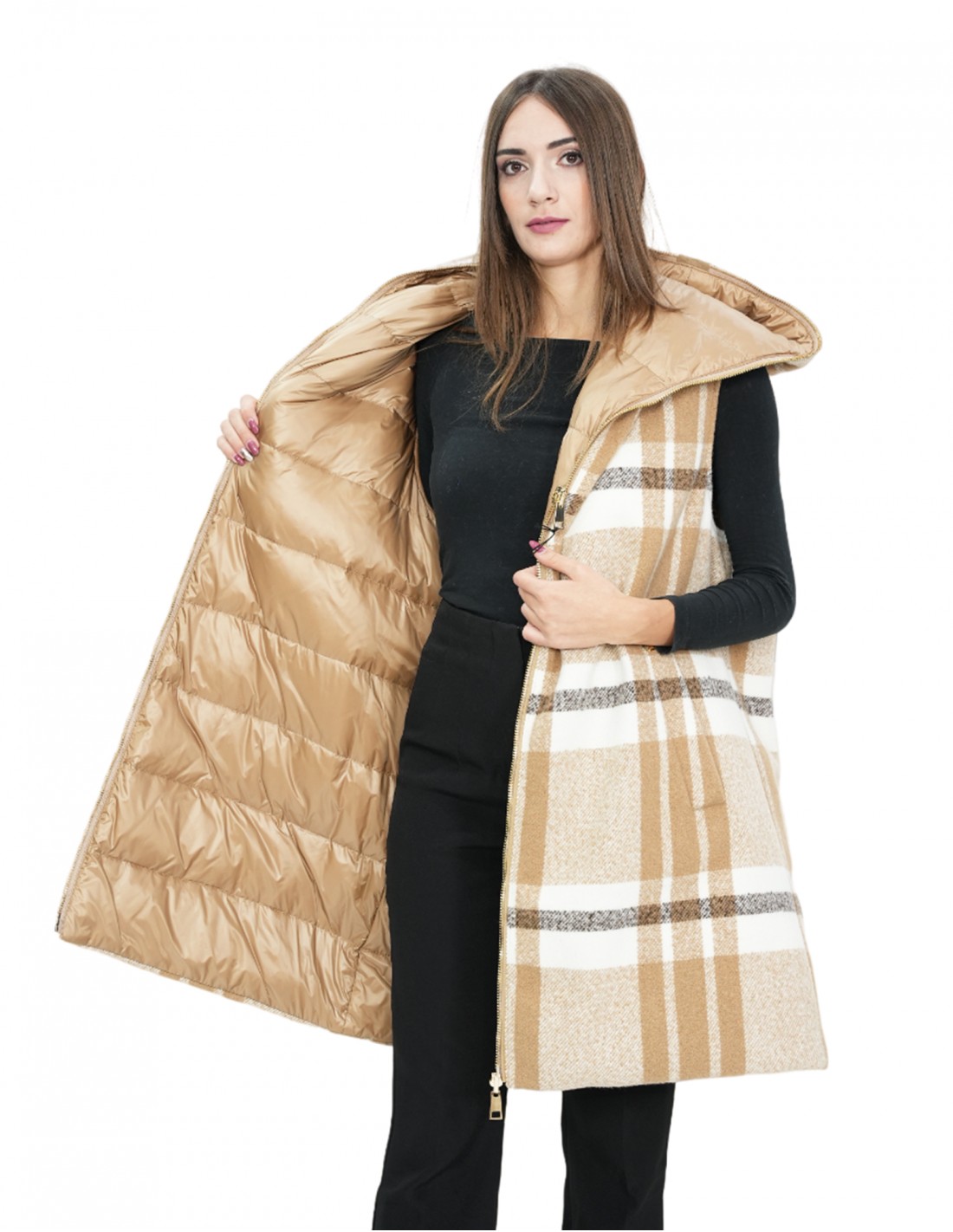 Sleeveless vest in wool and down, features a decorative zip that rises above the hood, edging it, external pockets measuring 92 centimeters long. The vest is reversible with one side entirely in checked wool and the other side entirely in down, all in brown.