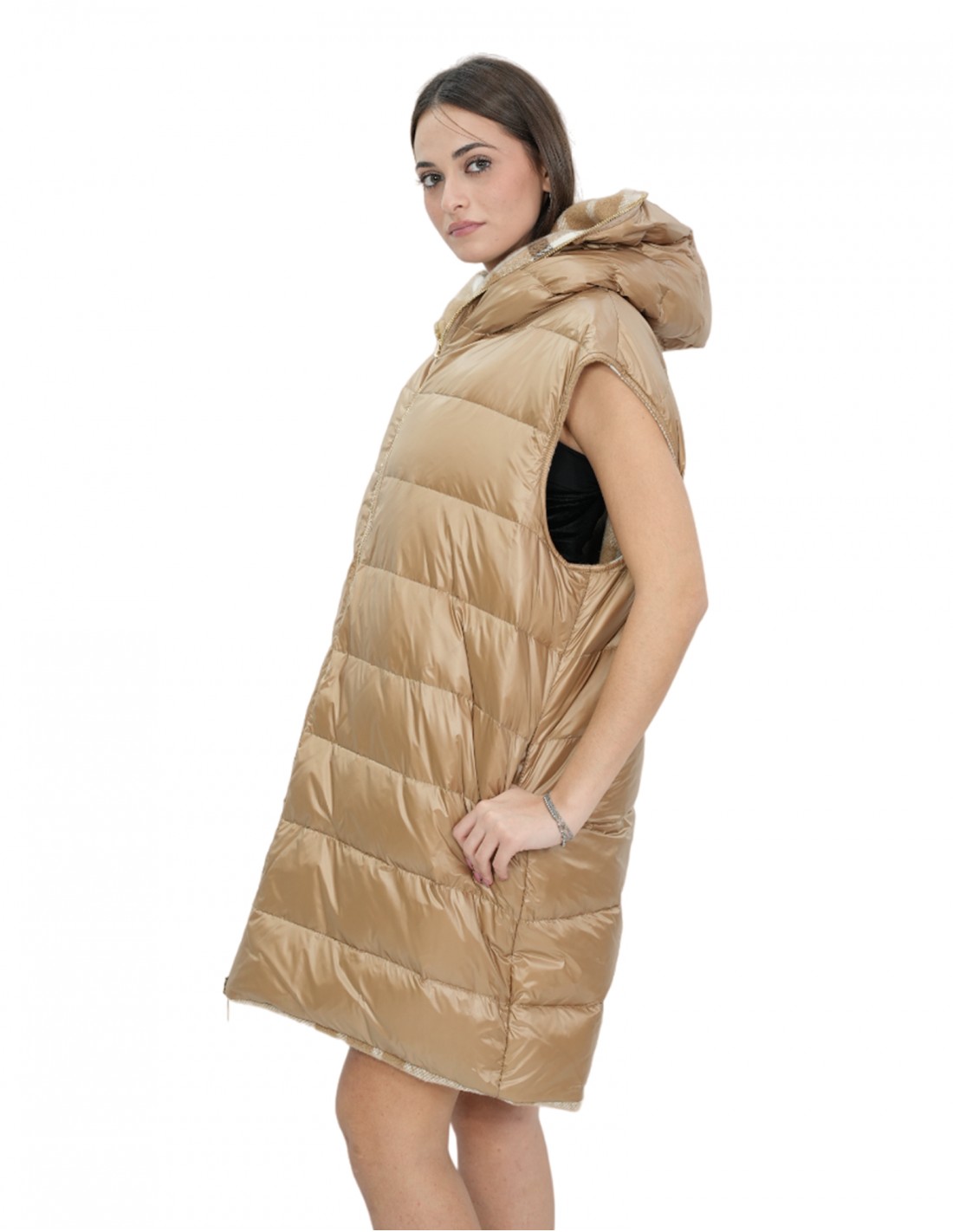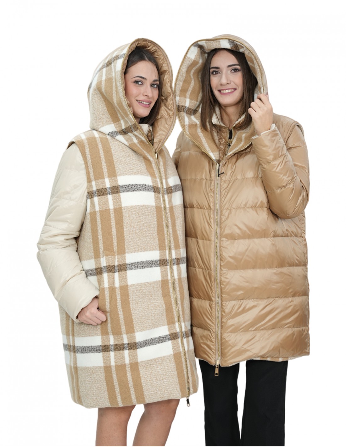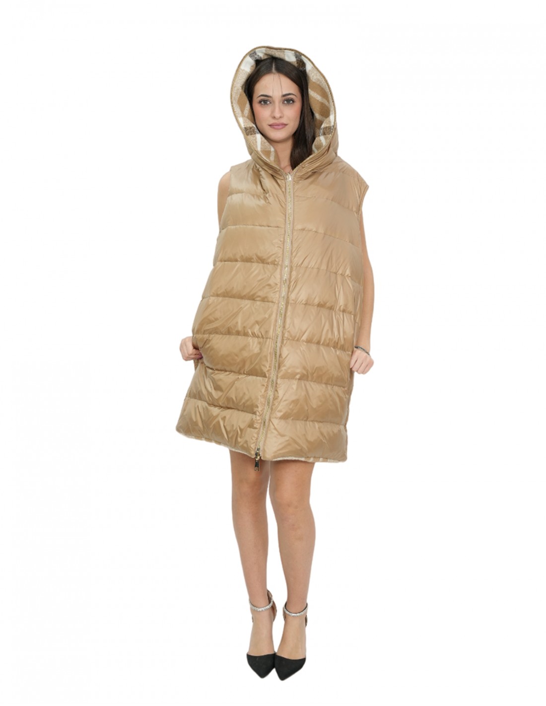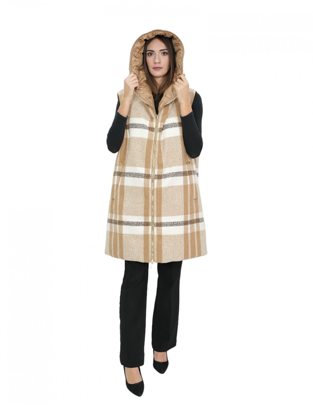 Sleeveless vest in wool and down, features a decorative zip that rises above the hood, edging it, external pockets measuring 92 centimeters long. The vest is reversible with one side entirely in checked wool and the other side entirely in down, all in brown.