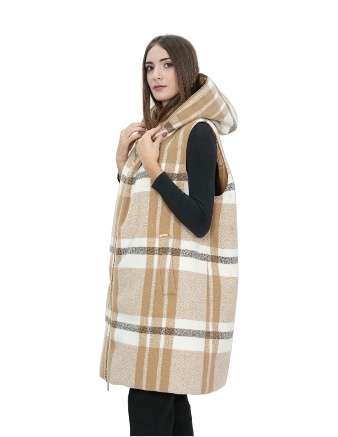 Sleeveless vest in wool and down, features a decorative zip that rises above the hood, edging it, external pockets measuring 92 centimeters long. The vest is reversible with one side entirely in checked wool and the other side entirely in down, all in brown.