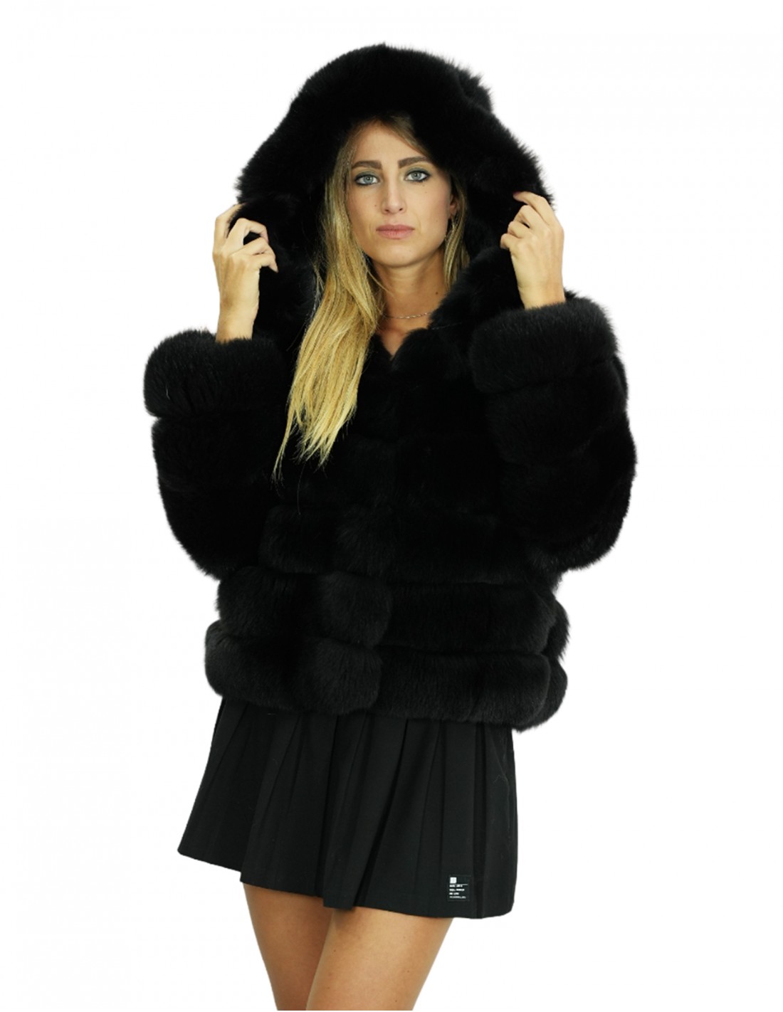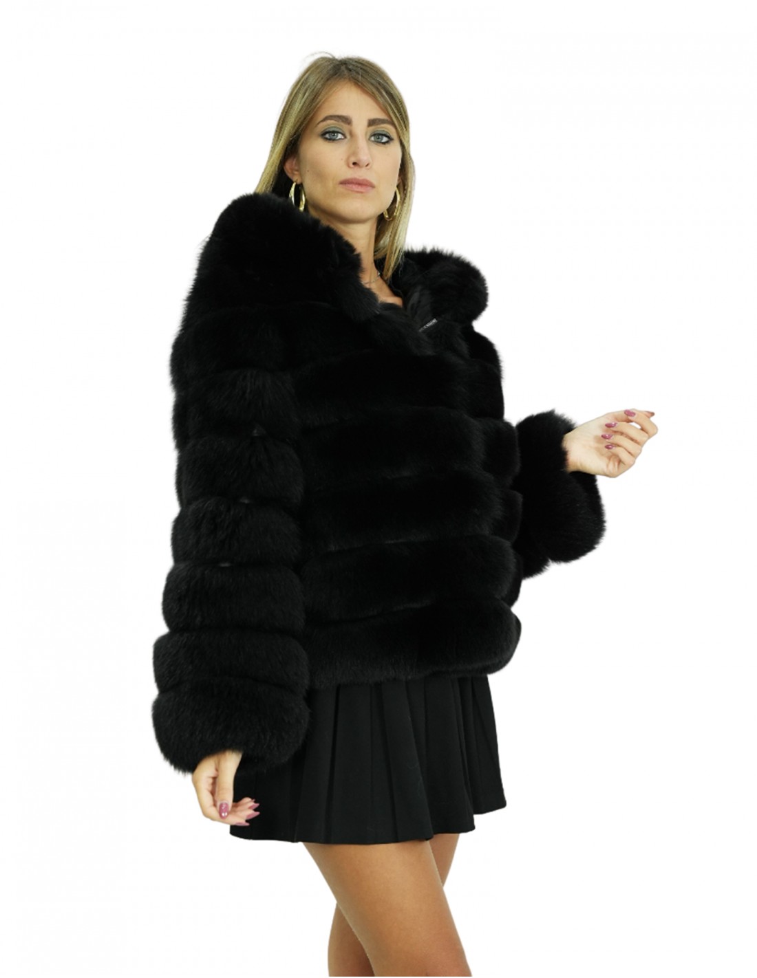 Full-skin fox fur jacket in horizontal processing with fox leather-lined hood. Our fox furs are productions made in our laboratories, therefore a unique and exclusive fox jacket. The possibility of producing our furs of the highest quality allows us to make proposals at different prices with various opportunities at low prices always available. Furthermore, our laboratories and our collaborations guarantee fox fur of undisputed quality, 100% made in Italy. The quality of fox fur used for this is a fox fur jacket with Saga furs signature skins. The fox fur jacket features horizontal processing, external pockets, internal hook closure, long sleeves and fox fur-lined hood, with horizontal processing, all in black.