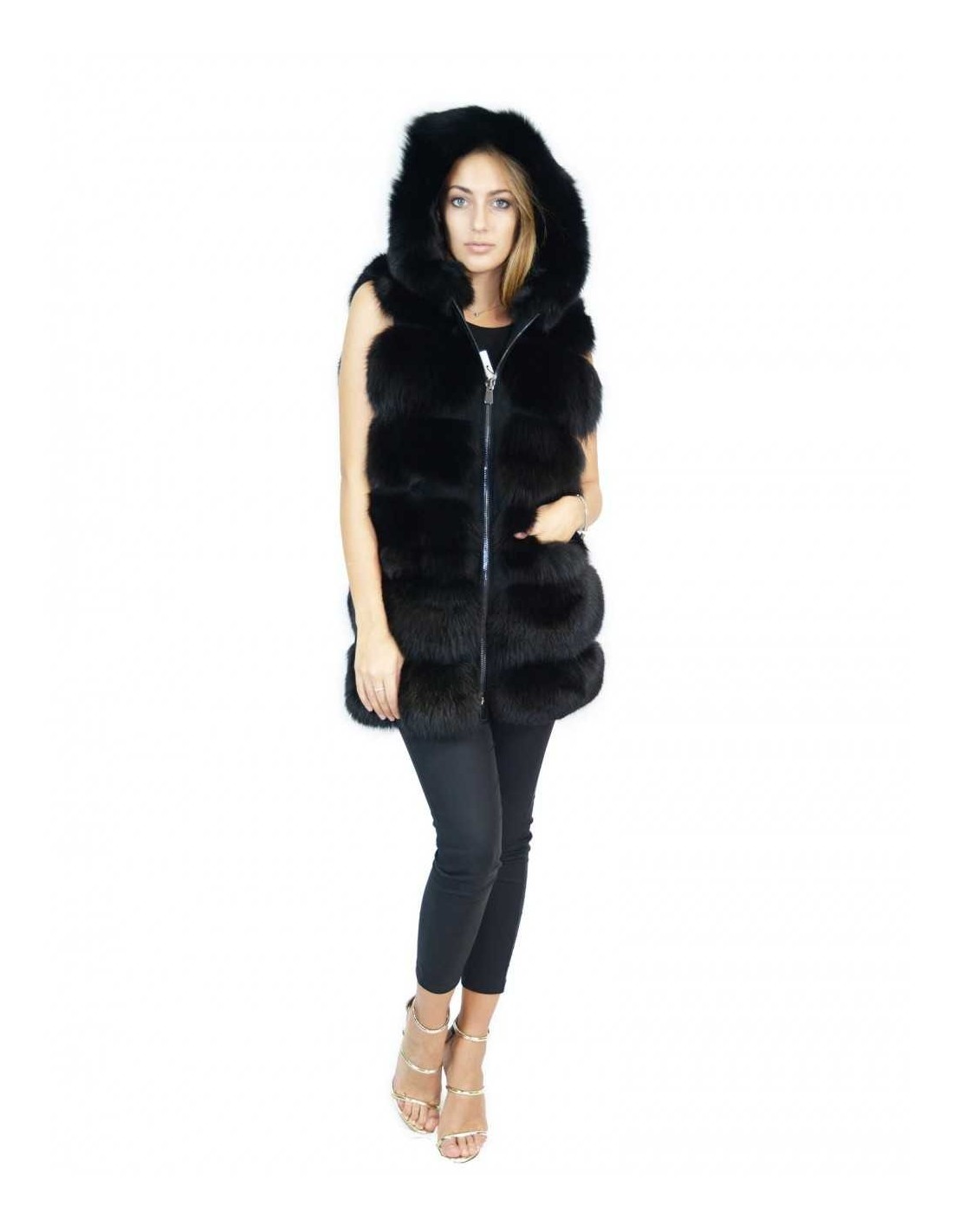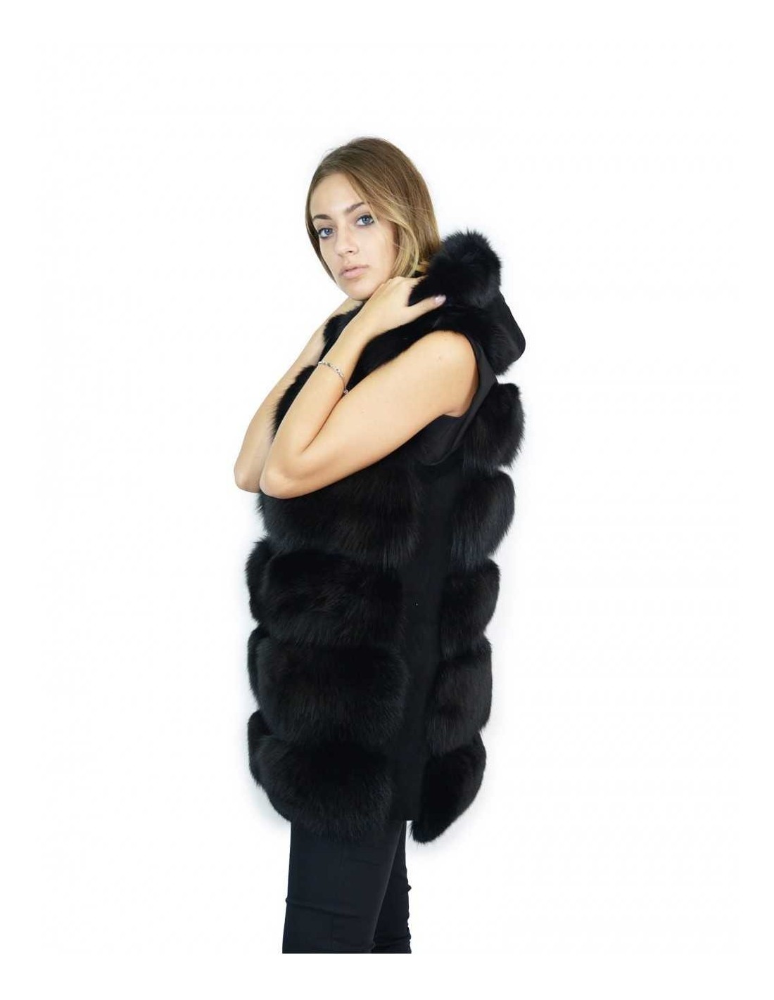 Black fox fur vest with 50 suede inserts and Fuchs renard fox hood