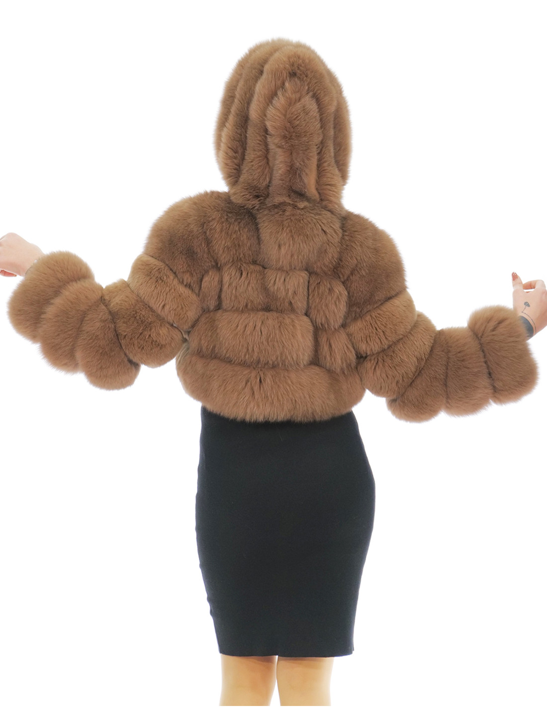Brown fox fur short jacket 44 long sleeve hood closure hooks