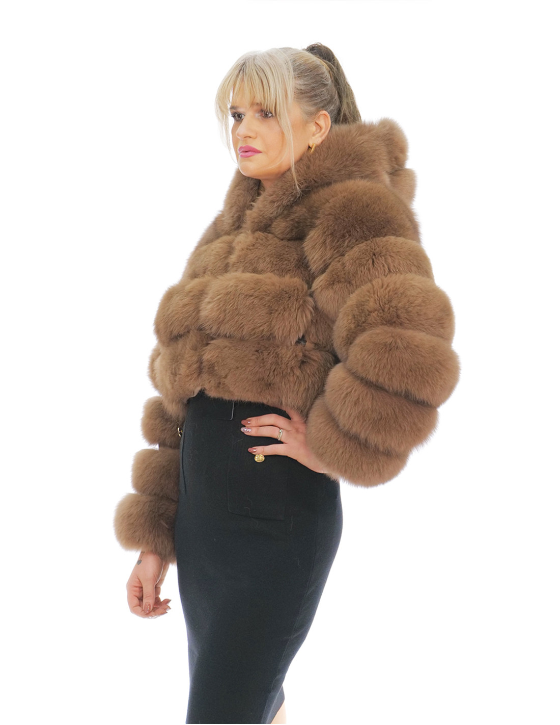 Fox fur jacket with whole skins in horizontal workmanship. Our fox furs are productions made in our laboratories, therefore a unique and exclusive fox jacket. The possibility of producing our furs of the highest quality allows us to make proposals at different prices with various occasions at low prices always available. Furthermore, our laboratories and our collaborations guarantee a fox fur of undisputed quality 100% made in Italy. The quality of fox fur used for this is a fox fur jacket with skins signed InModa Pellicceria. The fox fur jacket is presented in horizontal workmanship with real leather inserts, with external pockets, with hook closure, vaporous fox hood with lining inside, long sleeves, all in brown.