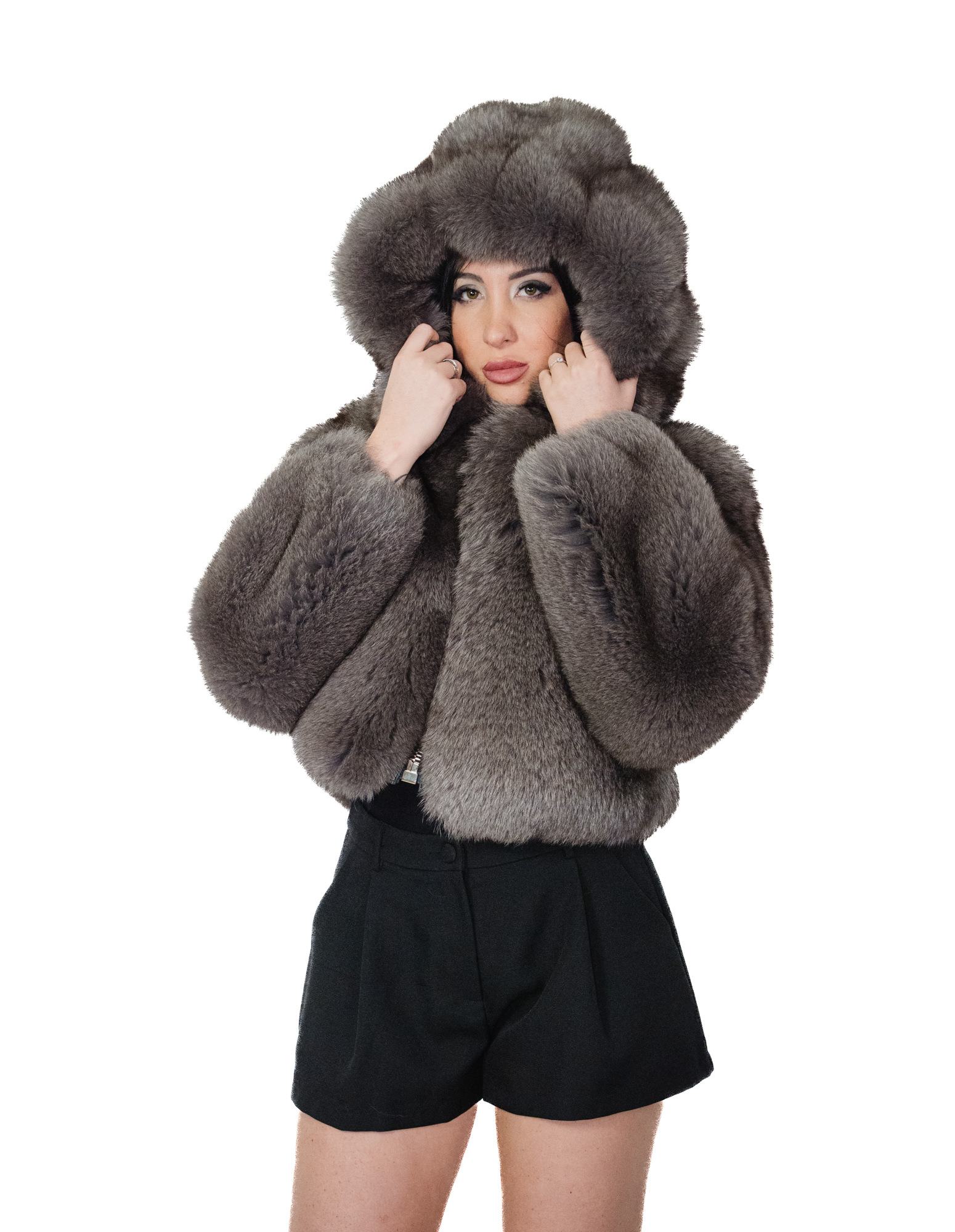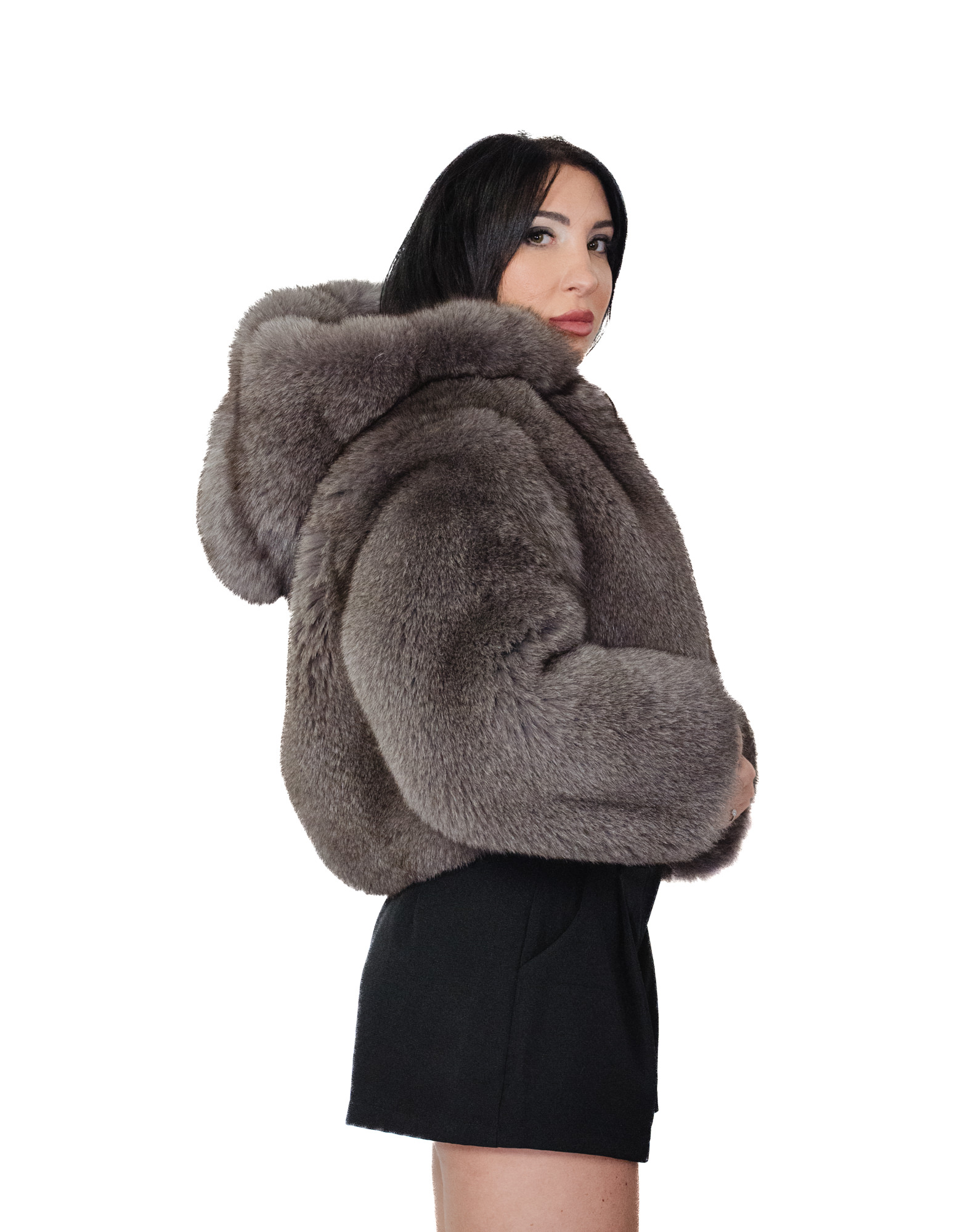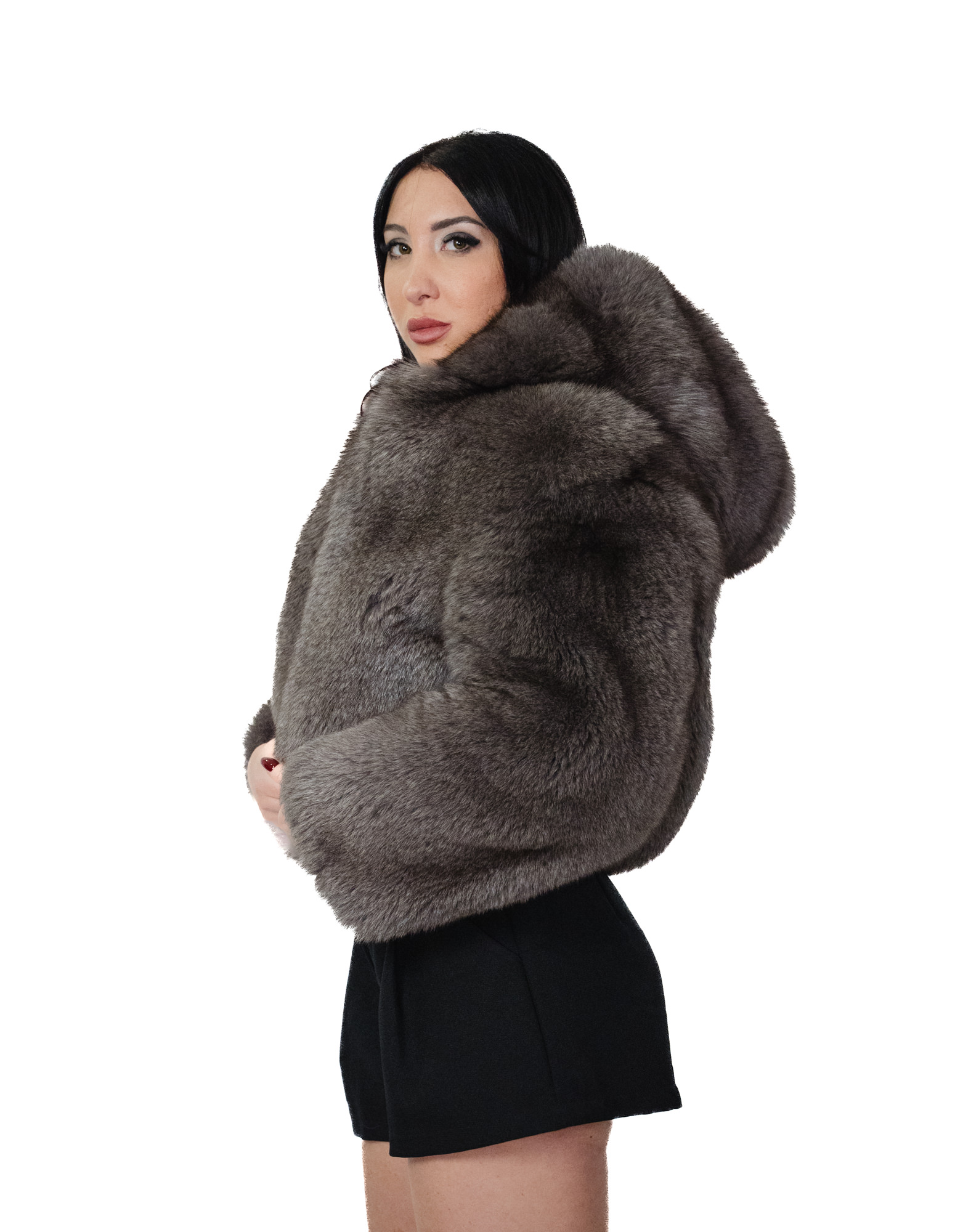 Full-skin fox fur jacket. Our fox furs are made productions of our workshops, thus a unique and exclusive fox jacket. The ability to produce our furs of the highest quality allows us to make proposals at different prices with a variety of bargains at low prices always available. In addition, our workshops and collaborations guarantee fox fur of undisputed 100% made-in-Italy quality. The quality of fox fur used for this one is a fox fur jacket with skins initialed InModa Fur. The full-skin fox fur jacket features real leather inserts, with exterior pockets, with zipper closure, fluffy fox hood lined with shaved fur inside, three-quarter sleeve, all in gray color named dark sable.