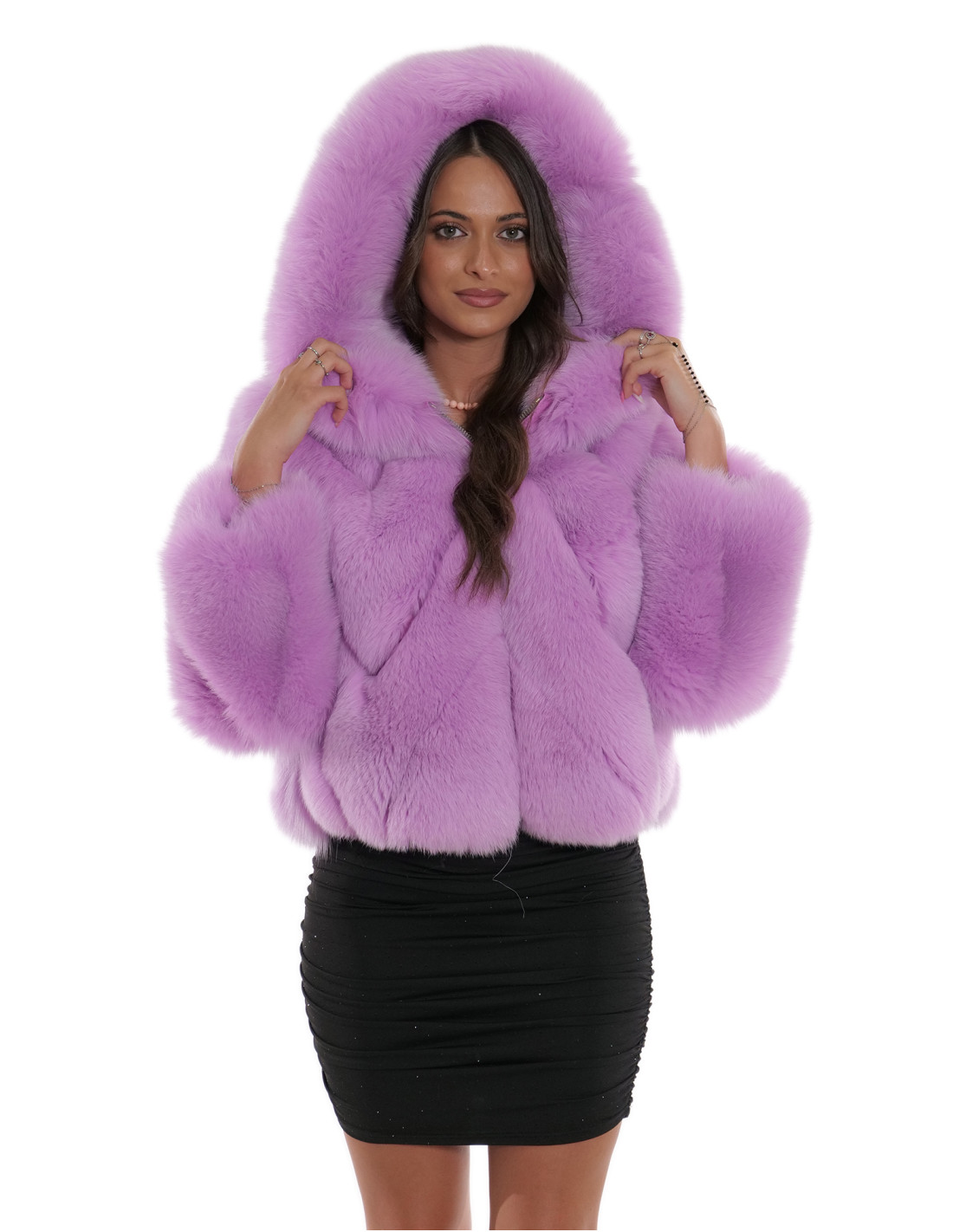 42 transversal fox fur jacket with long sleeve and fuchsia hood with zip closure