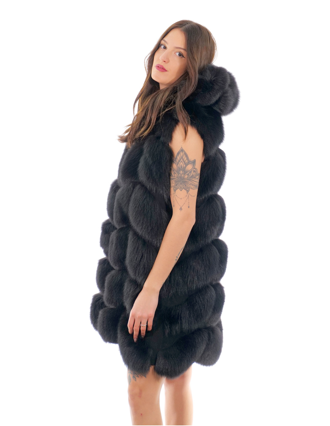 Fox fur vest with whole skins in V-work. Our fox furs are products made in our laboratories, therefore a unique and exclusive fox jacket. The possibility of producing our furs of the highest quality allows us to make proposals at different prices with various occasions at low prices always available. Furthermore, our laboratories and our collaborations guarantee a fox fur of undisputed quality 100% made in Italy. The quality of fox fur used for this is a fox fur vest with skins signed InModa Pellicceria. The fur vest 86 centimeters long fox and insertion of real black suede leather comes with external pockets, zip closure and hood lined in black lining and external fur and all in black.
