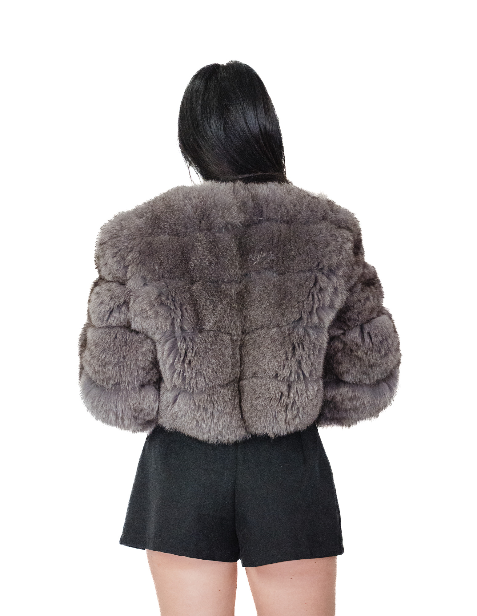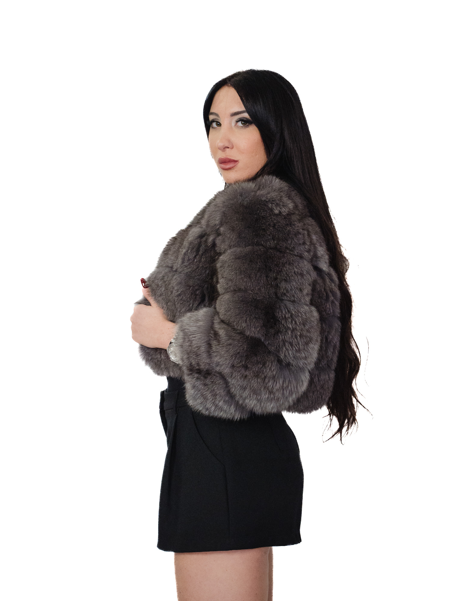 Whole-skin fox fur jacket in horizontal processing. Our fox furs are made productions of our workshops, thus a unique and exclusive fox jacket. The ability to produce our furs of the highest quality allows us to make proposals at different prices with a variety of bargains at low prices always available. In addition, our workshops and collaborations guarantee fox fur of undisputed 100% made-in-Italy quality. The quality of fox fur used for this one is a fox fur jacket with skins initialed InModa Fur. The whole-skin fox fur jacket in horizontal workmanship features real leather inserts, with outside pockets, with hook-and-eye closure, chanel collar, three-quarter sleeve, all in dark sable gray color.