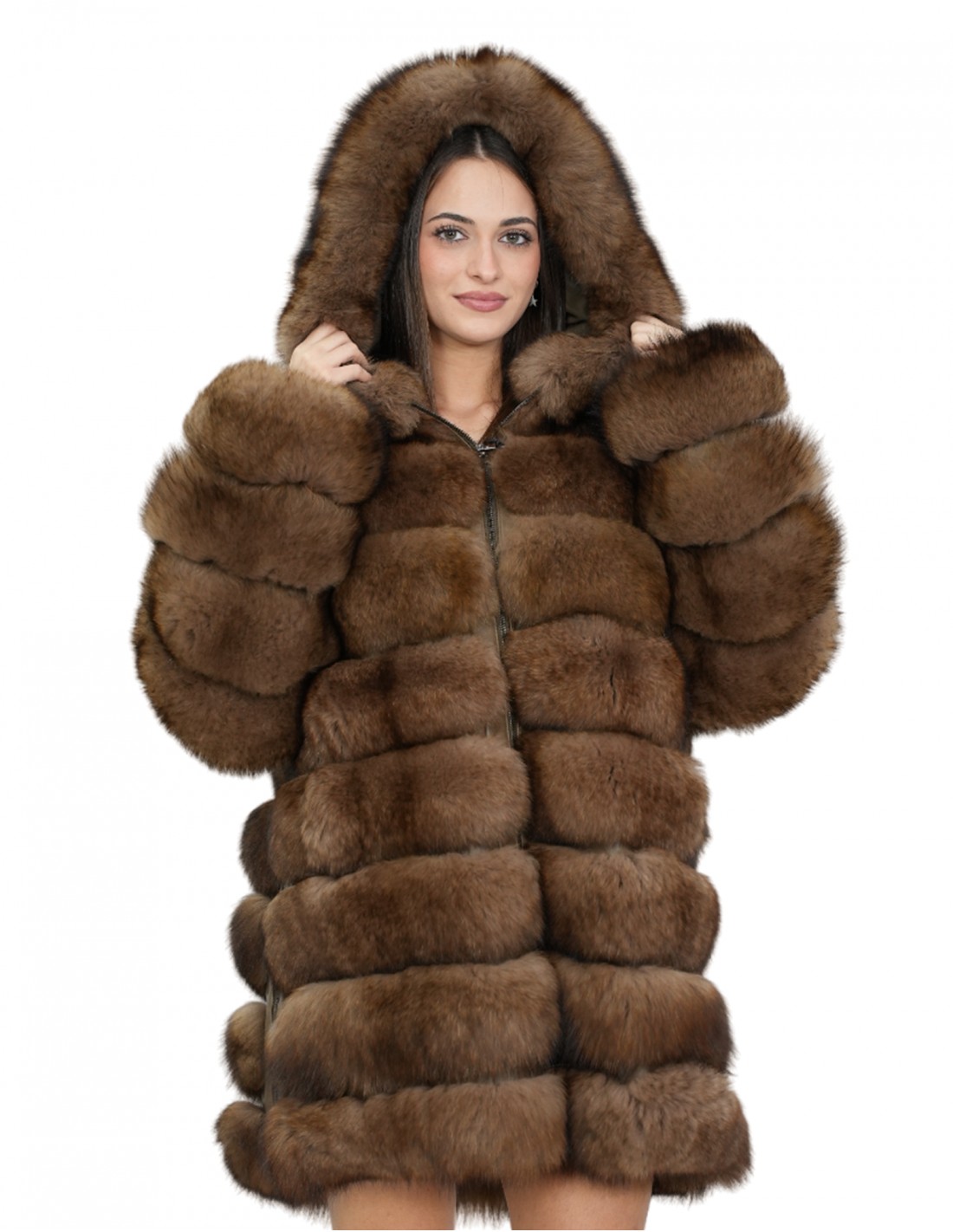Fox fur coat with whole skins. Our fox furs are productions made in our laboratories, therefore a unique and exclusive fox jacket. The possibility of producing our furs of the highest quality allows us to make proposals at different prices with various opportunities at low prices always available. Furthermore, our laboratories and our collaborations guarantee fox fur of undisputed quality, 100% made in Italy. The quality of fox fur used for this is a fox fur vest with Nevepell signature pelts. The 80 centimeter long fox fur coat with real leather insert features external pockets, zip closure and hood lined with lining and external fur, with side vents with zips and all in brown colour.