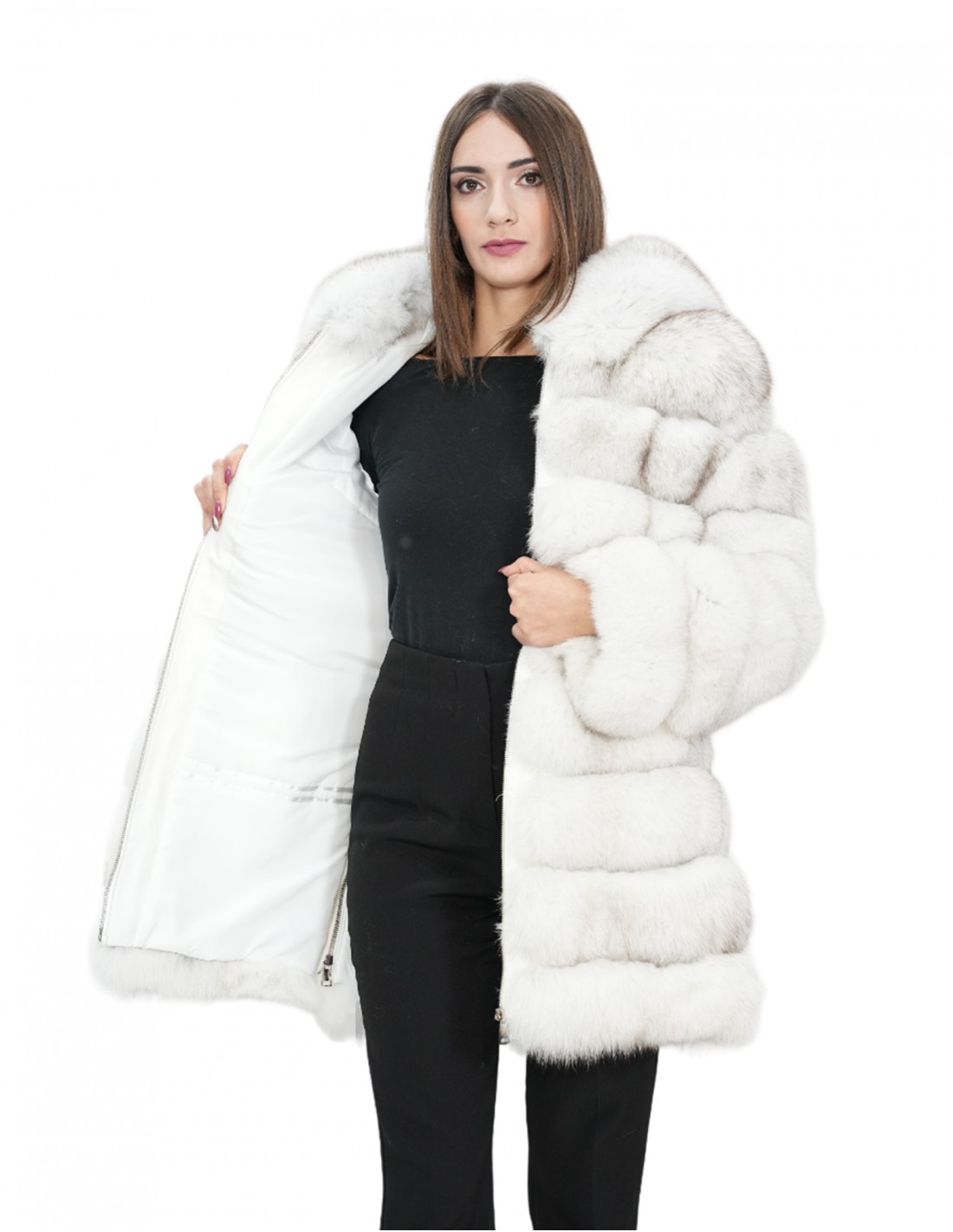 Fox fur coat jacket with whole skins. Our fox furs are products made in our laboratories, therefore a unique and exclusive fox jacket. The possibility of producing our furs of the highest quality allows us to make proposals at different prices with various occasions at low prices always available. Furthermore, our laboratories and our collaborations guarantee a fox fur of undisputed quality 100% made in Italy. The quality of fox fur used for this is a fox fur vest with Nevepell-branded skins. The 80 centimeter long fox fur coat with real leather inserts comes with external pockets, zip closure and hood lined in lining and external fur, with side slits equipped with zips and all in natural white color.