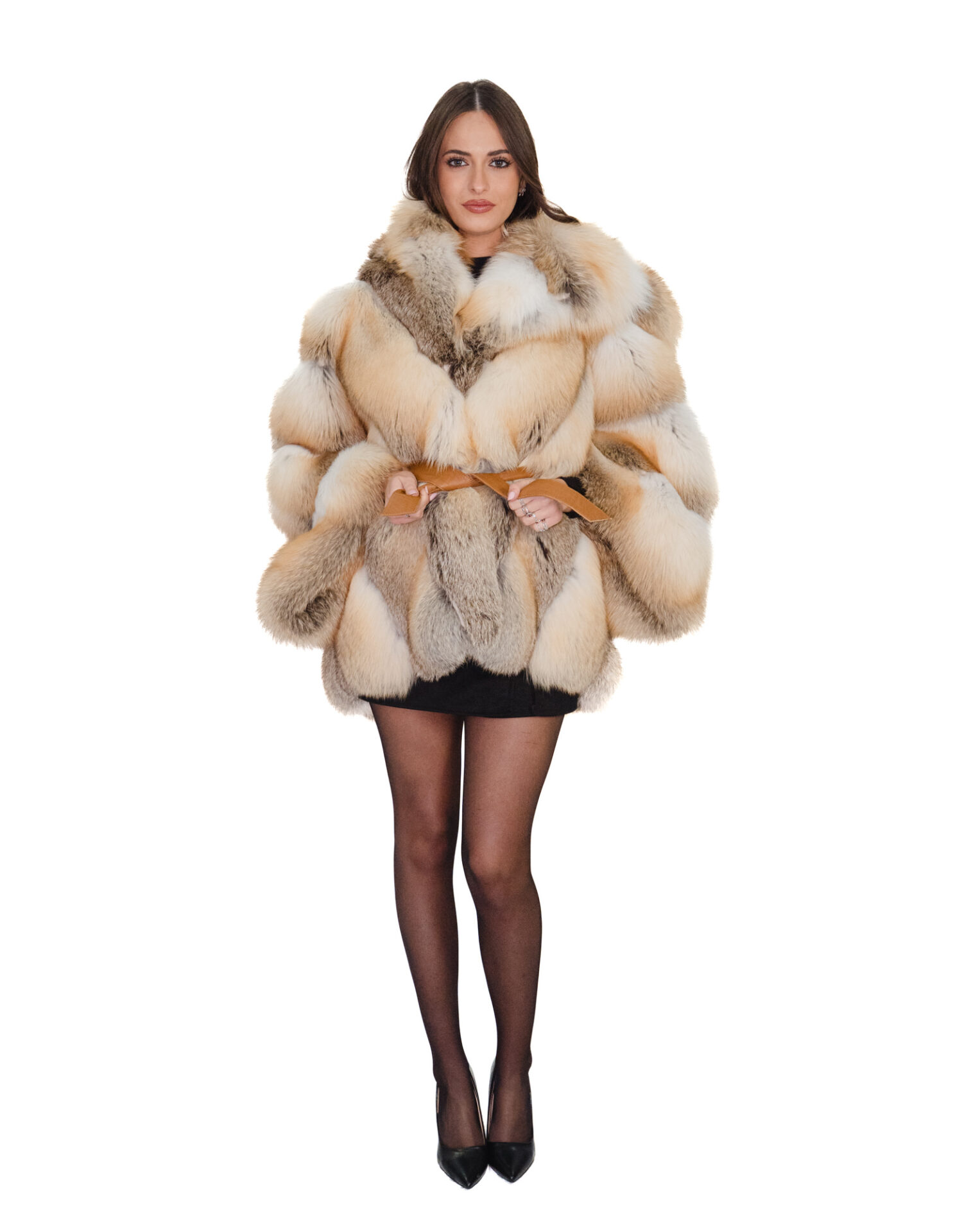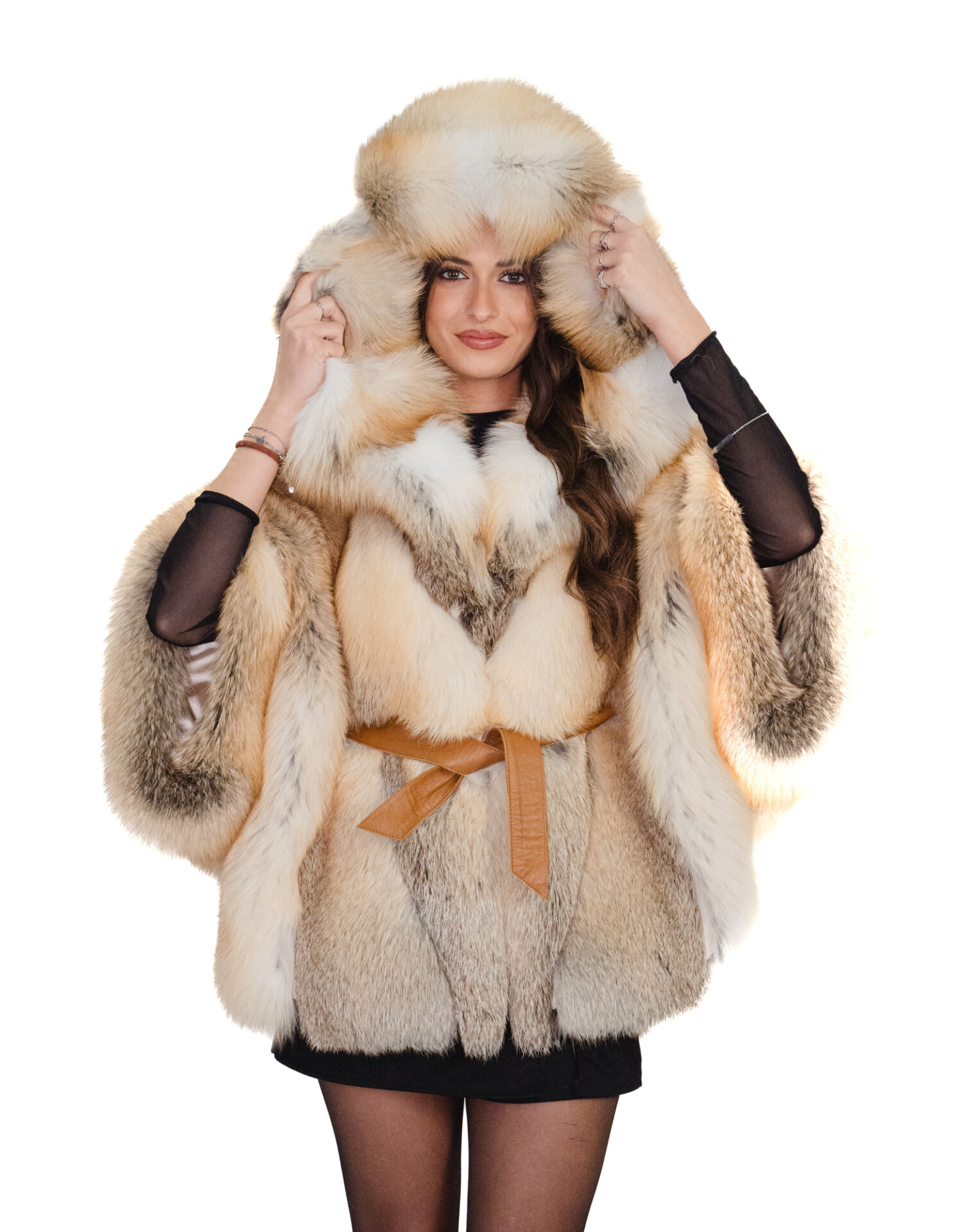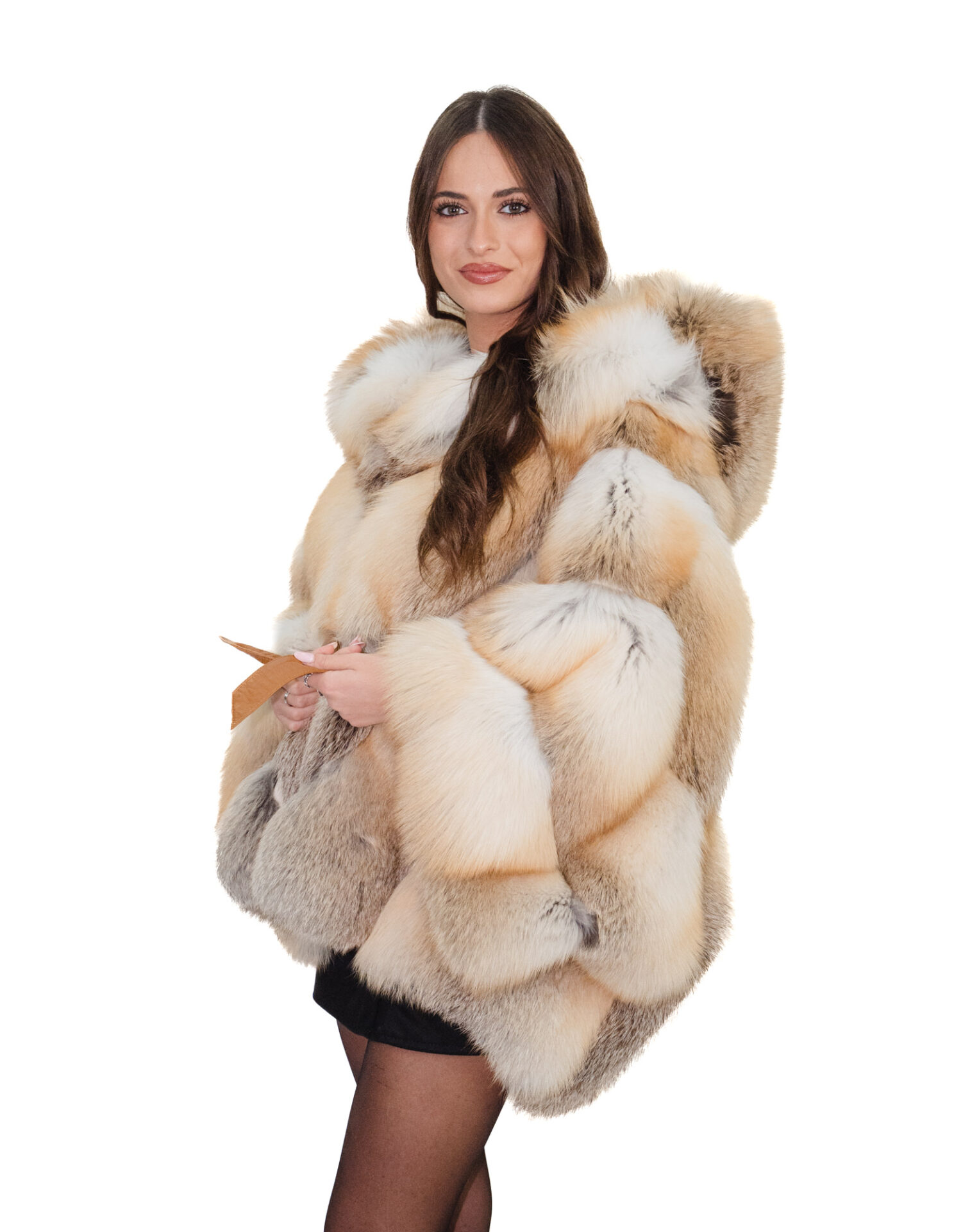 Full-skin fox fur jacket in horizontal V-shaped processing. Our fox furs are made productions of our workshops, thus a unique and exclusive fox jacket. The ability to produce our furs of the highest quality allows us to make proposals at different prices with a variety of bargains at low prices always available. In addition, our workshops and collaborations guarantee fox fur of undisputed 100% made-in-Italy quality. The quality of fox fur used for this jacket is a fox fur jacket with furs branded Saga furs. The fox fur jacket features a horizontal V-neck with an internal leather belt, external pockets, hook closure, three-quarter sleeves, and a very large, fluffy hood complete with fox fur lining, all in a natural color. The fur model has a unique fit and allows for an excellent cape-style fit from a small size 42 (as shown on the model in the photo) to a larger size 58-60.