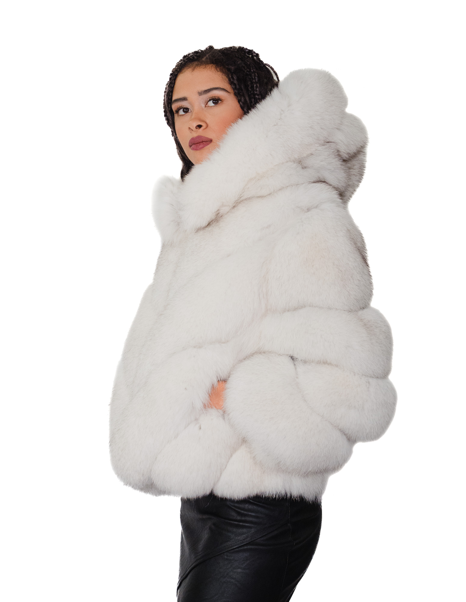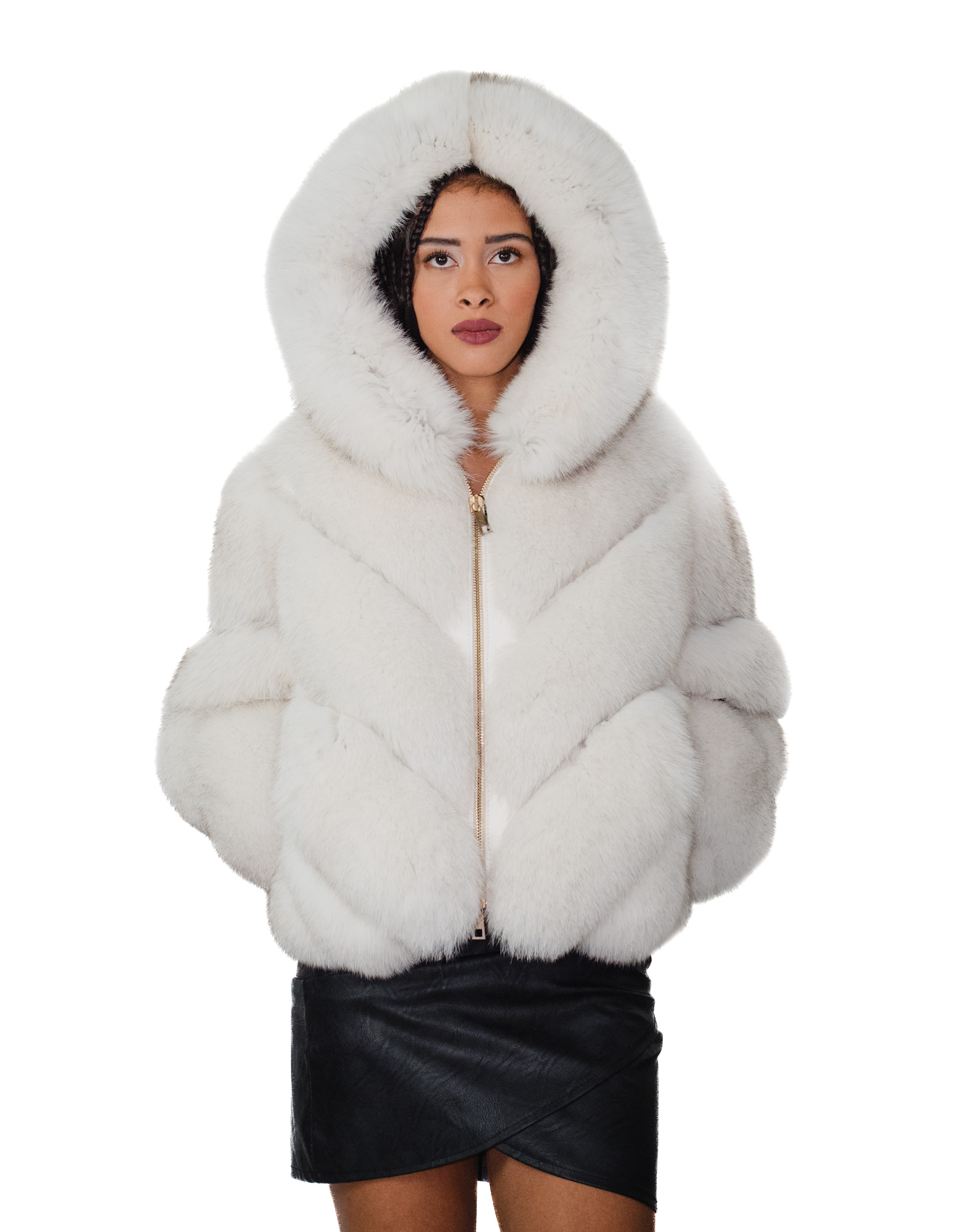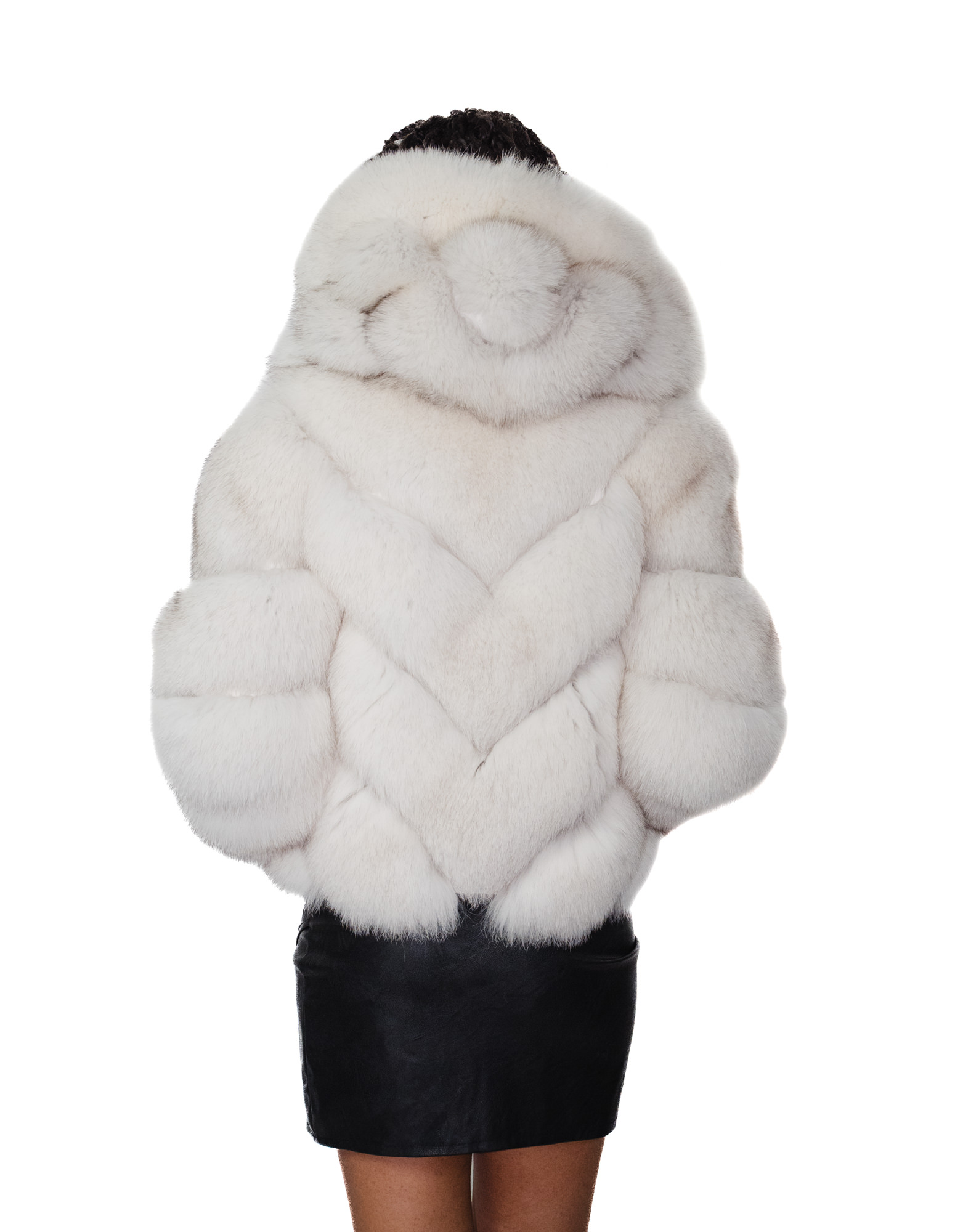 Full-skins fox fur jacket in a horizontal V-neck with a fox fur-lined hood. Our fox furs are made productions of our workshops, thus a unique and exclusive fox jacket. The ability to produce our furs of the highest quality allows us to make proposals at different prices with a variety of bargains at low prices always available. In addition, our workshops and collaborations guarantee fox fur of undisputed 100% made-in-Italy quality. La qualità di pelliccia di volpe utilizzata per questa è una giacca di pelliccia di volpe con pelli siglate Saga furs. La giacca di pelliccia di volpe si presenta in lavorazione orizzontale a V con trasporto in vera pelle bianca modello corto solo 54 centimetri, tasche esterne, chiusura zip, maniche tre quarti, cappuccio e foderato in pelliccia di volpe, il tutto in colore bianco sfumato.