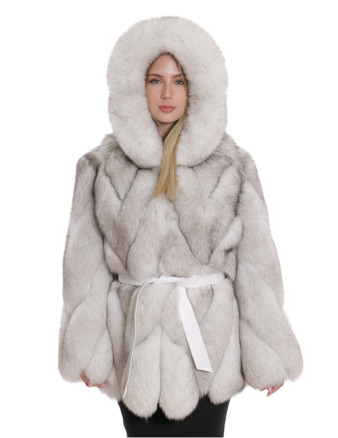 Fox fur jacket with whole skins in transversal processing. Our fox furs are productions made in our laboratories, therefore a unique and exclusive fox jacket. The possibility of producing our furs of the highest quality allows us to make proposals at different prices with various opportunities at low prices always available. Furthermore, our laboratories and our collaborations guarantee fox fur of undisputed quality, 100% made in Italy. The quality of fox fur used for this is a fox fur jacket with skins signed InModa Pellicceria. The fox fur jacket comes in transversal workmanship with real leather inserts, with external pockets, with hook closure, vaporous fox hood both internally and externally, 3/4 sleeves, external white leather belt, all in color shaded white.