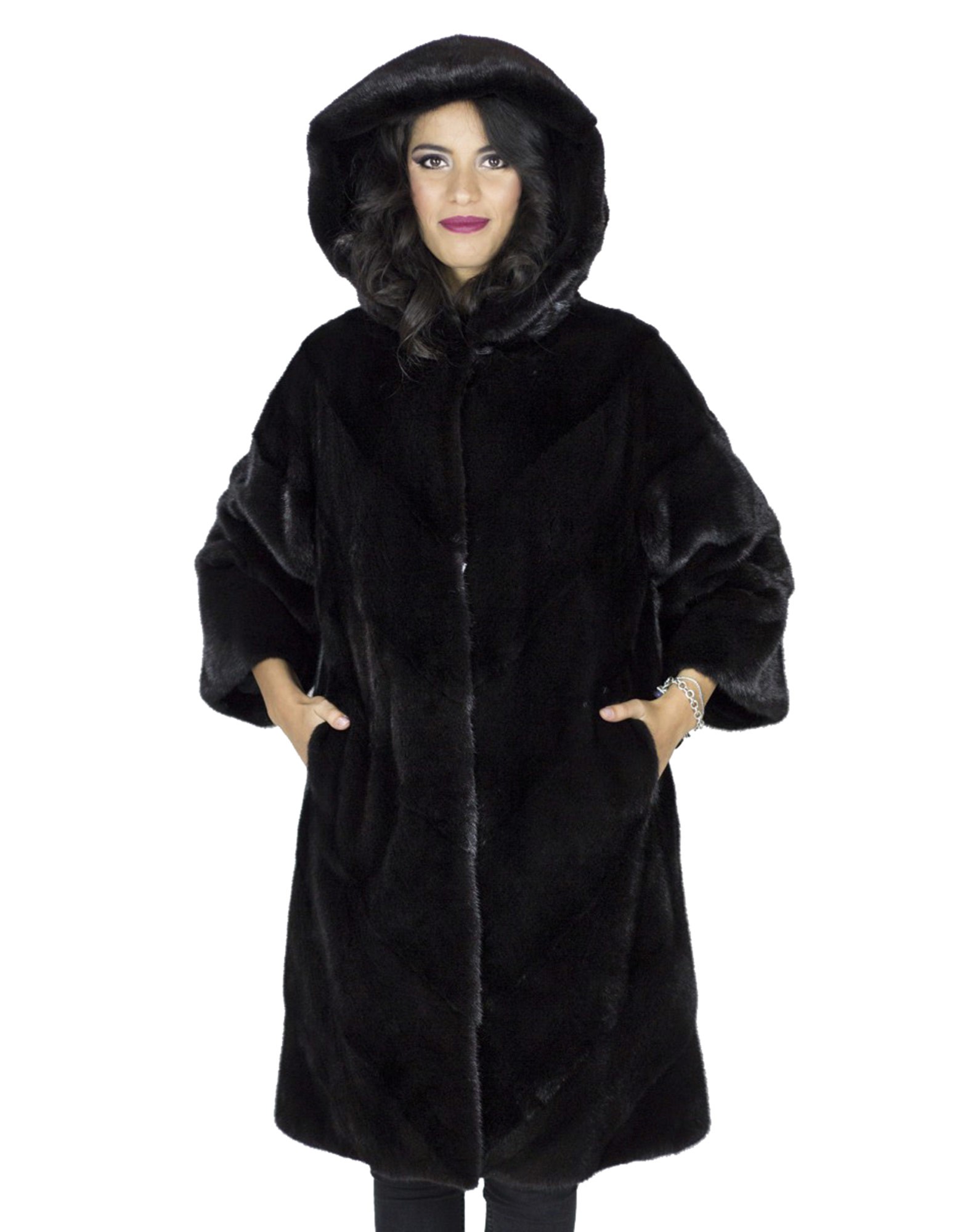 Mink coat with whole skins in horizontal processing. Our mink furs are productions made in our laboratories, therefore a unique and exclusive mink jacket. The possibility of producing our furs of the highest quality allows us to make proposals at different prices with various opportunities at low prices always available. Furthermore, our laboratories and our collaborations guarantee a mink fur of undisputed quality, 100% made in Italy. The quality of female mink fur used for this is a mink fur jacket with Manakas signature pelts. The 104 centimeter long horizontal mink fur jacket features external pockets, hook closure and hood collar lined in mink fur, flared model in black.