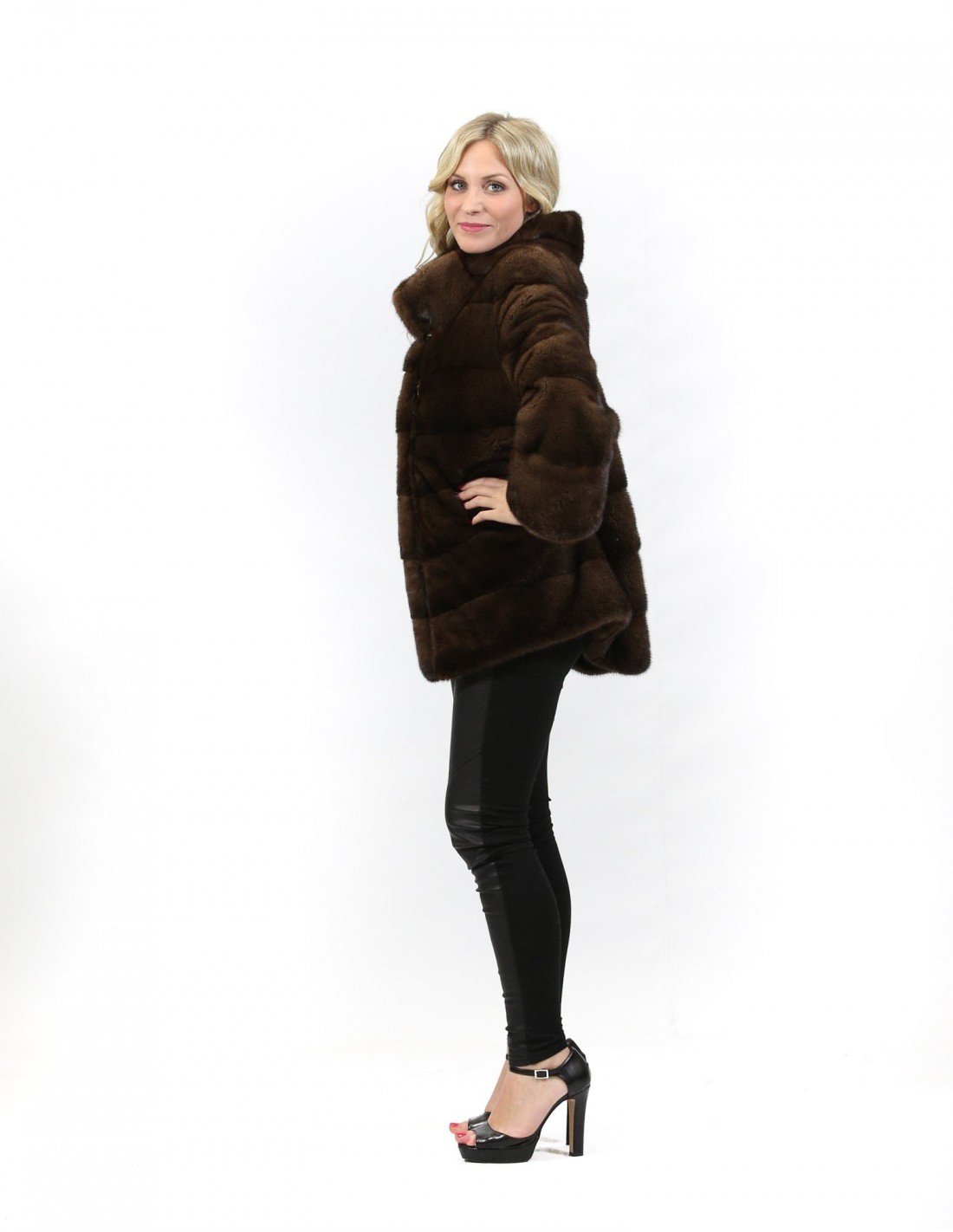 Mink fur coat with whole skins with horizontal processing. Our mink furs are productions made in our laboratories, therefore a unique and exclusive mink jacket. The possibility of producing our furs of the highest quality allows us to make proposals at different prices with various occasions at low prices always available. Furthermore, our laboratories and our collaborations guarantee a mink fur of undisputed quality 100% made in Italy. The quality of female mink fur used for this is a mink fur jacket with skins signed Braschi. The mink fur coat in horizontal processing, 70 centimeters long, has external side pockets, hook closure, wide and high collar, long sleeves, all in brown Scanbrown color.