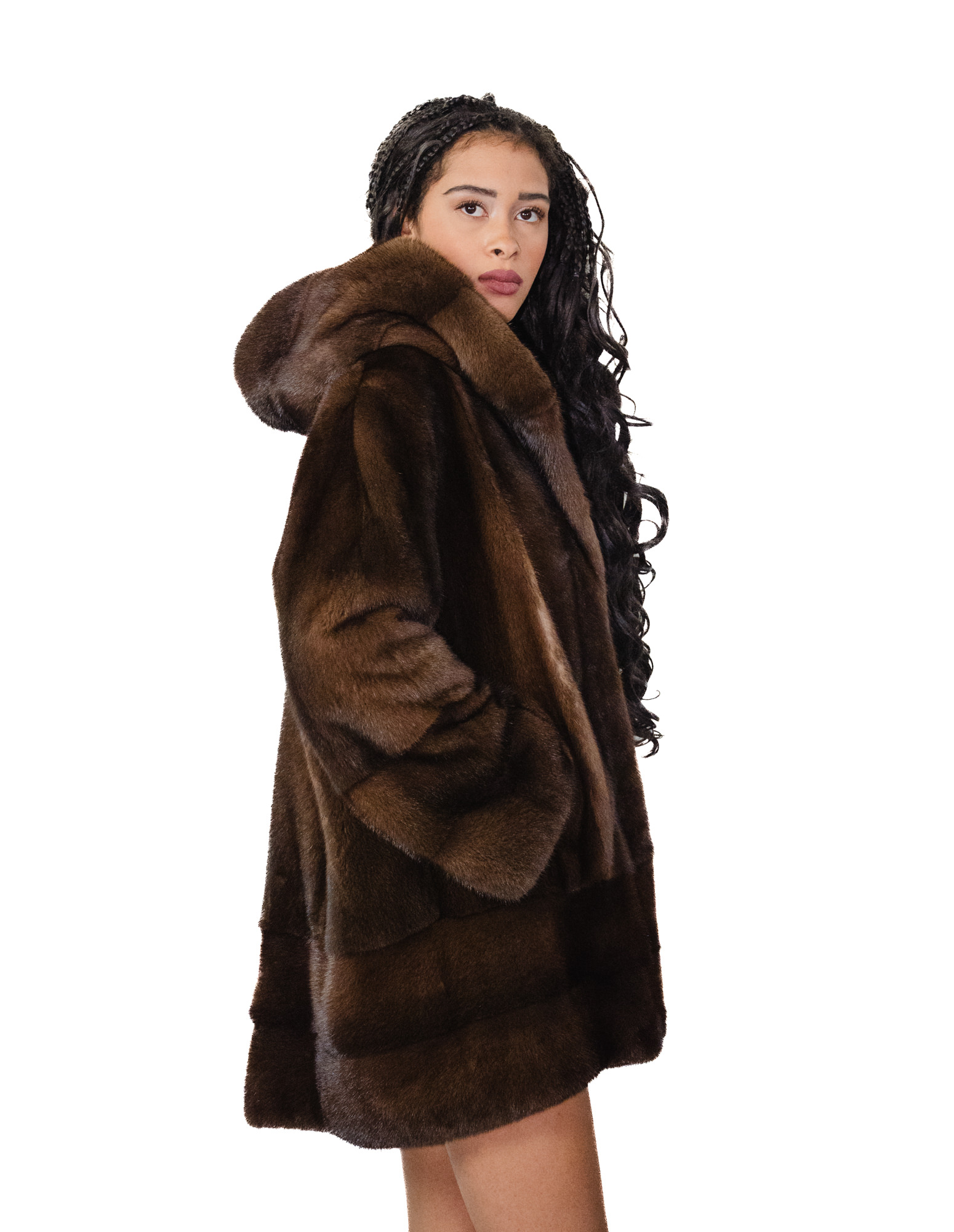 50 vertical and horizontal mink fur hood coat demi brown long sleeve external pockets