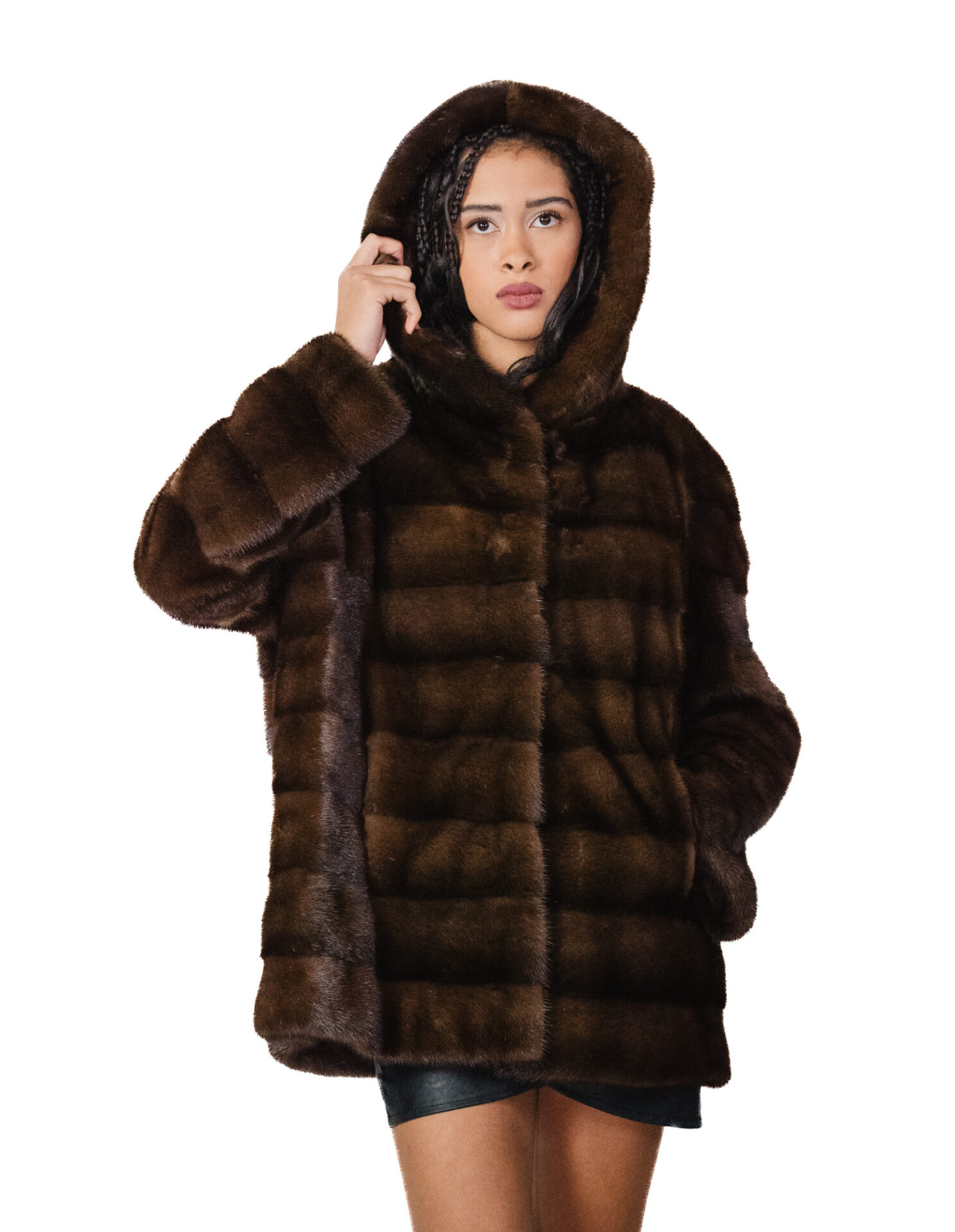 Whole-skin mink fur coat with horizontal workmanship. Our mink furs are made productions of our workshops, thus a unique and exclusive mink jacket. The ability to produce our furs of the highest quality allows us to make proposals at different prices with a variety of bargains at low prices always available. In addition, our laboratories and collaborations guarantee mink fur of undisputed quality 100% made in italy. La qualità di pelliccia di visone femmina utilizzata per questa è una giacca di pelliccia di visone con pelli siglate InModa Pellicceria. La giacca di pelliccia di visone in lavorazione orizzontale, manica lunga, chiusura con ganci interni, cappuccio foderato anche internamente di pelliccia di visone, lungo 76 centimetri, il tutto colore marrone demi buff.