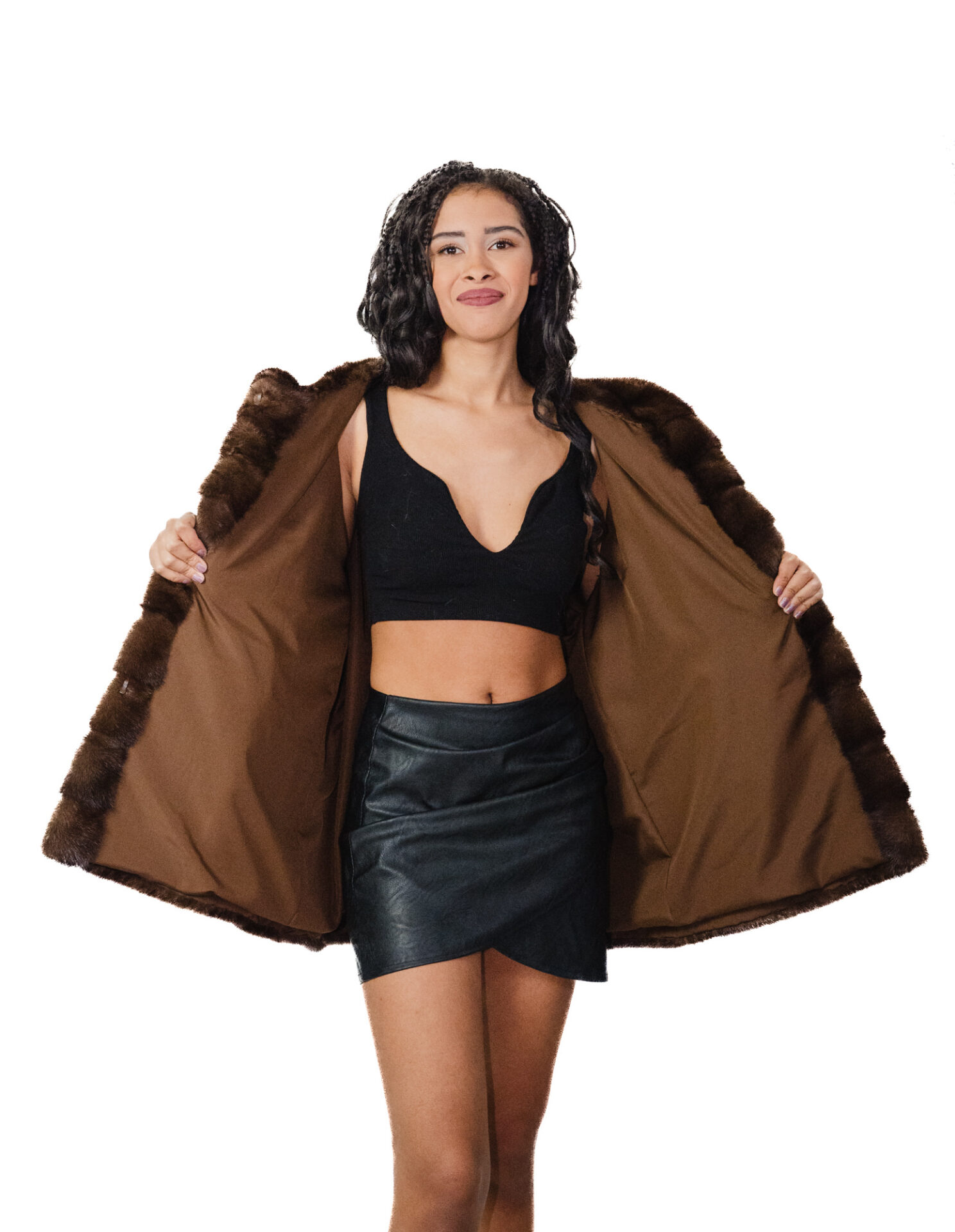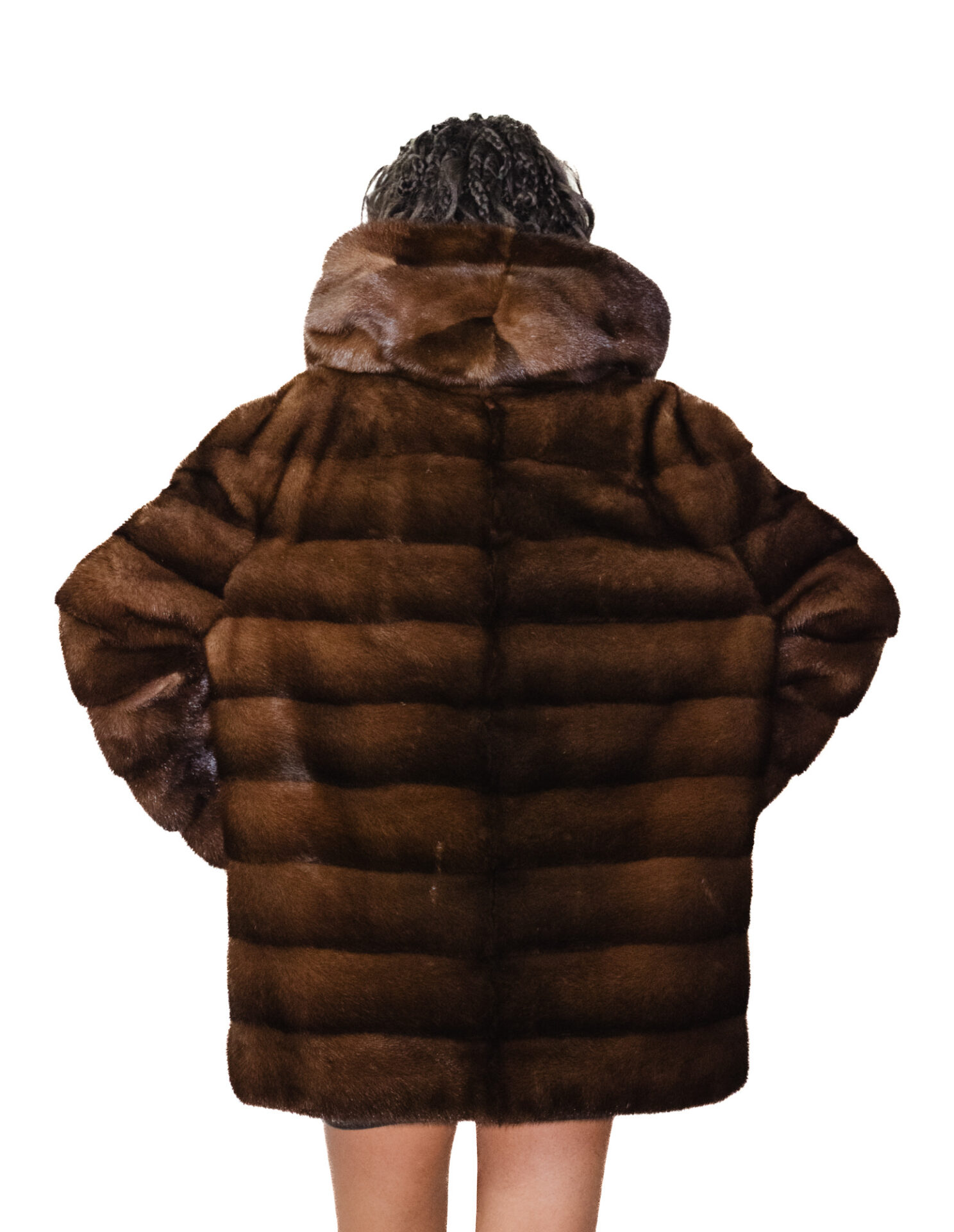 54 mink fur hood coat horizontal demi brown bell model long sleeve external pockets