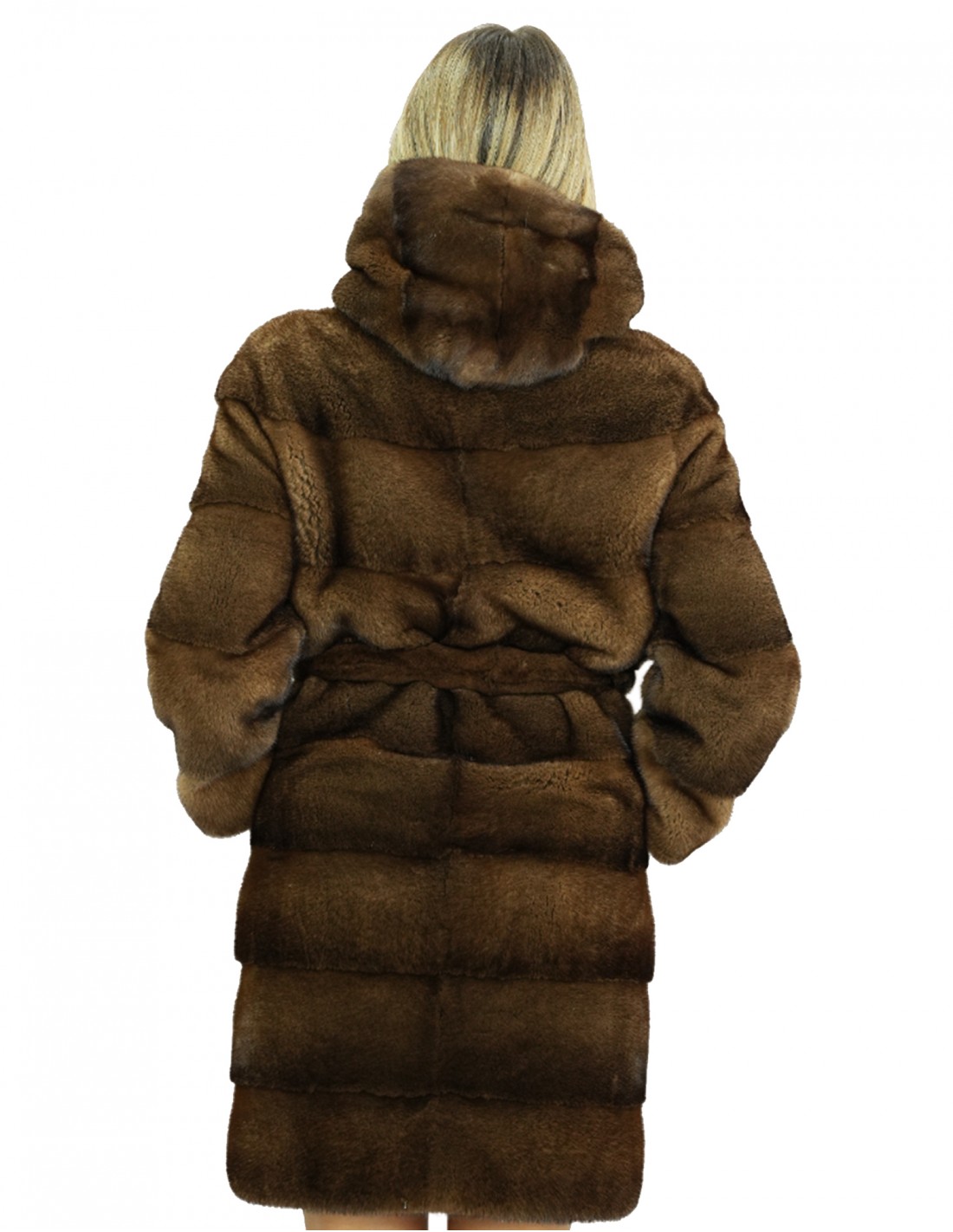 Horizontal full-skin mink fur coat in demi color with fur-lined hood. Our mink furs are productions made in our laboratories, therefore a unique and exclusive mink jacket. The possibility of producing our furs of the highest quality allows us to make proposals at different prices with various opportunities at low prices always available. Furthermore, our laboratories and our collaborations guarantee a mink fur of undisputed quality, 100% made in Italy. The quality of female mink fur used for this is a mink fur jacket with skins signed Copenhagen furs. The mink fur coat in horizontal workmanship, 90 centimeters long, long sleeves, closure with internal hooks, side pockets, mink fur belt and hood lined in mink fur, all in demi colour.