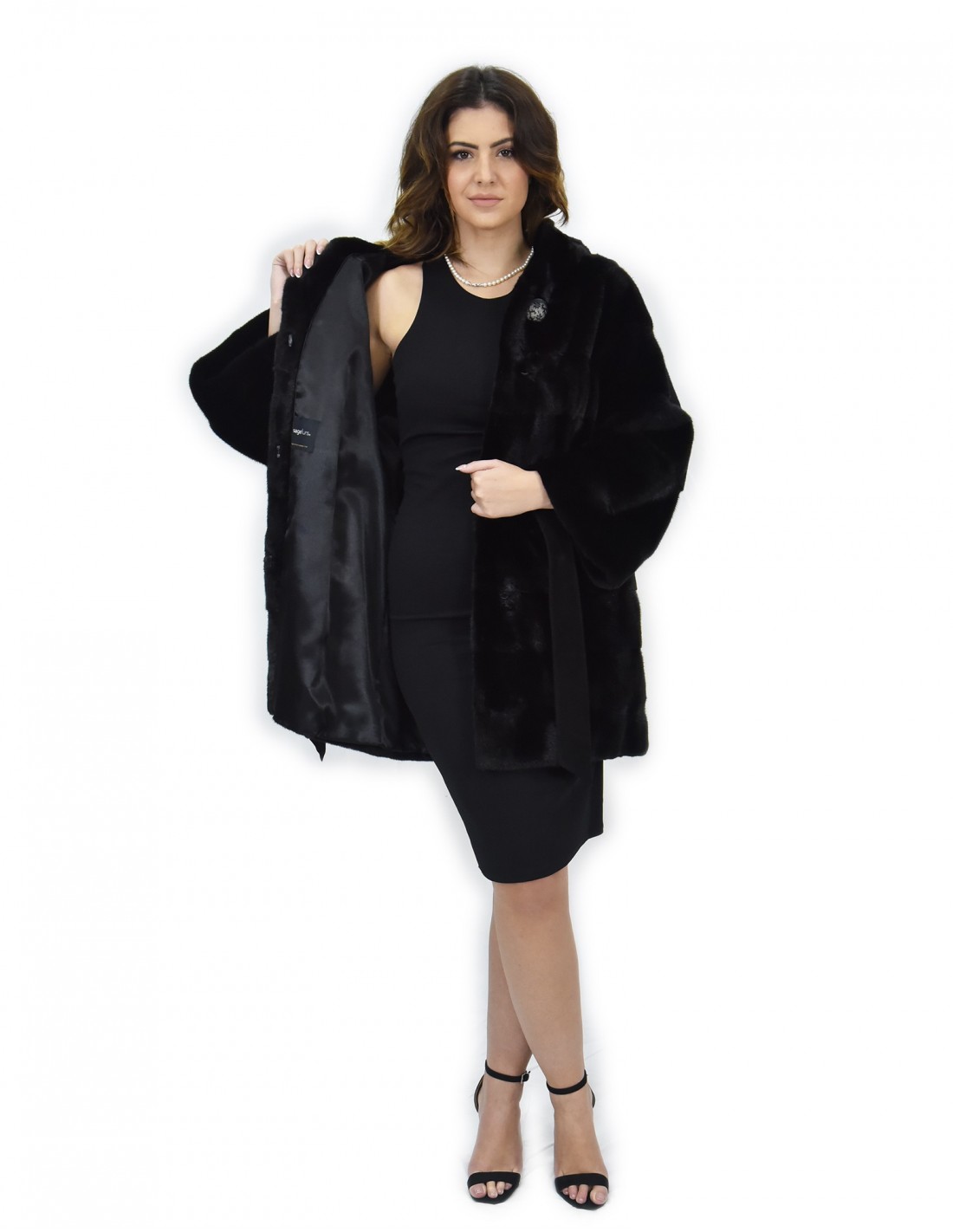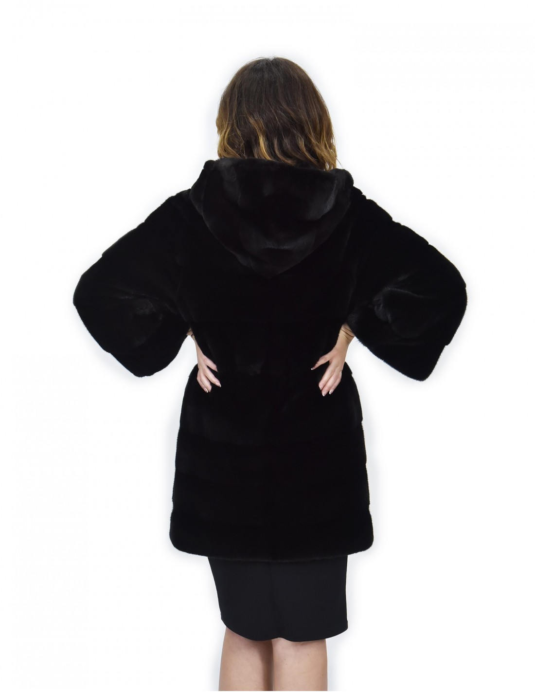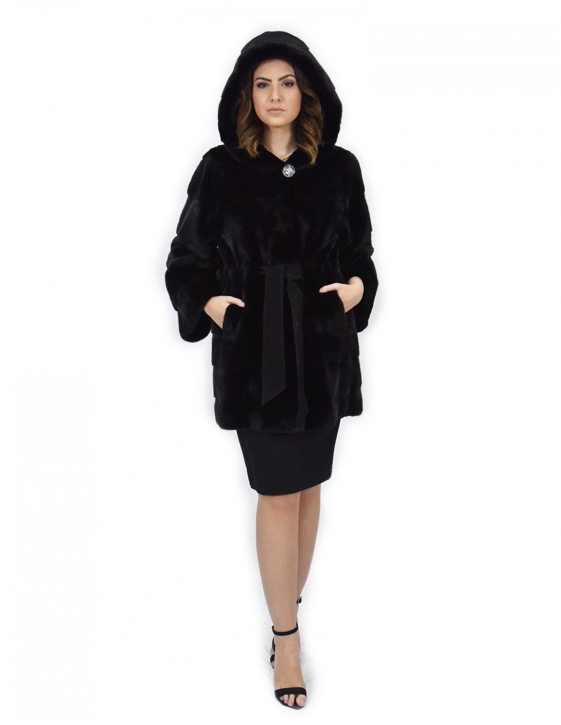 {Mink coat with whole skins in horizontal processing. Our mink furs are productions made in our workshops, therefore a unique and exclusive mink coat. The possibility of producing our furs of the highest quality allows us to make proposals at different prices with various occasions at low prices that are always available. Furthermore, our laboratories and our collaborations guarantee a mink fur of undisputed quality 100% made in Italy. The quality of female mink fur used for this is a mink fur jacket with Saga Furs branded skins. The black mink fur coat is 86 cm long with a beautiful hood lined in mink skins, long sleeves, in mink fur whole skins horizontal processing, hook closure, button on the collar and belt in suede, normal external pockets .