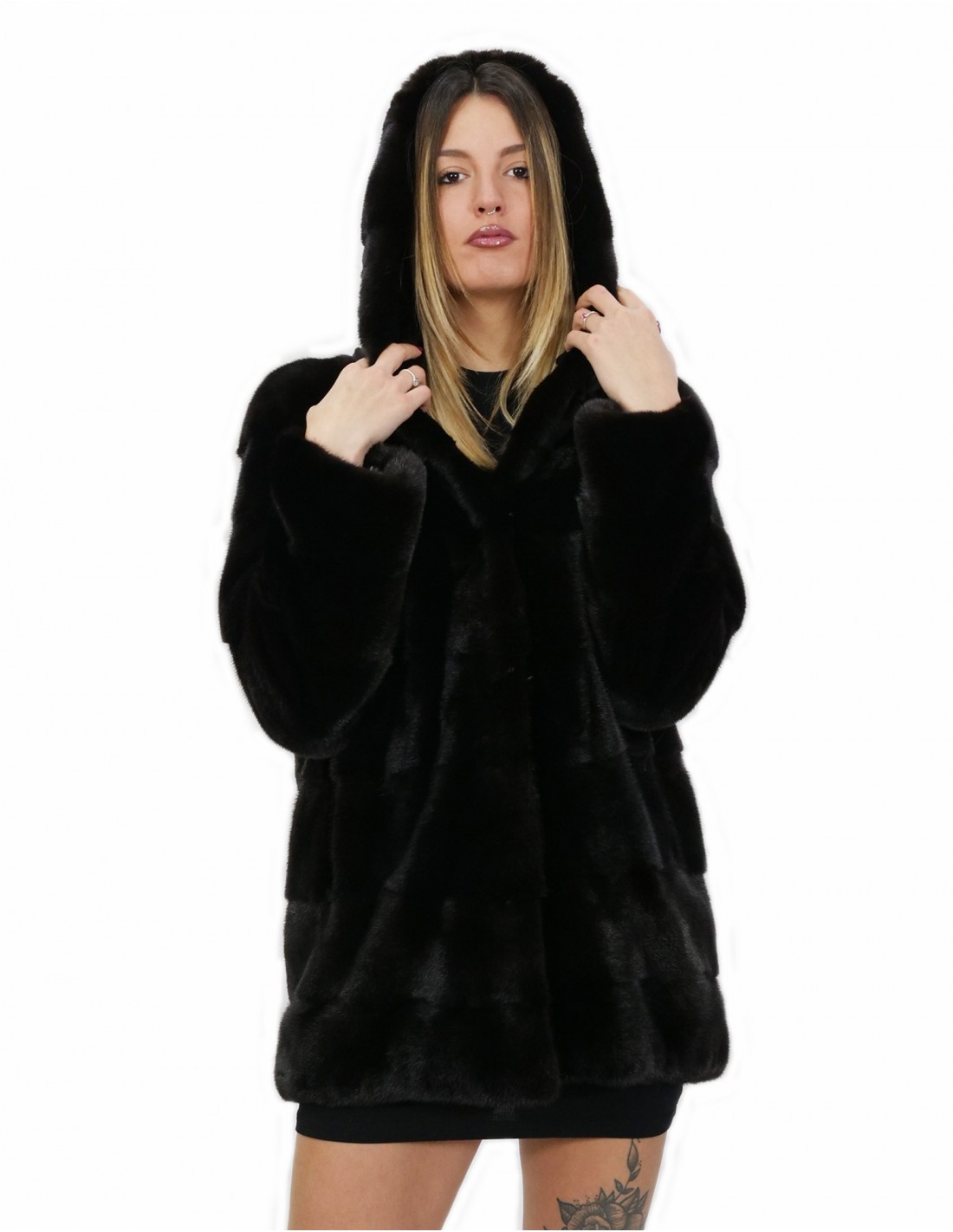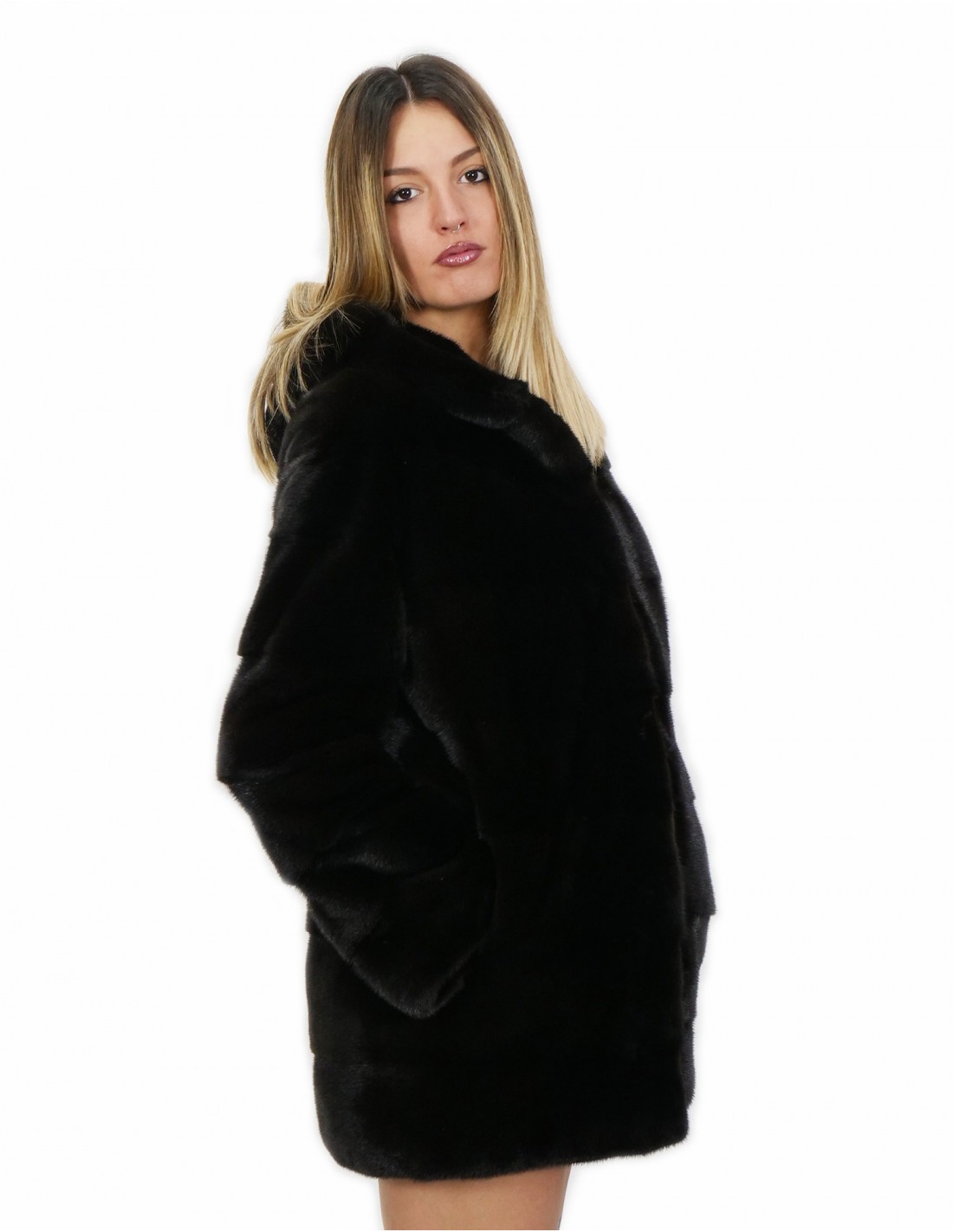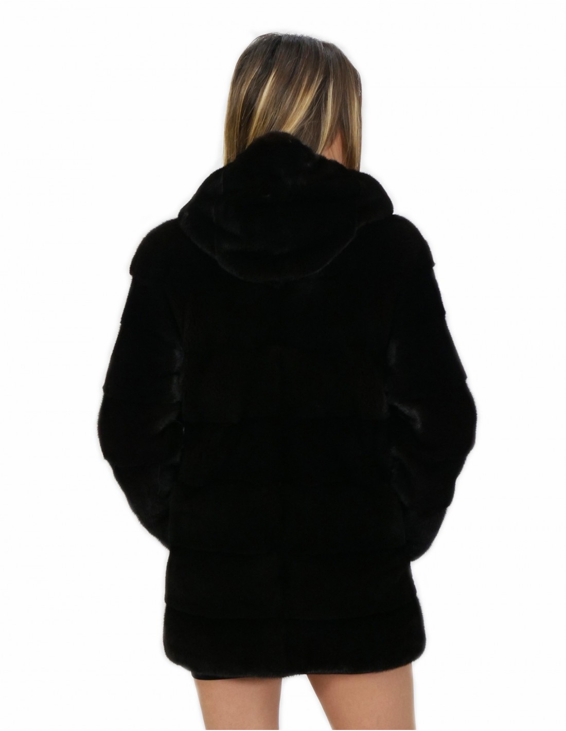 Black coat in horizontal mink with hood 46 72 cm long with external pockets