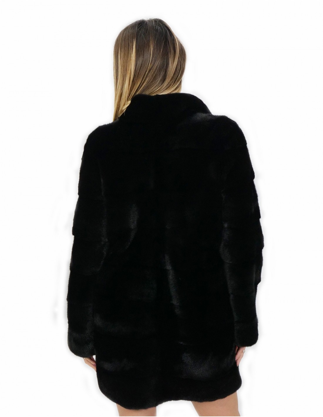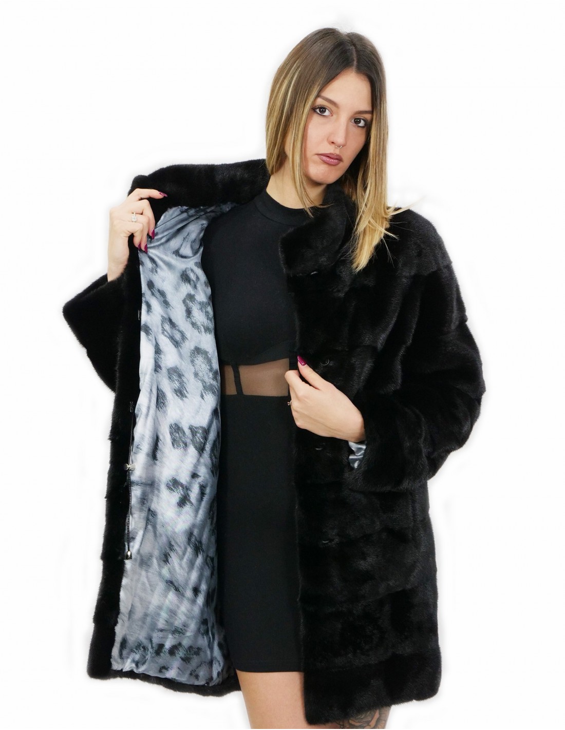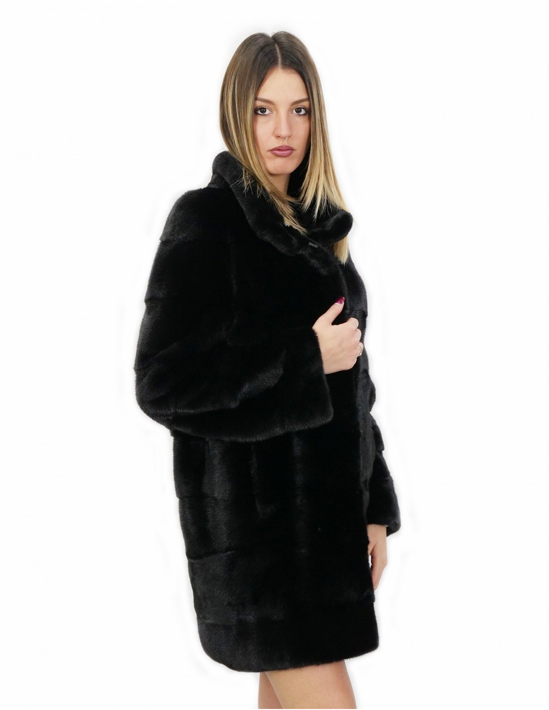 Mink jacket with whole skins in horizontal processing. Our mink furs are productions made in our laboratories, therefore a unique and exclusive mink jacket. The possibility of producing our highest quality furs allows us to make proposals at different prices with various opportunities at low prices that are always available. Furthermore, our laboratories and our collaborations guarantee a mink fur of undisputed quality 100% made in Italy. The quality of female mink fur used for this is a mink fur jacket with skins signed InModa Pellicceria. The 80 cm long horizontal mink fur jacket has external pockets, internal drawstring at the waist, hook closure and piping collar in black.