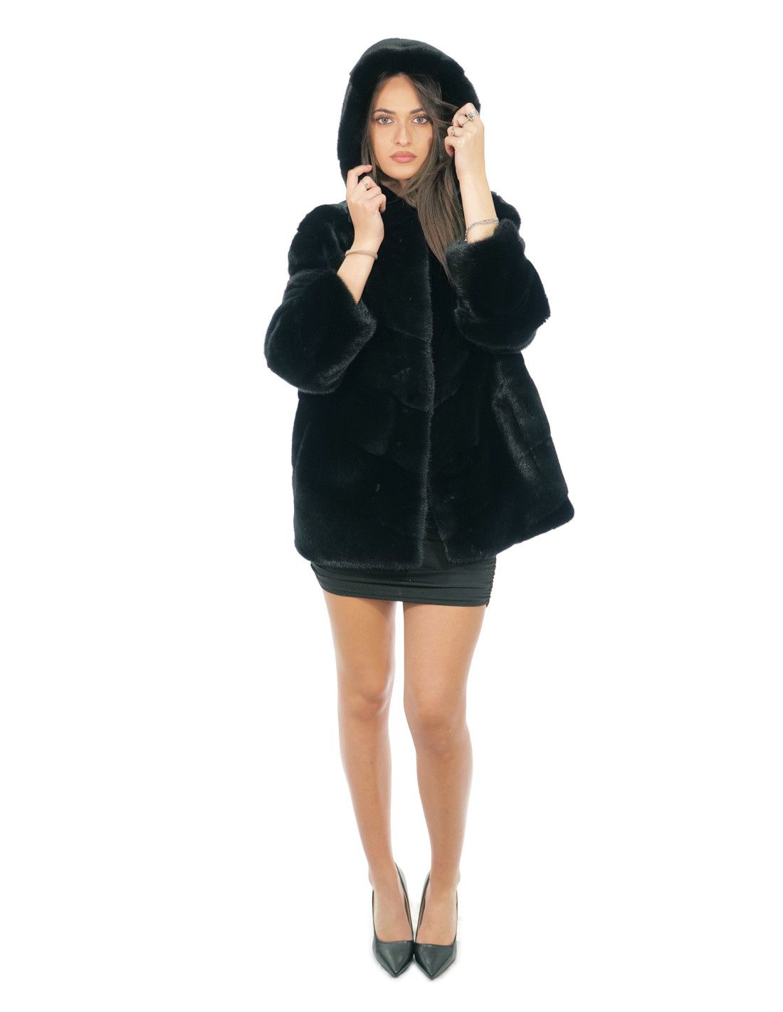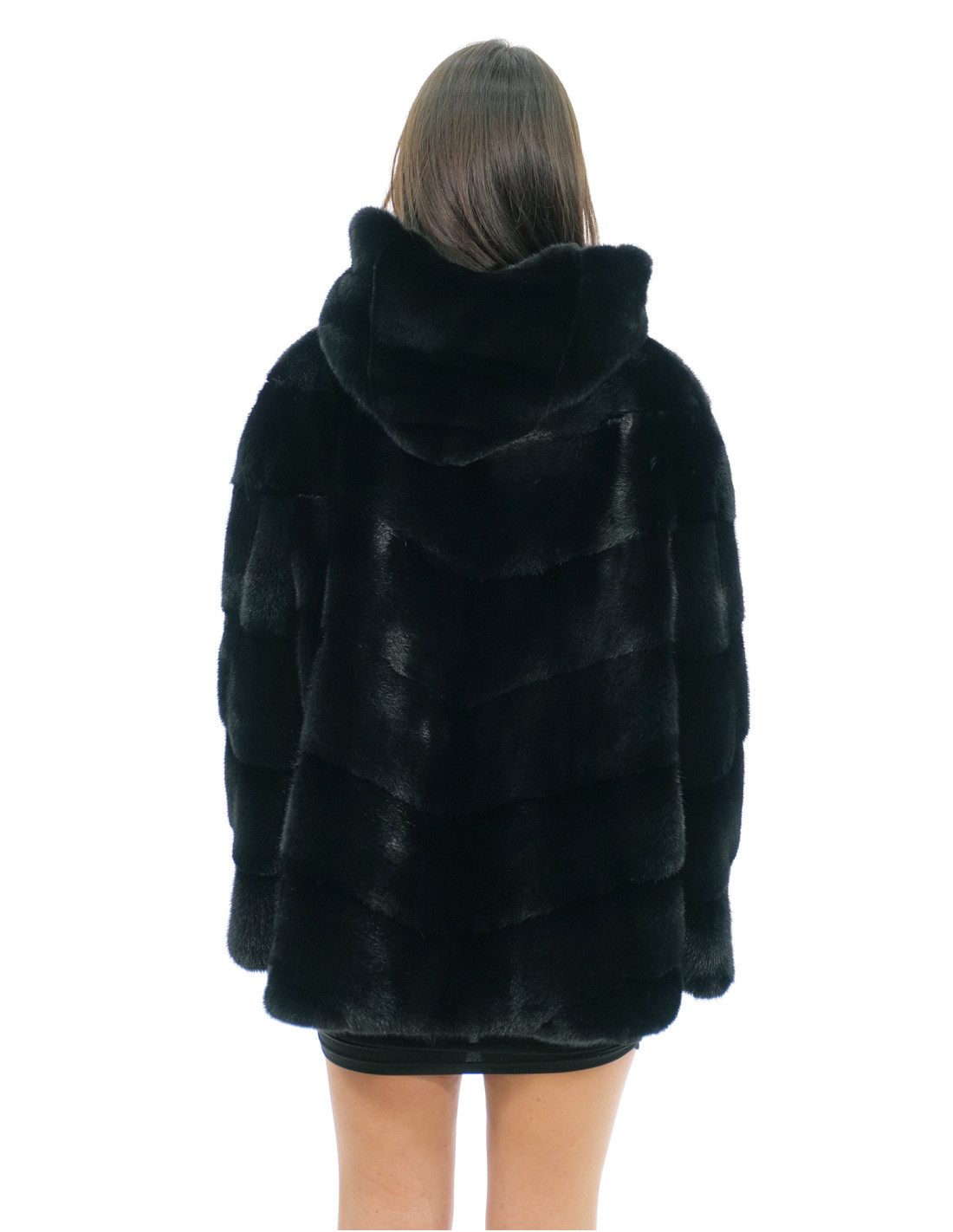 Mink fur jacket with whole skins in horizontal V-work. Our mink furs are products made in our laboratories, therefore a unique and exclusive mink jacket. The possibility of producing our furs of the highest quality allows us to make proposals at different prices with various occasions at low prices always available. Furthermore, our laboratories and our collaborations guarantee a mink fur of undisputed quality 100% made in Italy. The quality of female mink fur used for this is a mink fur jacket with skins signed Saga furs. The mink fur jacket in horizontal V-work is 68 centimeters long, long sleeve, hook closure and hood lined in mink skins, normal external pockets, all in black.