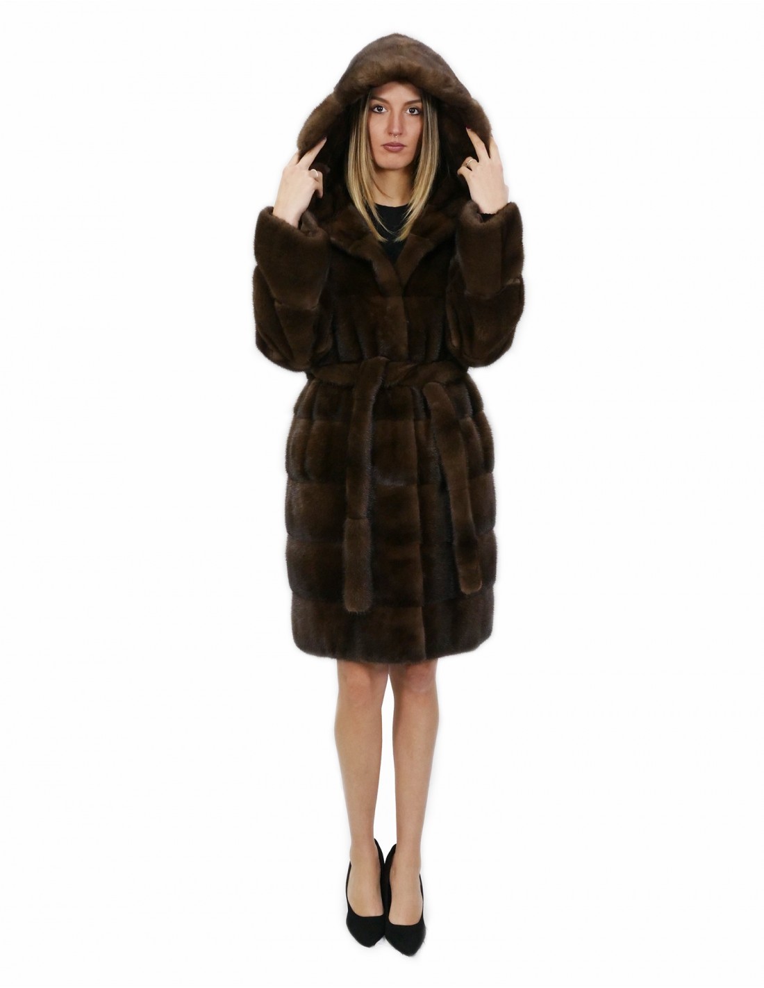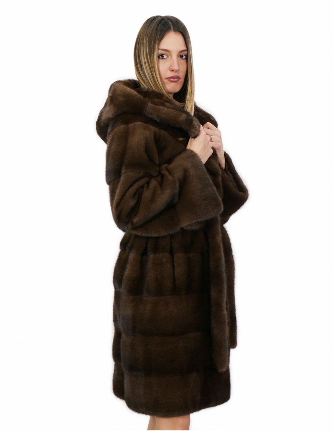 Mink fur coat with whole skins in horizontal processing. Our mink furs are productions made in our laboratories, therefore a unique and exclusive mink coat. The possibility of producing our furs of the highest quality allows us to make proposals at different prices with various opportunities at low prices always available. Furthermore, our laboratories and our collaborations guarantee a mink fur of undisputed quality, 100% made in Italy. The quality of female mink fur used for this is a mink fur coat with skins signed Copenhagen Furs. The mink fur jacket is 100 centimeters long with external pockets, hook closure and hood lined with mink skins, fur belt, all in a beautiful brown colour.