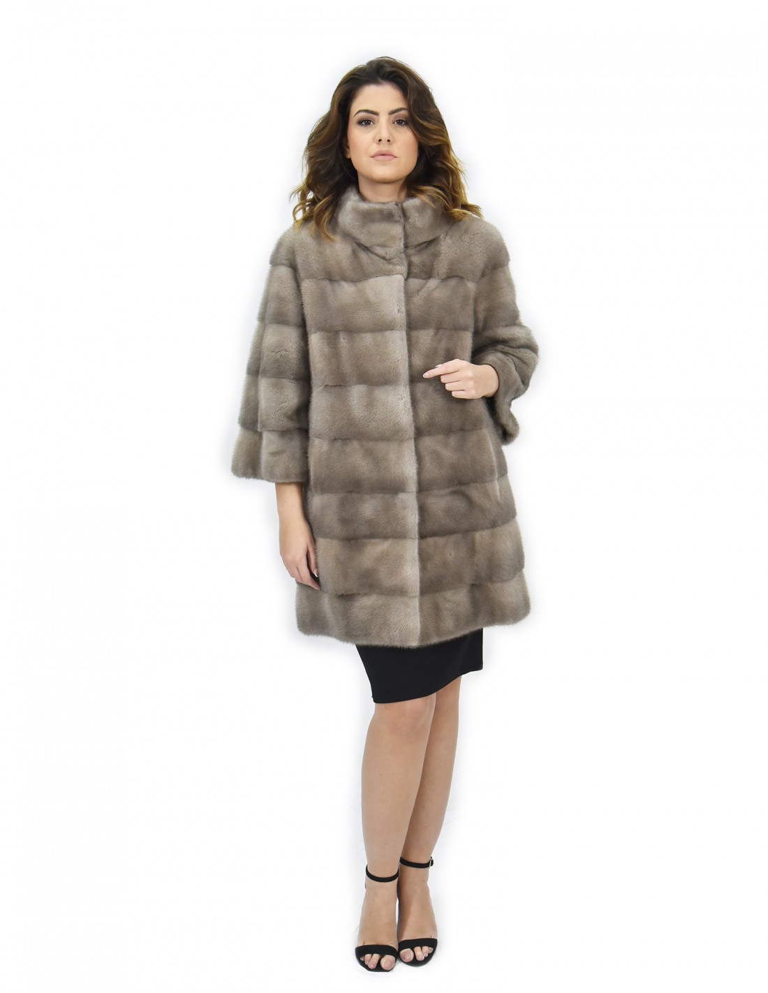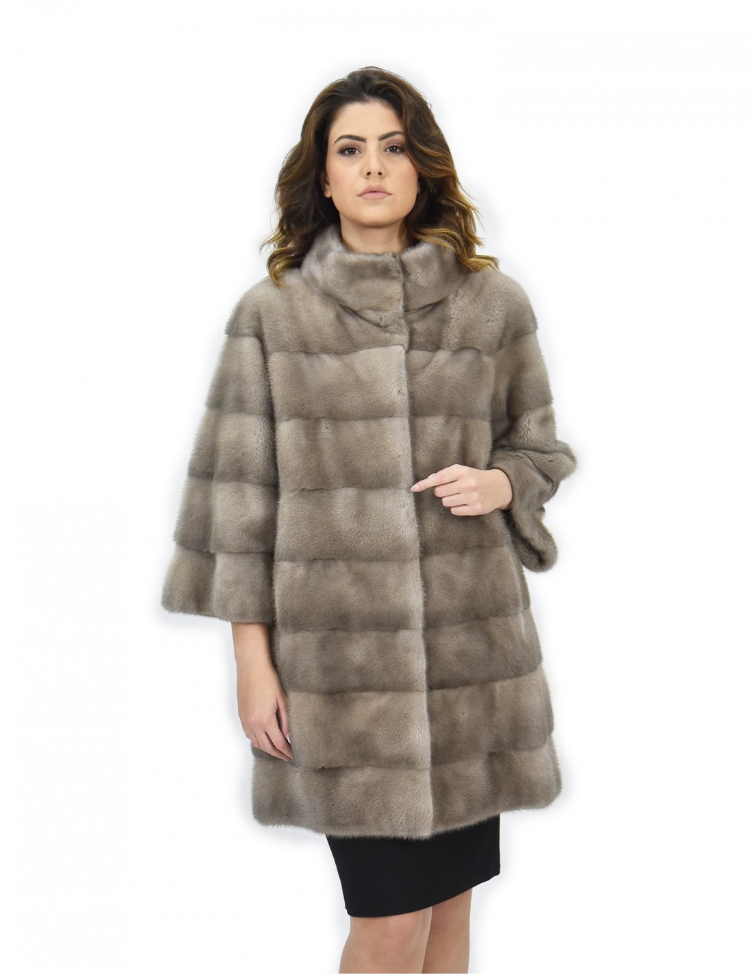 Mink coat with whole skins in horizontal processing. Our mink furs are productions made in our workshops, therefore a unique and exclusive mink coat. The possibility of producing our furs of the highest quality allows us to make proposals at different prices with various occasions at low prices always available. Furthermore, our laboratories and our collaborations guarantee a mink fur of undisputed quality 100% made in Italy. The quality of female mink fur used for this is a mink fur jacket with Saga Furs branded skins. The mink fur jacket comes with a beautiful pistagna collar, three-quarter sleeves, in mink fur, whole skins horizontal processing, silver blue color, 82 cm long, hook closure and normal external pockets.