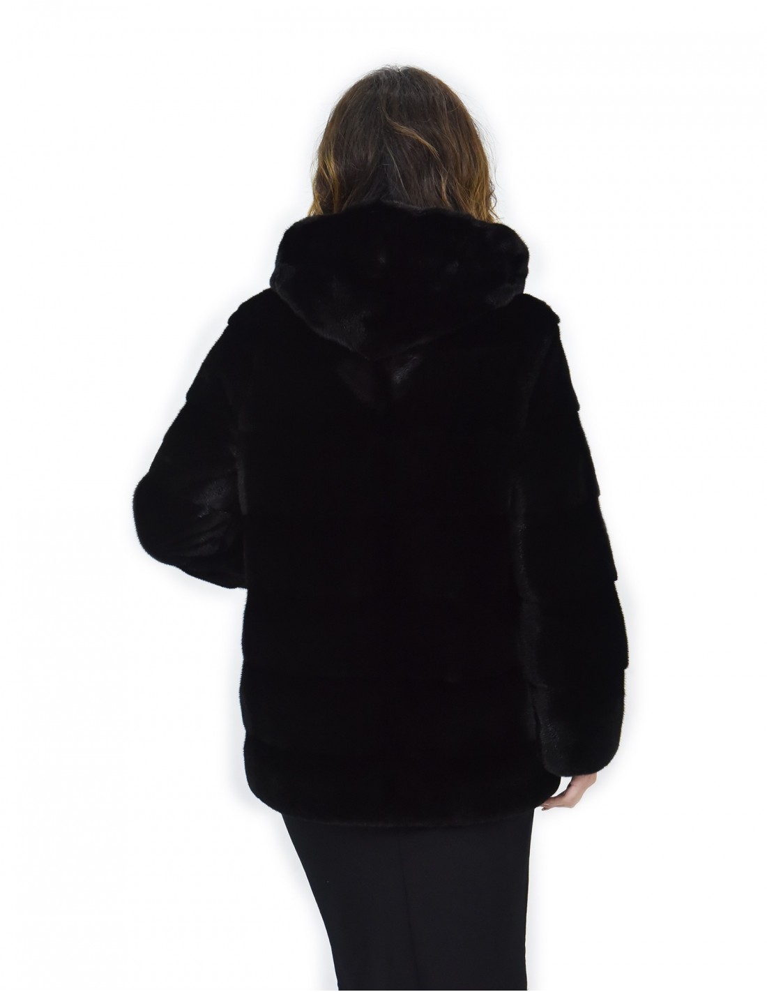 Mink coat with whole skins in horizontal processing. Our mink furs are made productions of our workshops, so a unique and exclusive mink coat. The ability to produce our furs of the highest quality allows us to make proposals at different prices with various occasions at low prices always available. In addition, our laboratories and our collaborations guarantee a mink fur of undisputed quality 100% made in italy. The quality of female mink fur used for this is a mink fur jacket with sighed saga furs. The black mink fur coat is 72 centimeters long with a beautiful hood lined in mink skins, long sleeve, mink fur, horizontal processing, closing hooks and normal outer pockets.