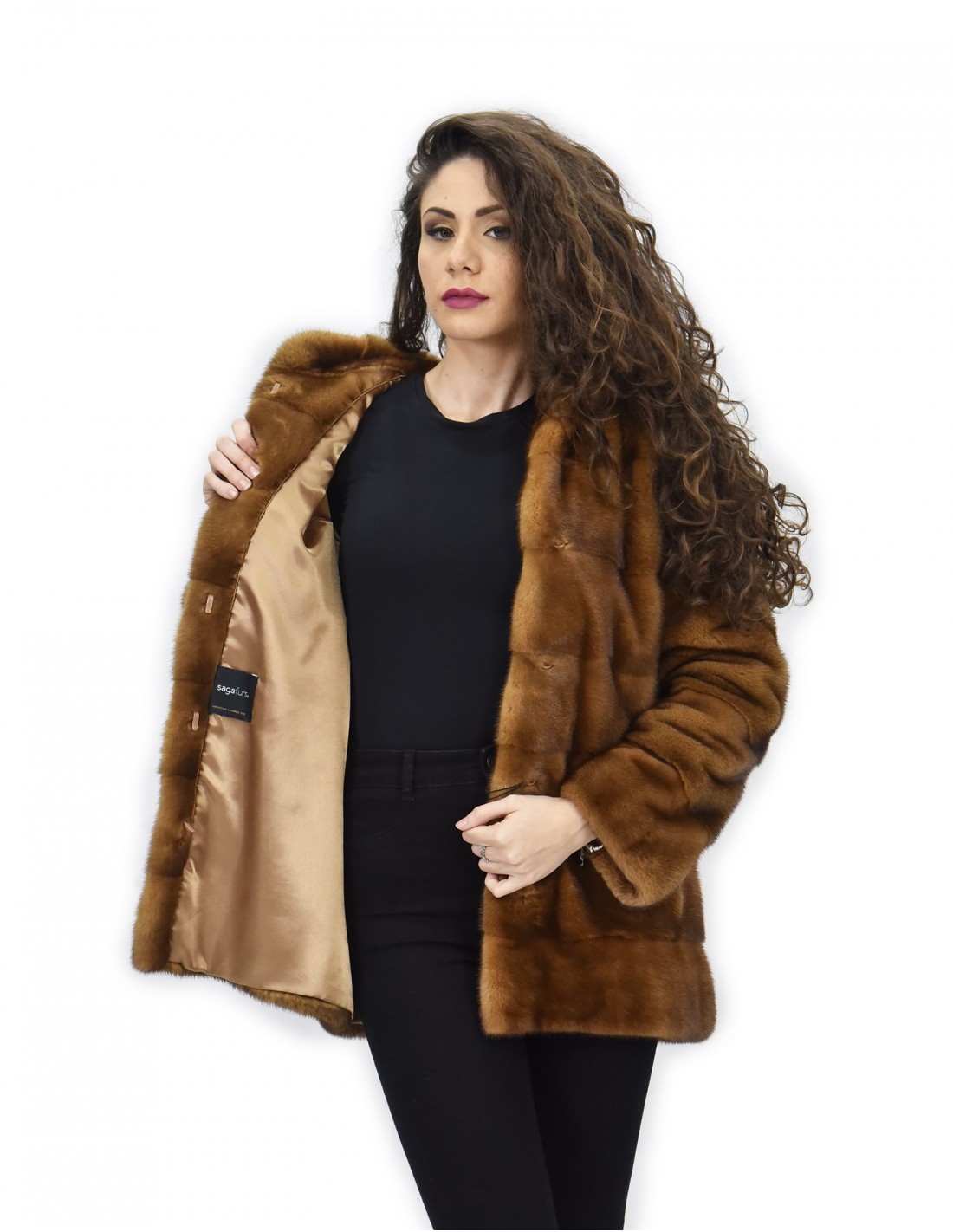 Mink coat with whole skins in horizontal processing. Our mink furs are made productions of our workshops, so a unique and exclusive mink coat. The ability to produce our furs of the highest quality allows us to make proposals at different prices with various occasions at low prices always available. In addition, our laboratories and our collaborations guarantee a mink fur of undisputed quality 100% made in italy. The quality of female mink fur used for this is a mink fur jacket with sighed saga furs. The golden-coloured mink fur coat is 72 centimeters long with a beautiful hood lined in mink skins, long sleeve, mink fur, horizontal processing, closing hooks and normal outer pockets.