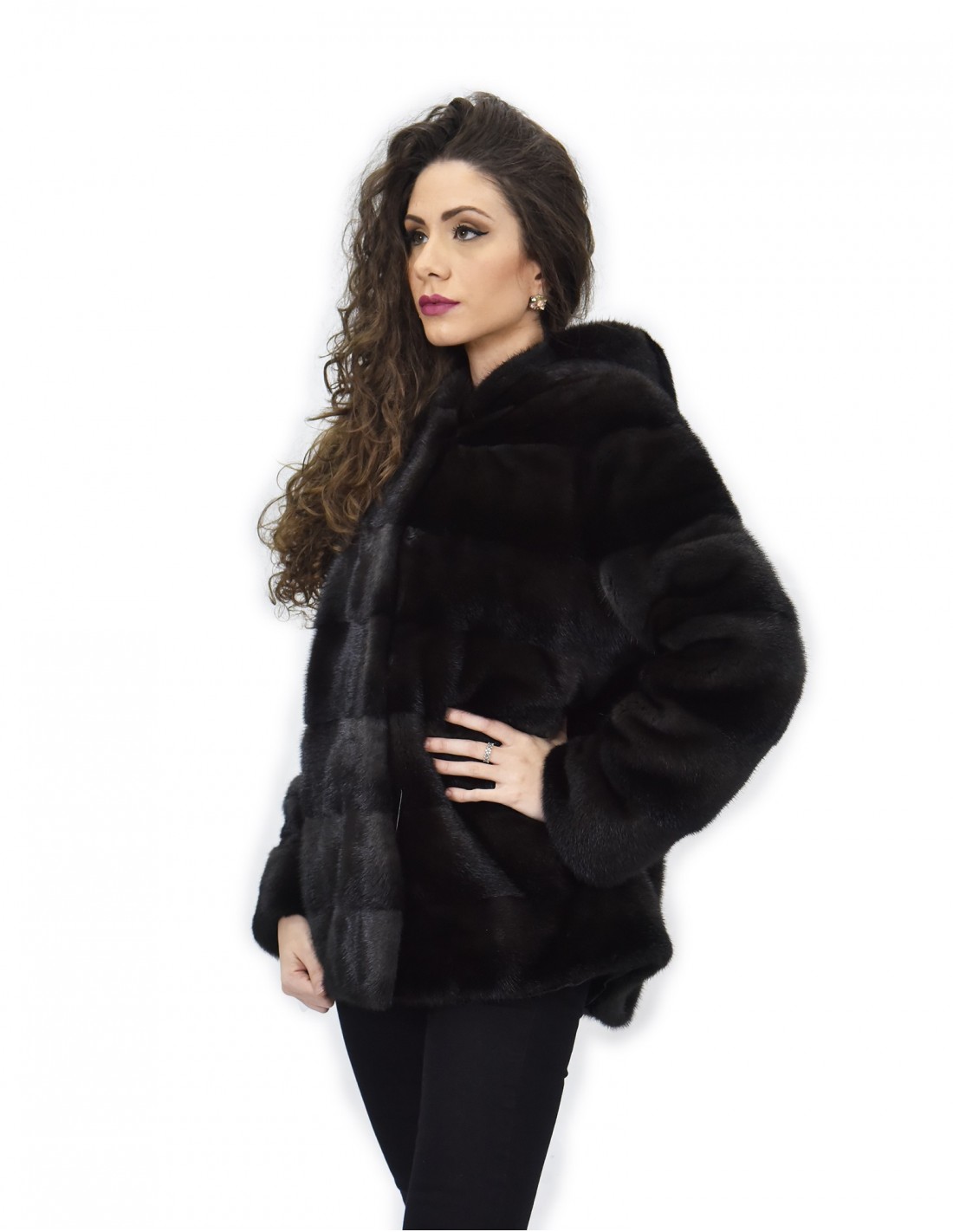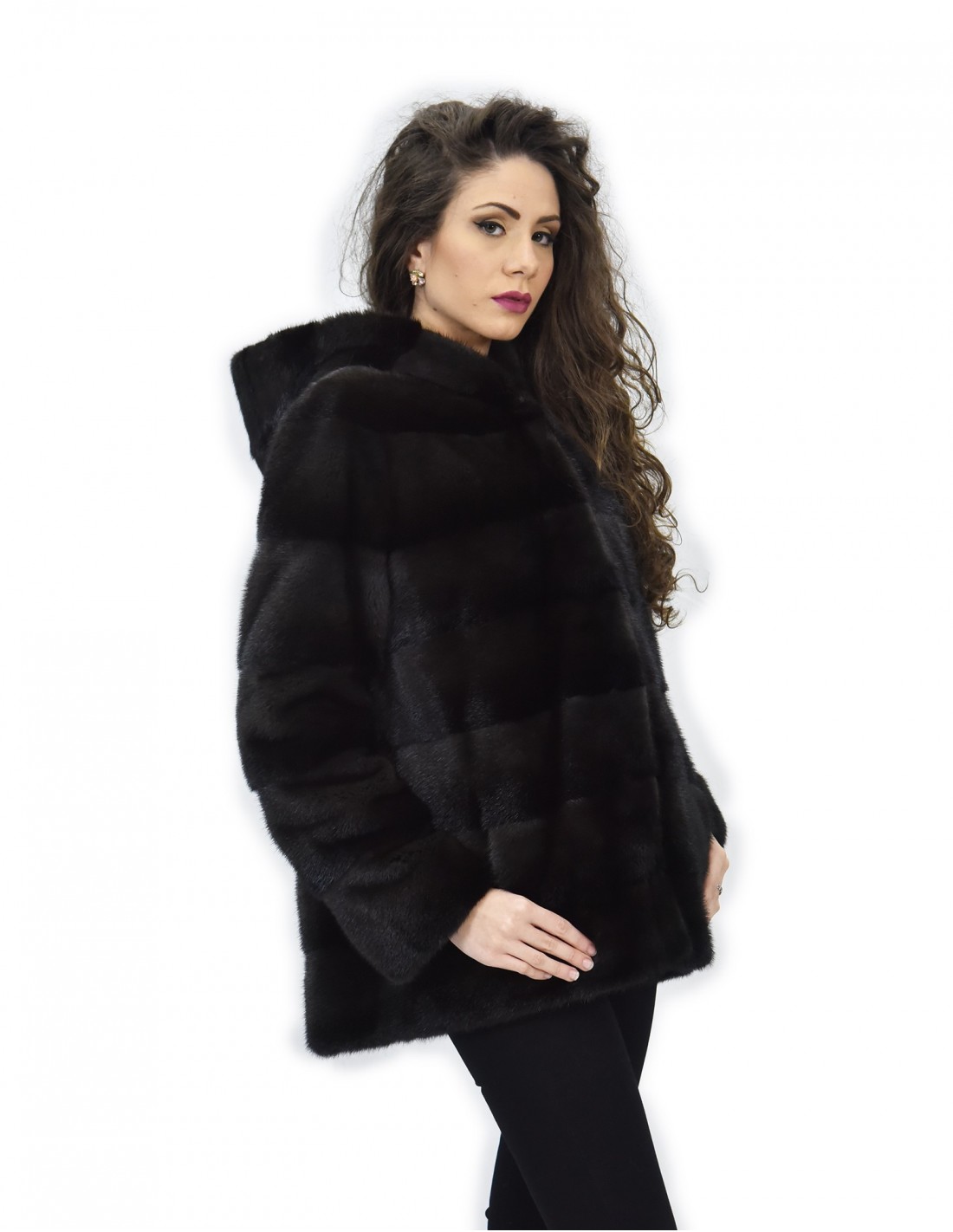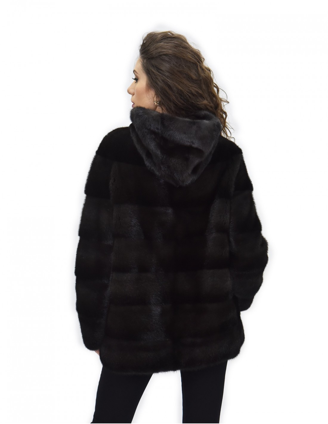 {Mink coat with whole skins in horizontal processing. Our mink furs are productions made in our workshops, therefore a unique and exclusive mink coat. The possibility of producing our furs of the highest quality allows us to make proposals at different prices with various occasions at low prices that are always available. Furthermore, our laboratories and our collaborations guarantee a mink fur of undisputed quality 100% made in Italy. The quality of female mink fur used for this is a mink fur jacket with Saga furs branded skins. The gray dorsed mink fur coat is 72 cm long with a beautiful hood lined in mink skins, long sleeves, in mink fur whole skins horizontal processing, hook closure and normal external pockets.
