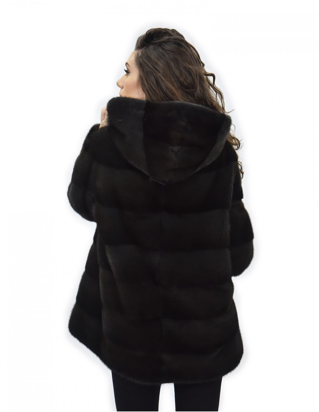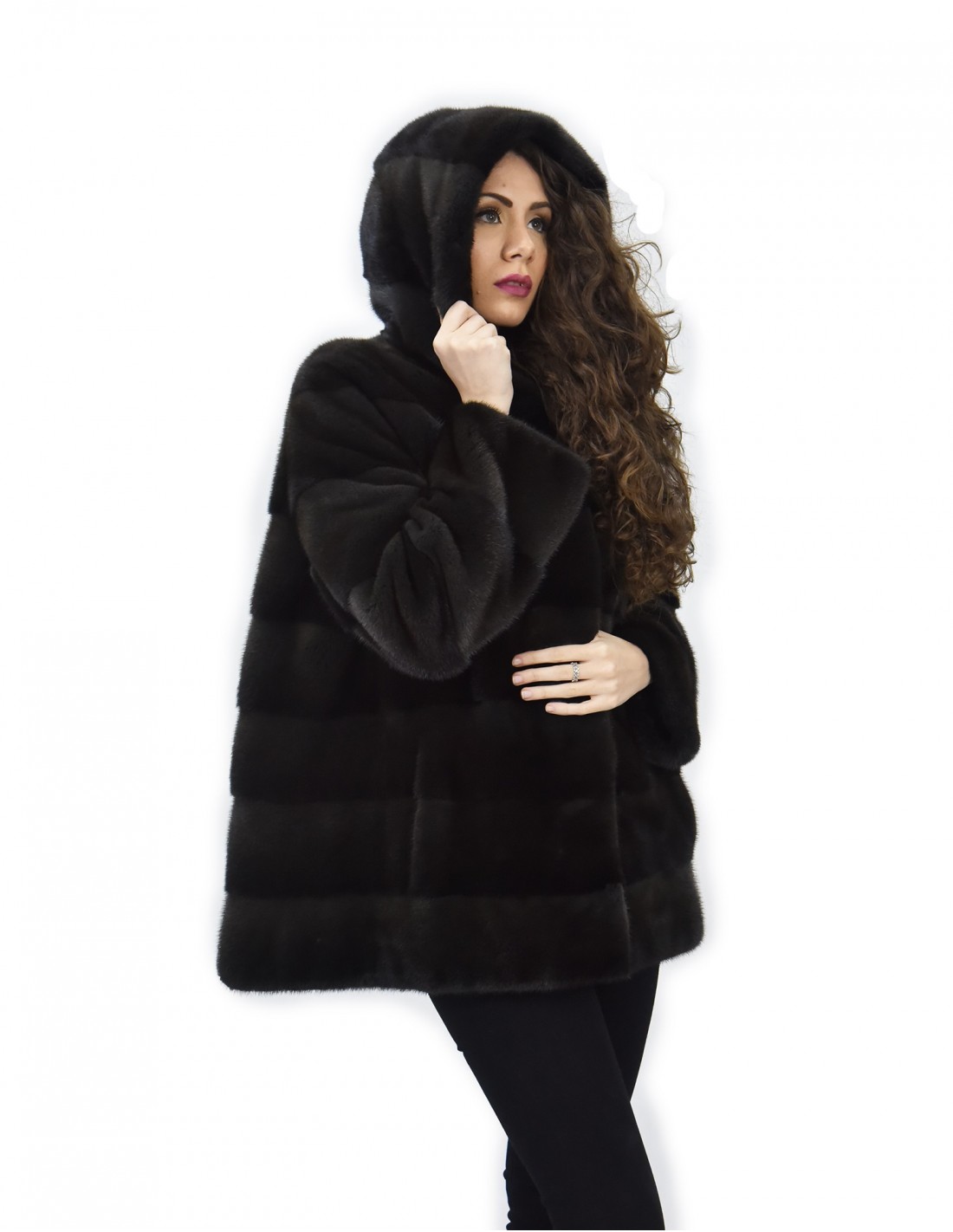 {Mink coat with whole skins in horizontal processing. Our mink furs are productions made in our workshops, therefore a unique and exclusive mink coat. The possibility of producing our furs of the highest quality allows us to make proposals at different prices with various occasions at low prices that are always available. Furthermore, our laboratories and our collaborations guarantee a mink fur of undisputed quality 100% made in Italy. The quality of female mink fur used for this is a mink fur jacket with Saga furs branded skins. The gray dorsed mink fur coat is 72 cm long with a beautiful hood lined in mink skins, long sleeves, in mink fur whole skins horizontal processing, hook closure and normal external pockets.