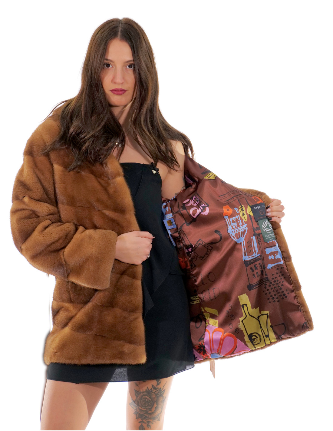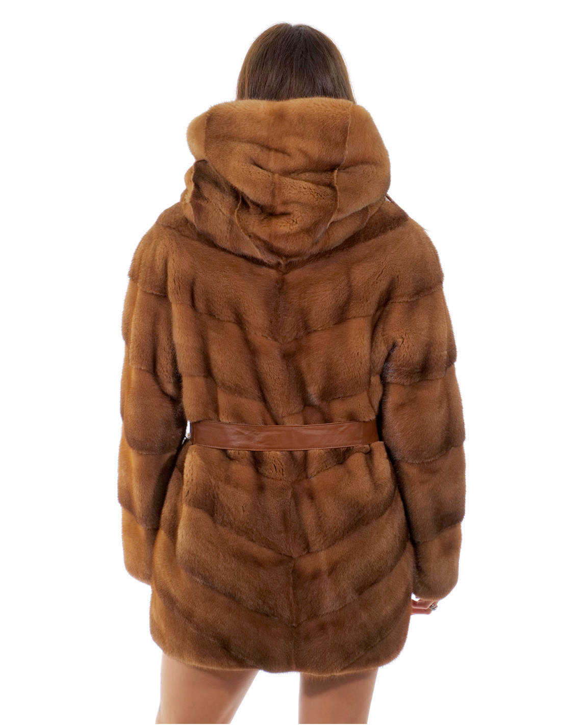 Mink fur coat with whole skins with horizontal processing. Our mink furs are productions made in our laboratories, therefore a unique and exclusive mink jacket. The possibility of producing our furs of the highest quality allows us to make proposals at different prices with various occasions at low prices always available. Furthermore, our laboratories and our collaborations guarantee a mink fur of undisputed quality 100% made in Italy. The quality of female mink fur used for this is a mink fur jacket with skins signed Saga furs. The mink fur jacket in horizontal processing is 82 centimeters long, long sleeve, closure with internal hooks, external leather belt at the waist, hood lined with mink skins and button at the neck, all in golden gold color.