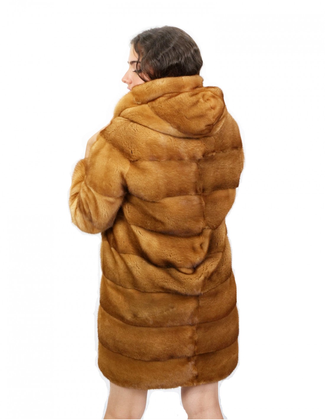 Coat 90 cm dark gold fur mink horizontal skins whole hood hooks external pockets