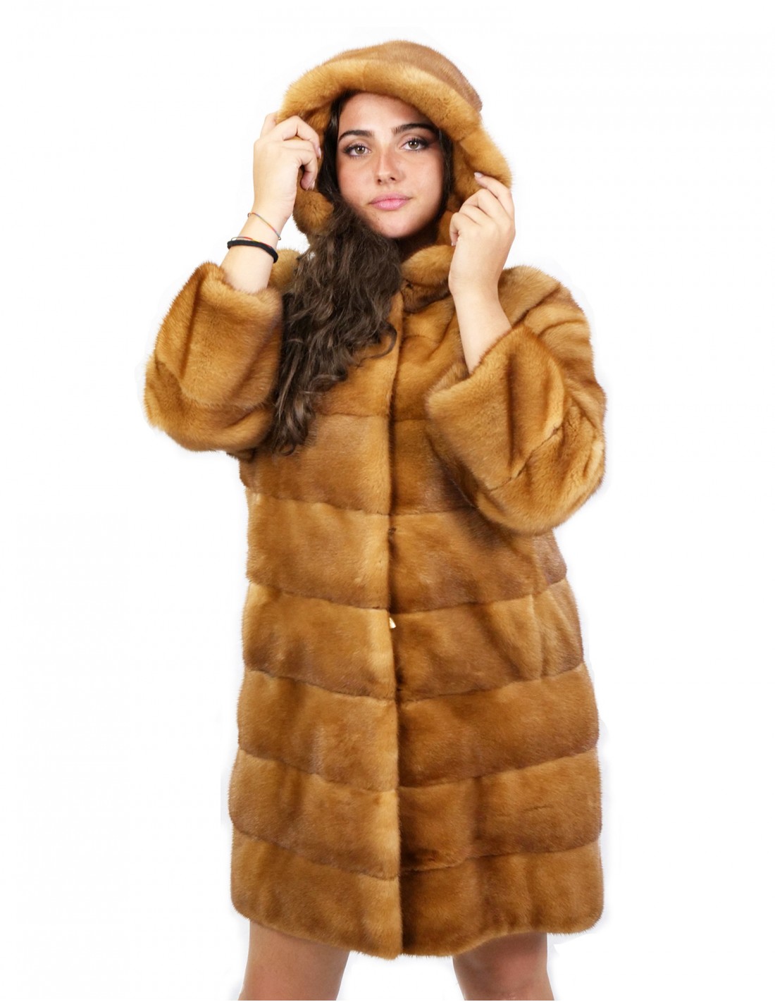 Mink coat with whole skins in horizontal processing. Our mink furs are productions made in our workshops, therefore a unique and exclusive mink coat. The possibility of producing our furs of the highest quality allows us to make proposals at different prices with various occasions at low prices always available. Furthermore, our laboratories and our collaborations guarantee a mink fur of undisputed quality 100% made in Italy. The quality of female mink fur used for this is a mink fur coat with InModa Pellicceria branded skins. The mink fur coat comes with whole skins in horizontal processing, with external pockets, hook closure and hood lined in mink skins, long sleeves, in dark gold color, 90 centimeters long.