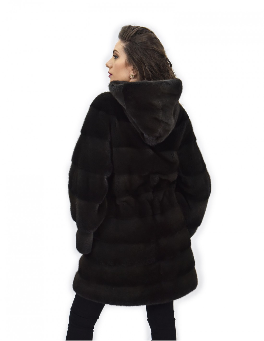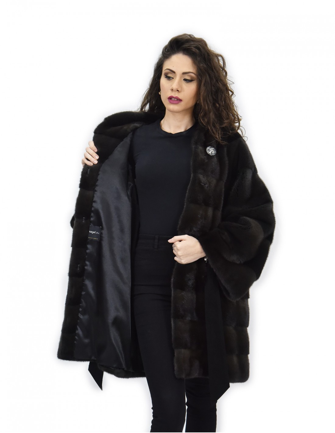 {Mink coat with whole skins in horizontal processing. Our mink furs are productions made in our workshops, therefore a unique and exclusive mink coat. The possibility of producing our furs of the highest quality allows us to make proposals at different prices with various occasions at low prices that are always available. Furthermore, our laboratories and our collaborations guarantee a mink fur of undisputed quality 100% made in Italy. The quality of female mink fur used for this is a mink fur jacket with Saga Furs branded skins. The Aurora color mink fur coat is 86 cm long with a beautiful hood lined in mink skins, long sleeves, in mink fur whole skins horizontal processing, hook closure, button on the collar and belt in suede, normal external pockets .