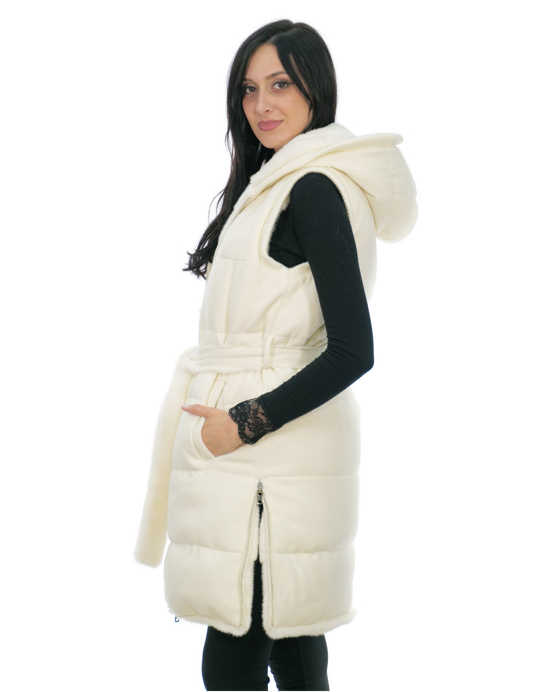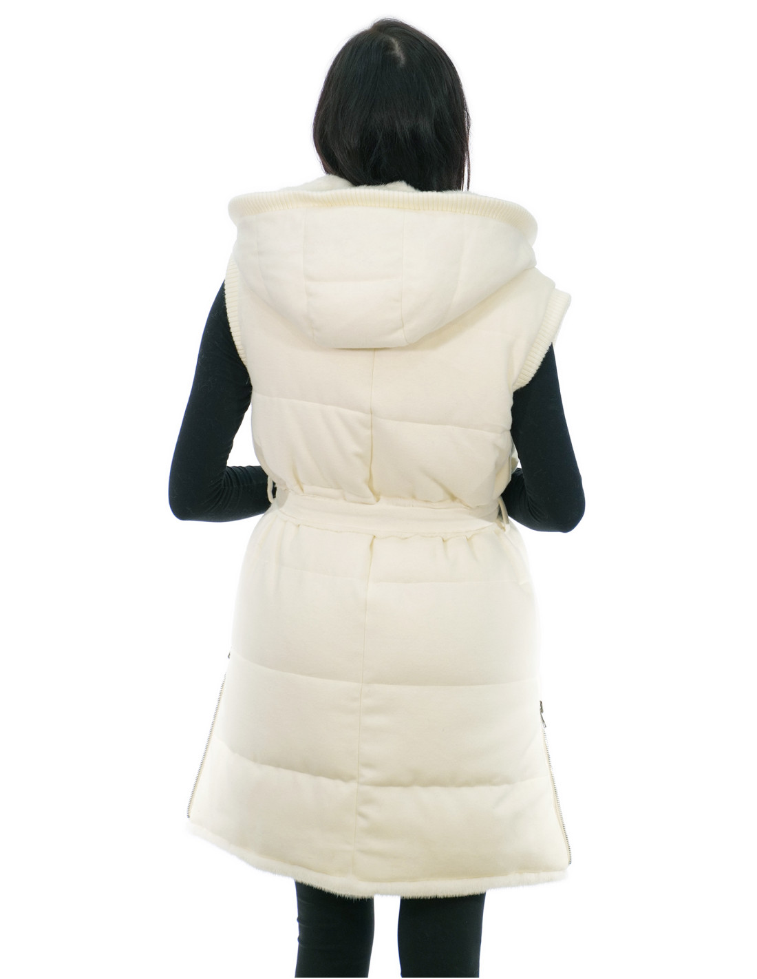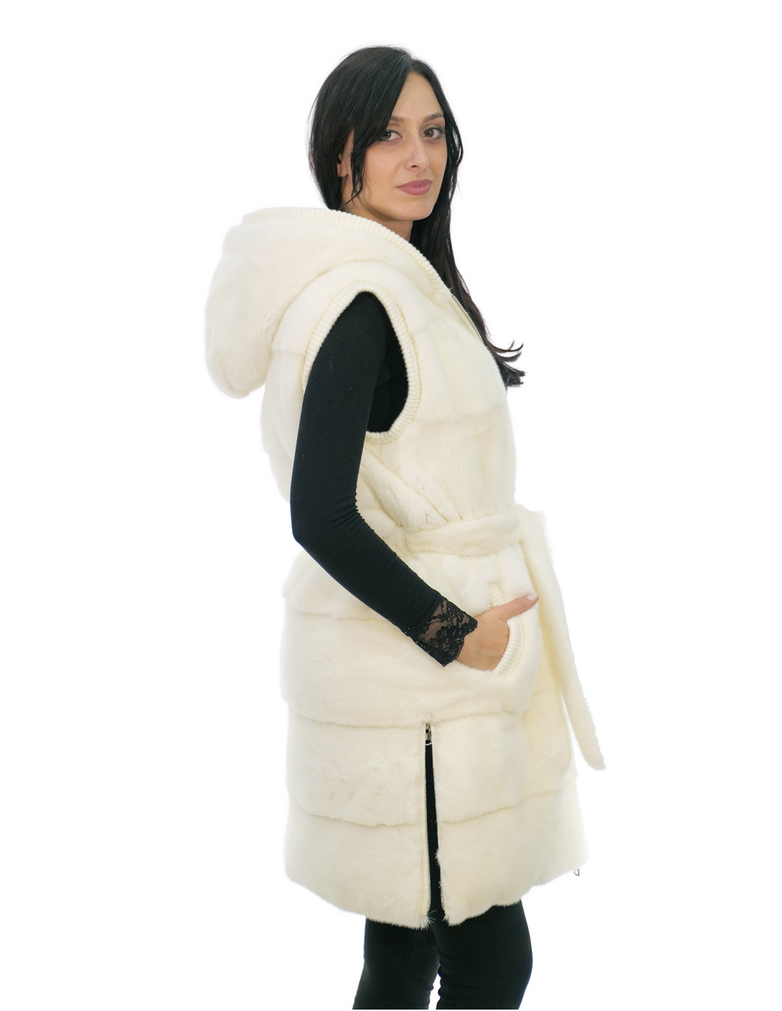 Reversible mink fur vest with whole skins with horizontal workmanship and wool. Our mink furs are productions made in our laboratories, therefore a unique and exclusive mink vest. The possibility of producing our furs of the highest quality allows us to make proposals at different prices with various occasions at low prices always available. Furthermore, our laboratories and our collaborations guarantee a mink fur of undisputed quality 100% made in Italy. The quality of female mink fur used for this is a mink fur jacket with skins signed Kopenaghen Furs. The reversible mink fur vest in horizontal workmanship and wool, 90 centimeters long, has external side pockets, zip closure, wool-lined hood, internal pocket, side slits with zip, completely reversible, fur and wool belt, all in cream white.