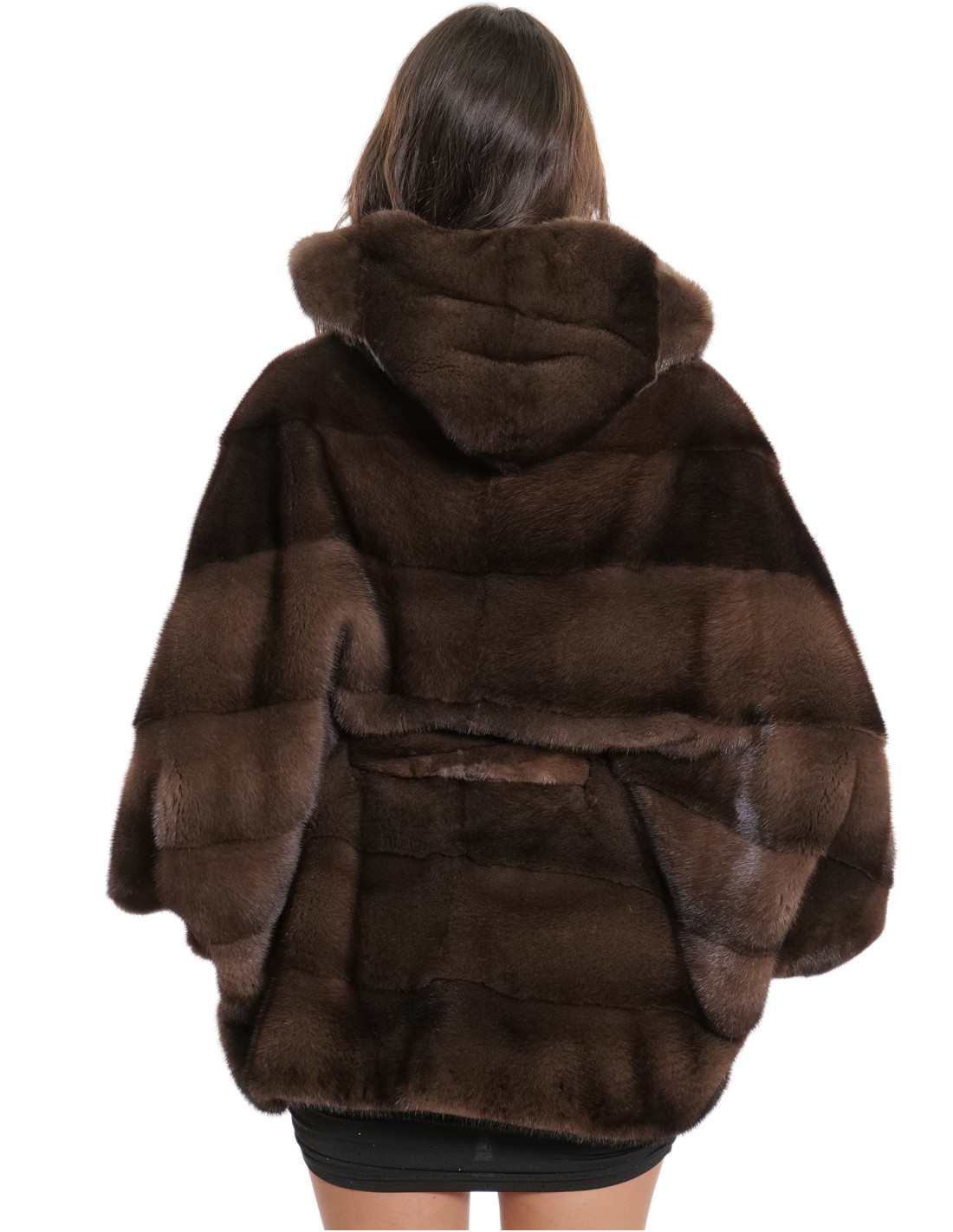 Mink cape with horizontal whole skins. Our mink furs are productions made in our laboratories, therefore a unique and exclusive mink jacket. The possibility of producing our furs of the highest quality allows us to make proposals at different prices with various opportunities at low prices always available. Furthermore, our laboratories and our collaborations guarantee a mink fur of undisputed quality, 100% made in Italy. The quality of female mink fur used for this is a mink fur jacket with Saga Furs branded pelts. The horizontally crafted mink fur cape is 72 centimeters long, 3/4 sleeves, closure with internal hooks and hood lined with demi buff colored mink skins with fur belt at the waist.