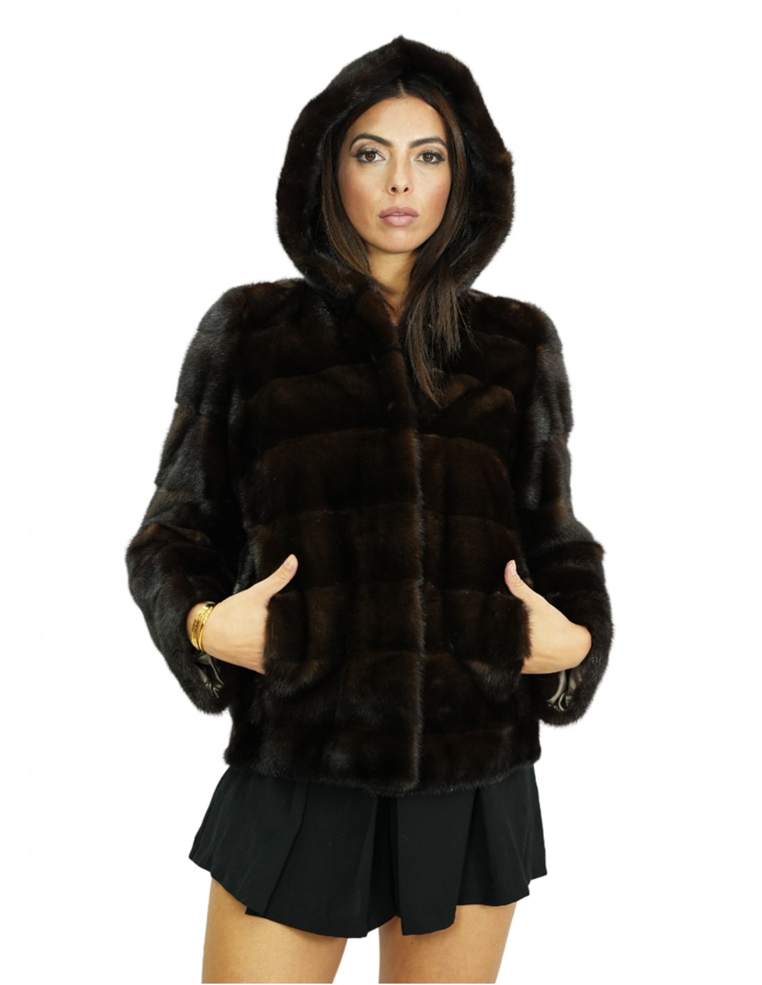 Horizontal full-skin mink fur jacket in mahogany color with fur-lined hood. Our mink furs are productions made in our laboratories, therefore a unique and exclusive mink jacket. The possibility of producing our furs of the highest quality allows us to make proposals at different prices with various opportunities at low prices always available. Furthermore, our laboratories and our collaborations guarantee a mink fur of undisputed quality, 100% made in Italy. The quality of female mink fur used for this is a mink fur jacket with skins signed In Moda furs. The mink fur jacket in horizontal processing is 66 centimeters long, long sleeves, closure with internal hooks and hood lined with mahogany mink skins.