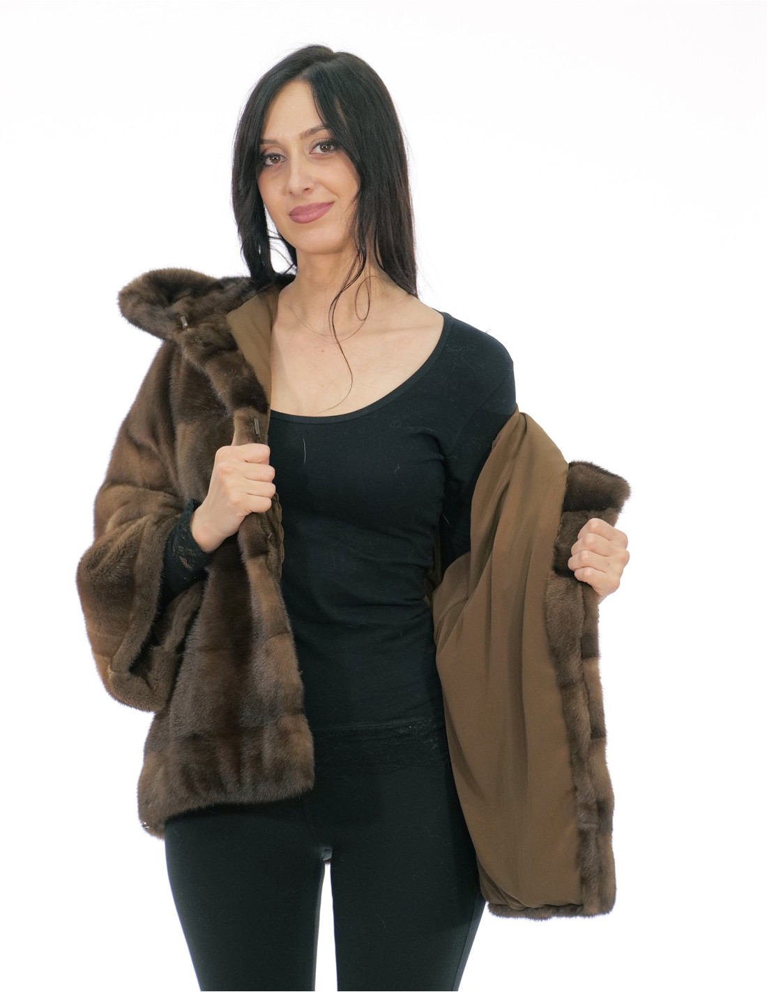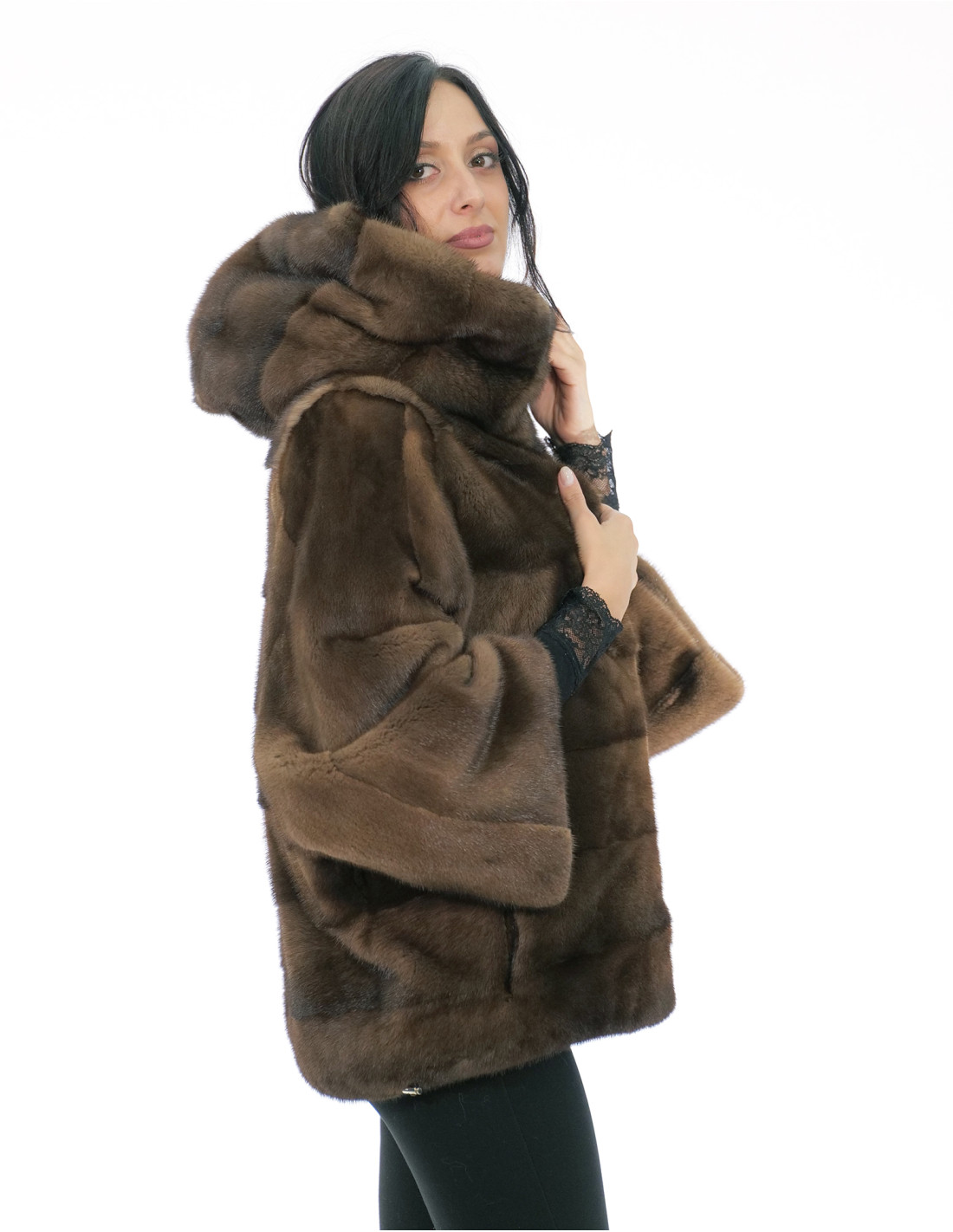 Full-skin mink fur coat with horizontal workmanship on the bust and full-skin sleeves. Our mink furs are products made in our laboratories, therefore a unique and exclusive mink jacket. The possibility of producing our furs of the highest quality allows us to make proposals at different prices with various occasions at low prices always available. Furthermore, our laboratories and our collaborations guarantee a mink fur of undisputed quality 100% made in Italy. The quality of female mink fur used for this is a mink fur jacket with skins signed Saga furs. The mink fur jacket with horizontal workmanship on the back and full skin on the sleeves, 62 centimeters long, comes with external side pockets, hook closure, hood lined with mink skins, all in demi buff color.