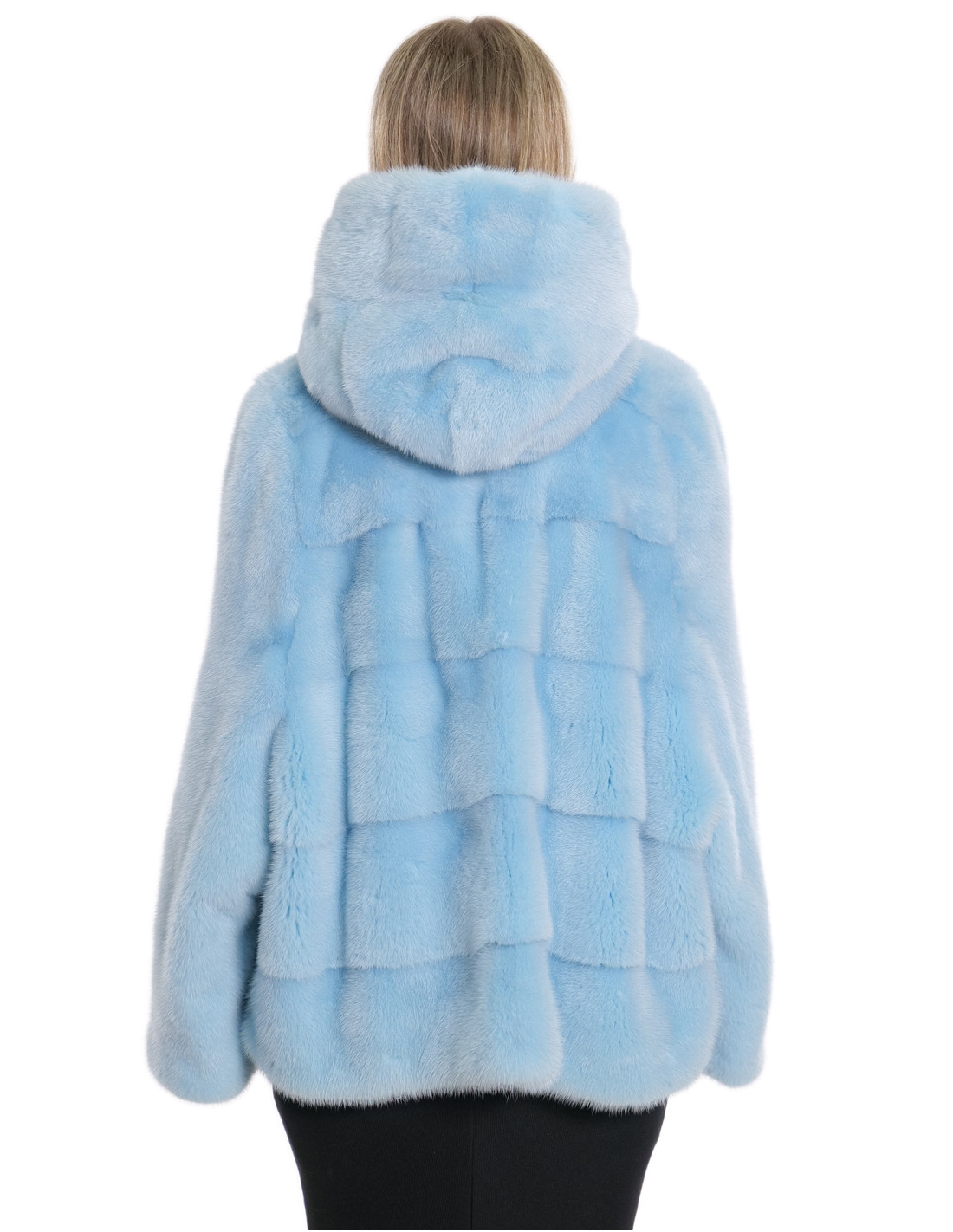 Horizontal full-skin mink jacket with full-skin sleeves. Our mink furs are productions made in our laboratories, therefore a unique and exclusive mink jacket. The possibility of producing our furs of the highest quality allows us to make proposals at different prices with various opportunities at low prices always available. Furthermore, our laboratories and our collaborations guarantee a mink fur of undisputed quality, 100% made in Italy. The quality of female mink fur used for this is a mink fur jacket with Saga Furs branded pelts. The horizontally crafted mink fur jacket with full skin sleeves, 58 centimeters long, features external pockets, hook closure and hood with mink fur also internally, three-quarter sleeves, all in light blue aquamarine colour.