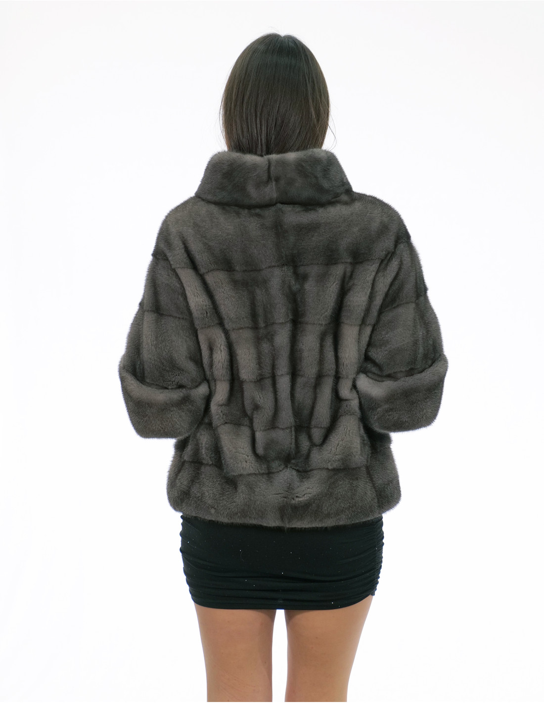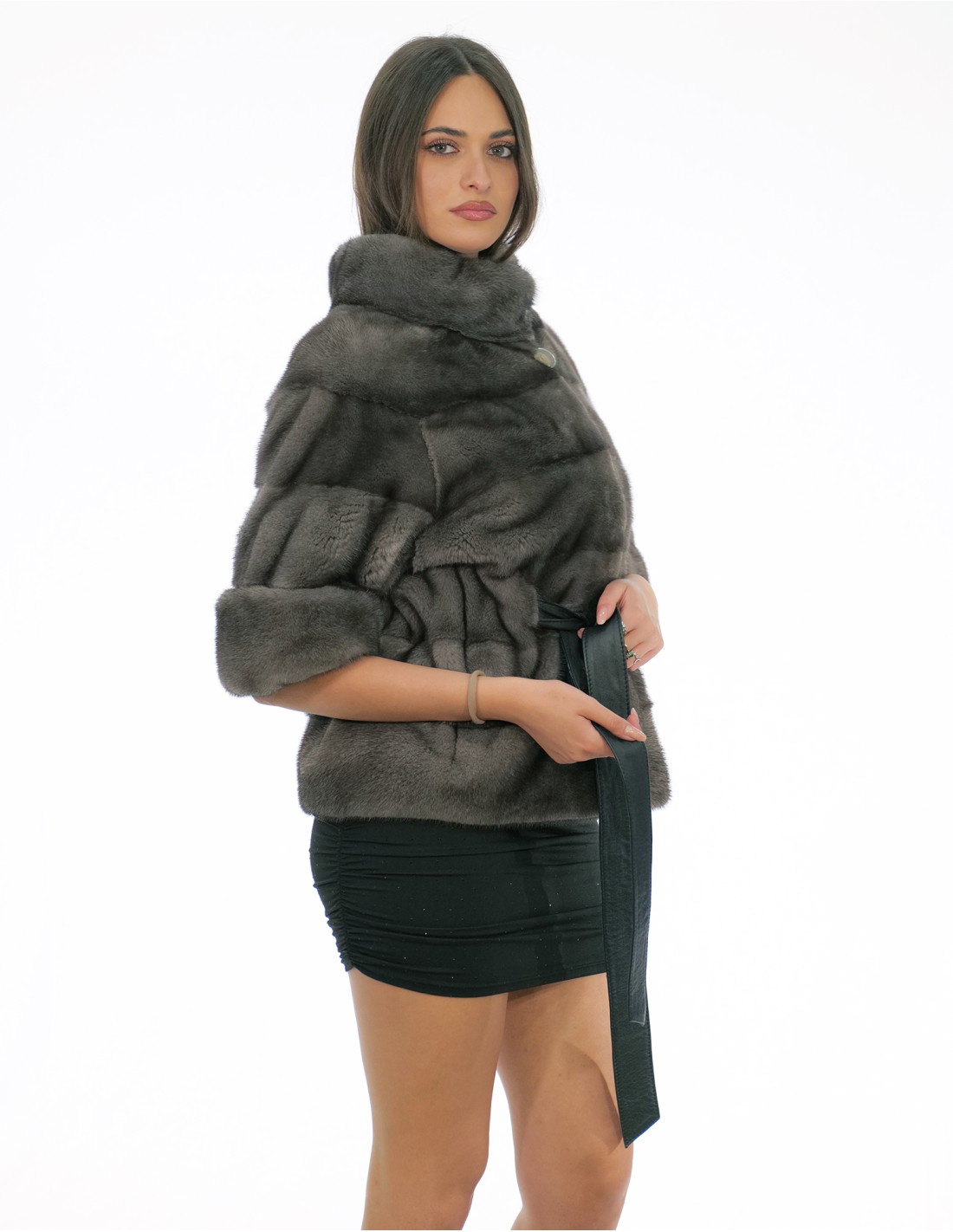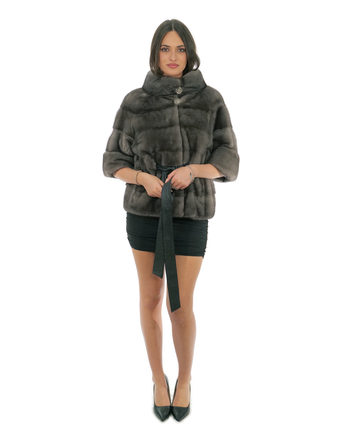 Home » Shop » Mink fur jacket blue iris 46 grey with half sleeve belt inner leather waist pistagna collar with button
